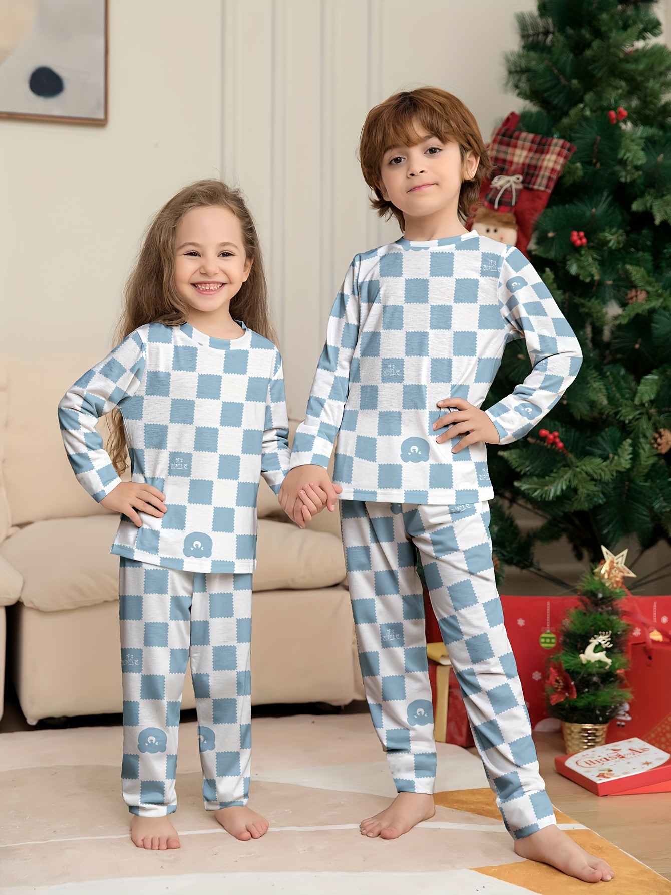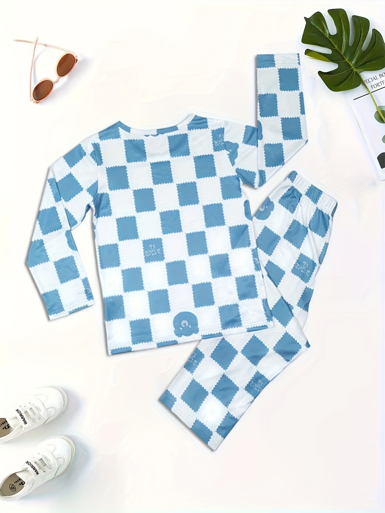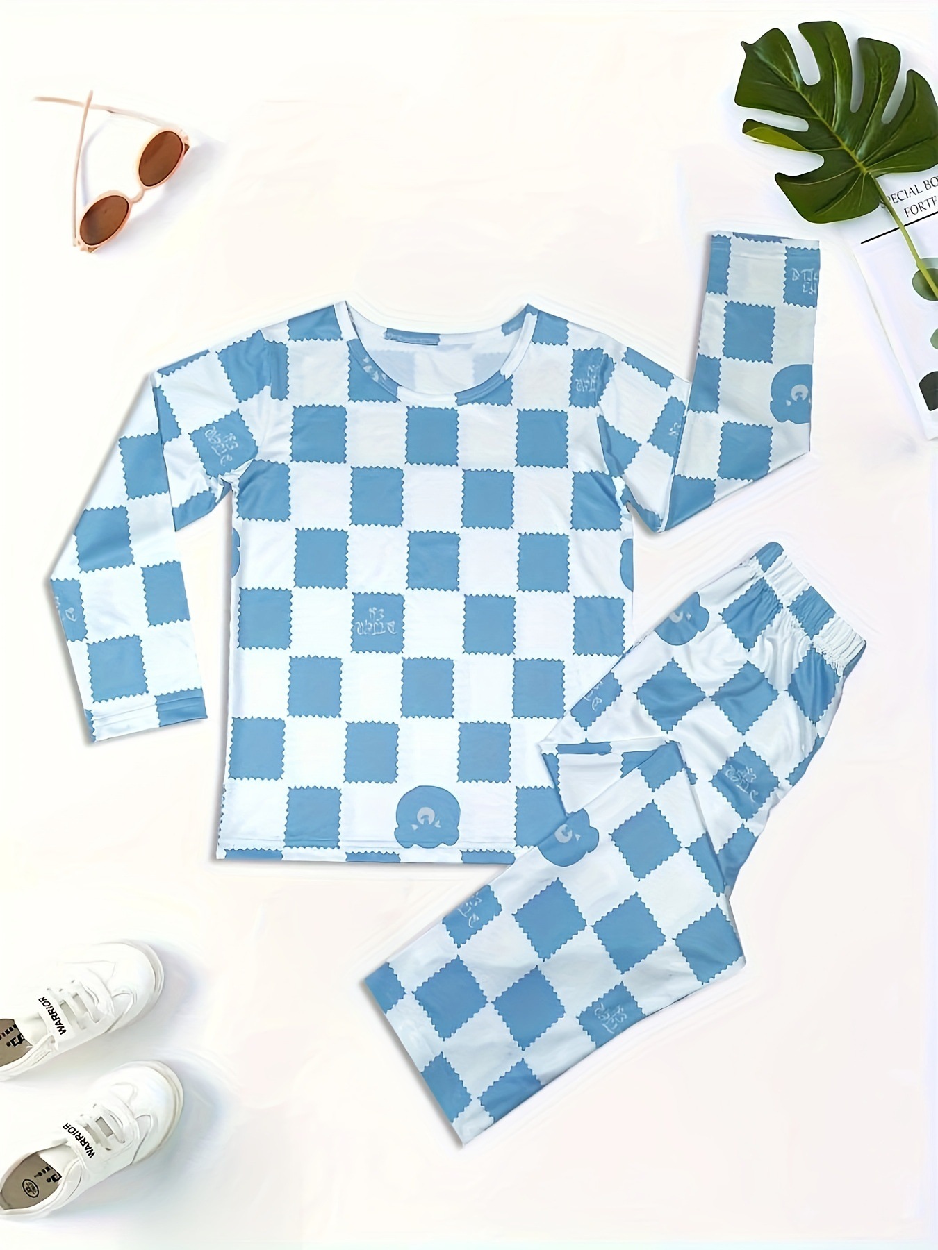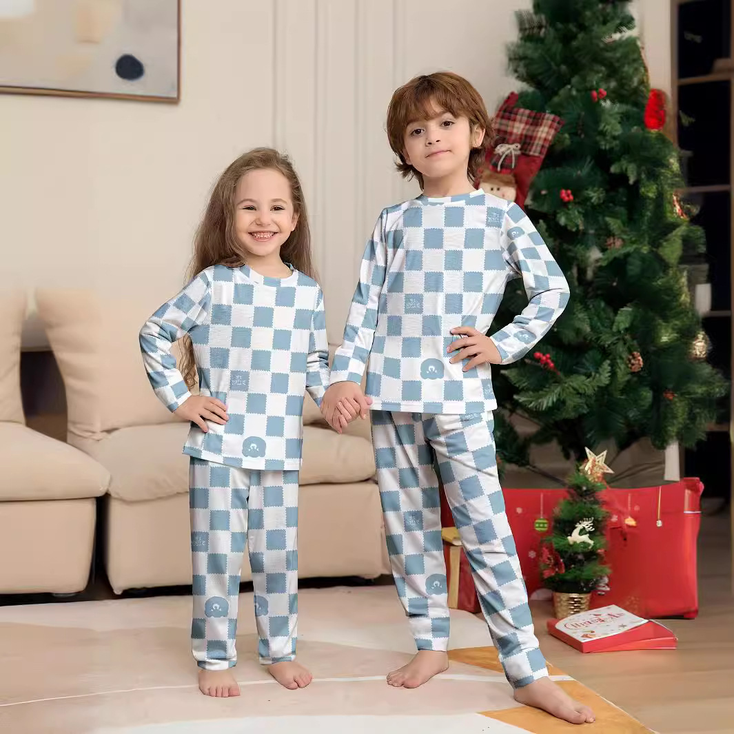어린이 잠옷 아기의 파란색과 흰색 격자 무늬 인쇄 한국식 세균성 소년의 홈 옷 긴 소매 속옷 세트스토어 가기