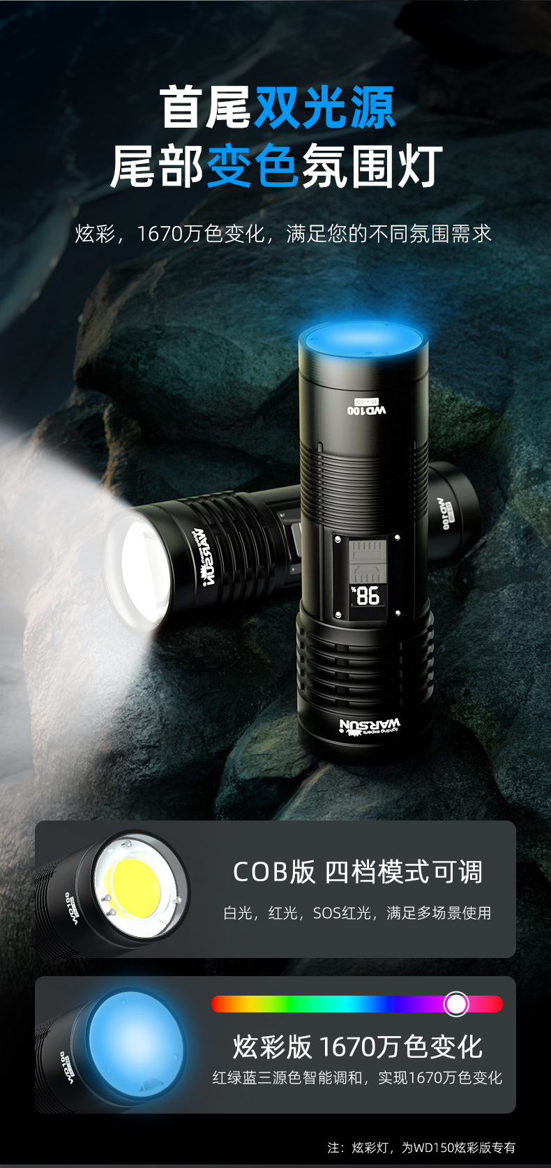 • WD100 다채로운 50w 백색 레이저/2000 m 장거리/내구성 18-20h/8400 mA/충전 된 보물/색상 변경 꼬리 램프