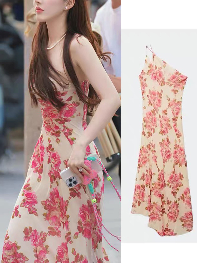 Ruth Zhao Xu Yan의 같은 스타일의 고급 비스듬한 어깨 꽃 끈 원피스 틈새 기질 부드러운 휴가 원피스스토어 가기