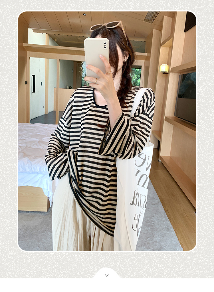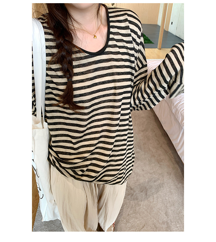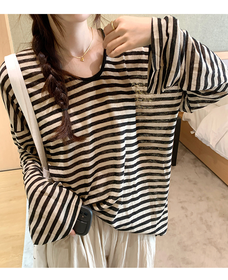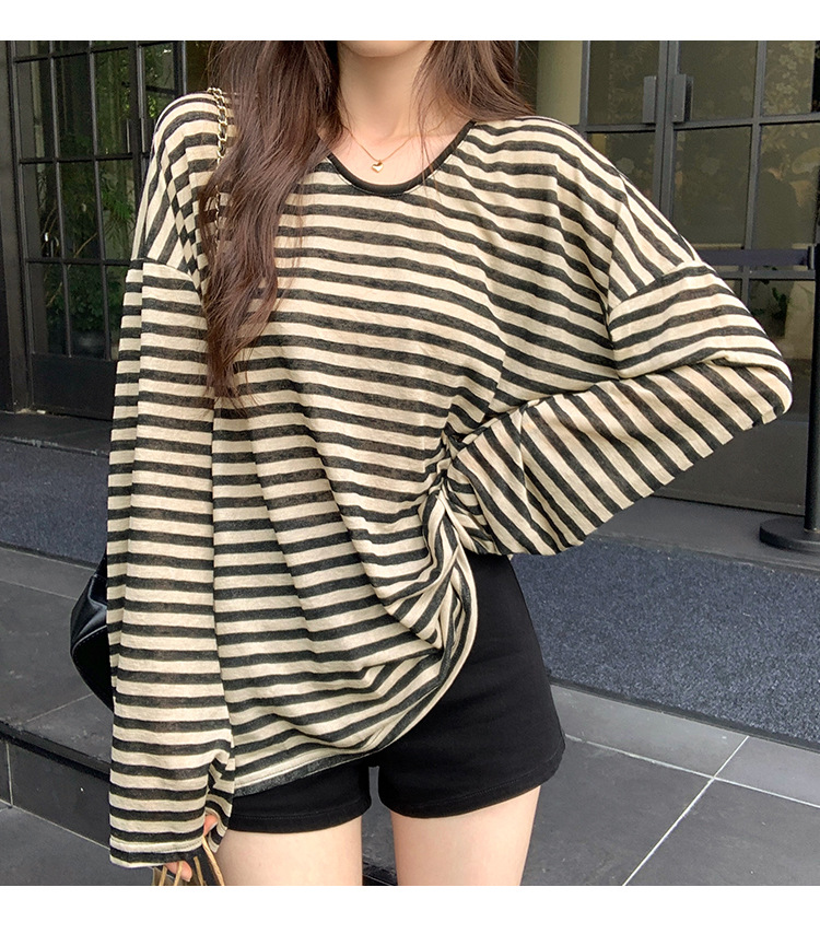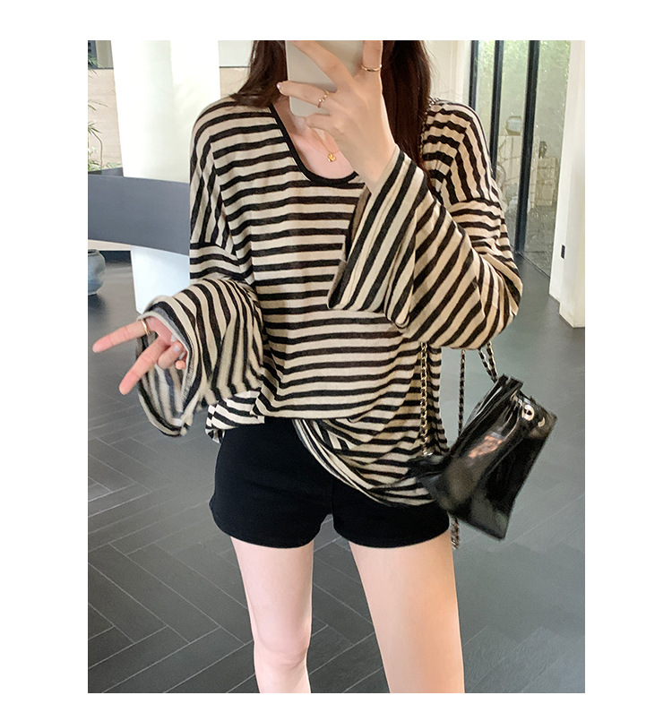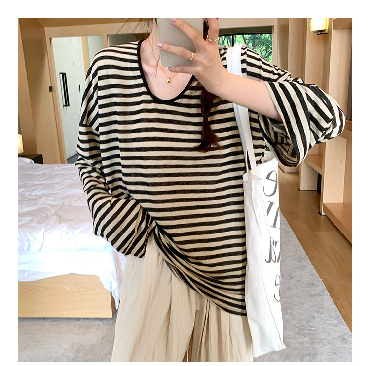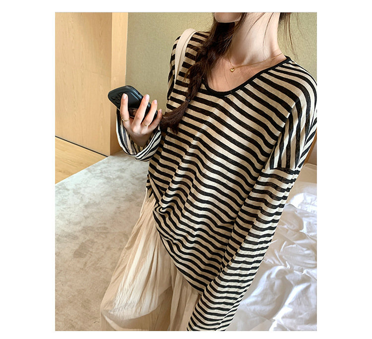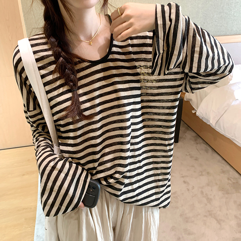수평 줄무늬 U-목 느슨한 게으른 태양 보호 셔츠 얇은 긴 소매 티셔츠 2024 새로운 캐주얼 올 매치 미드 롱 탑