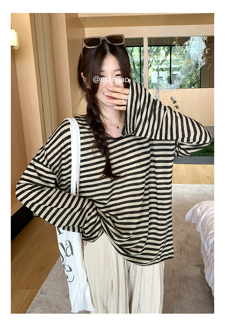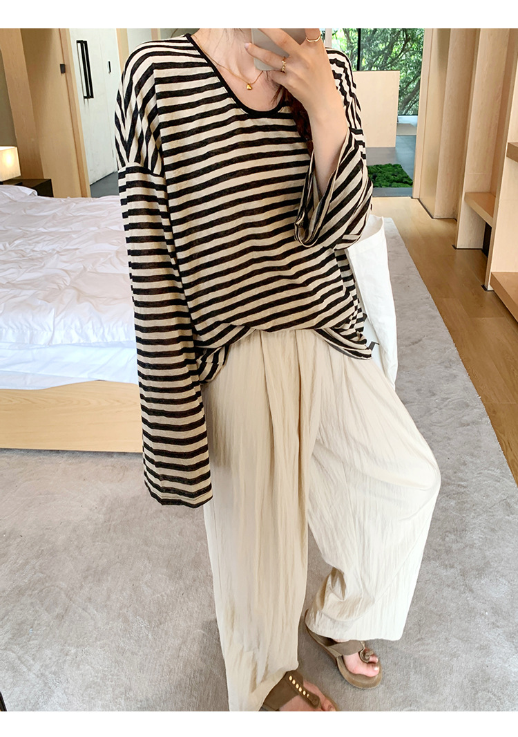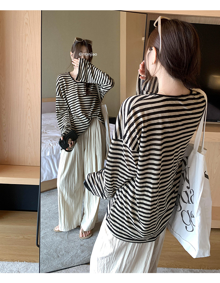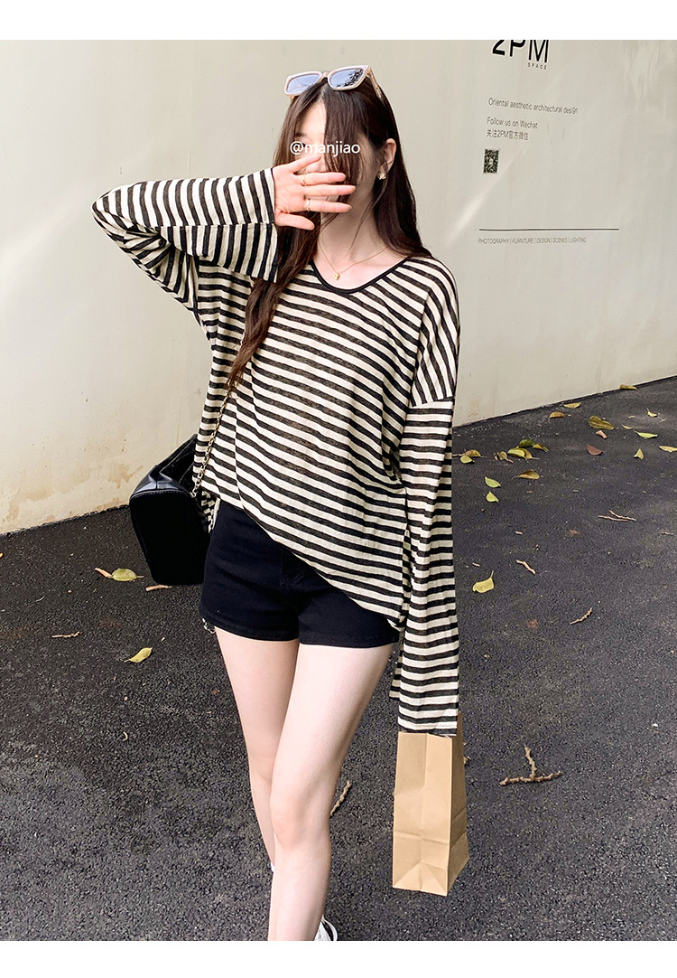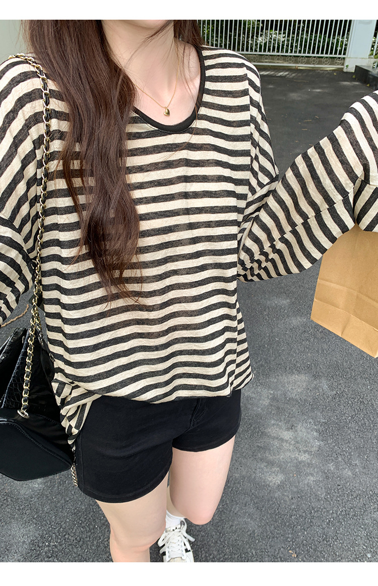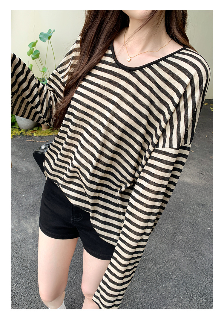 수평 줄무늬 U-목 느슨한 게으른 태양 보호 셔츠 얇은 긴 소매 티셔츠 2024 새로운 캐주얼 올 매치 미드 롱 탑