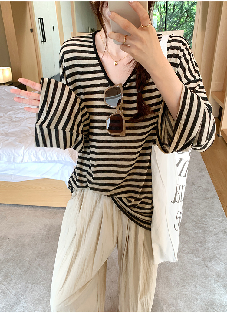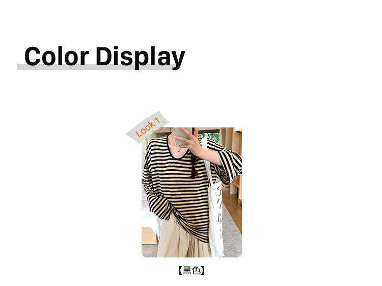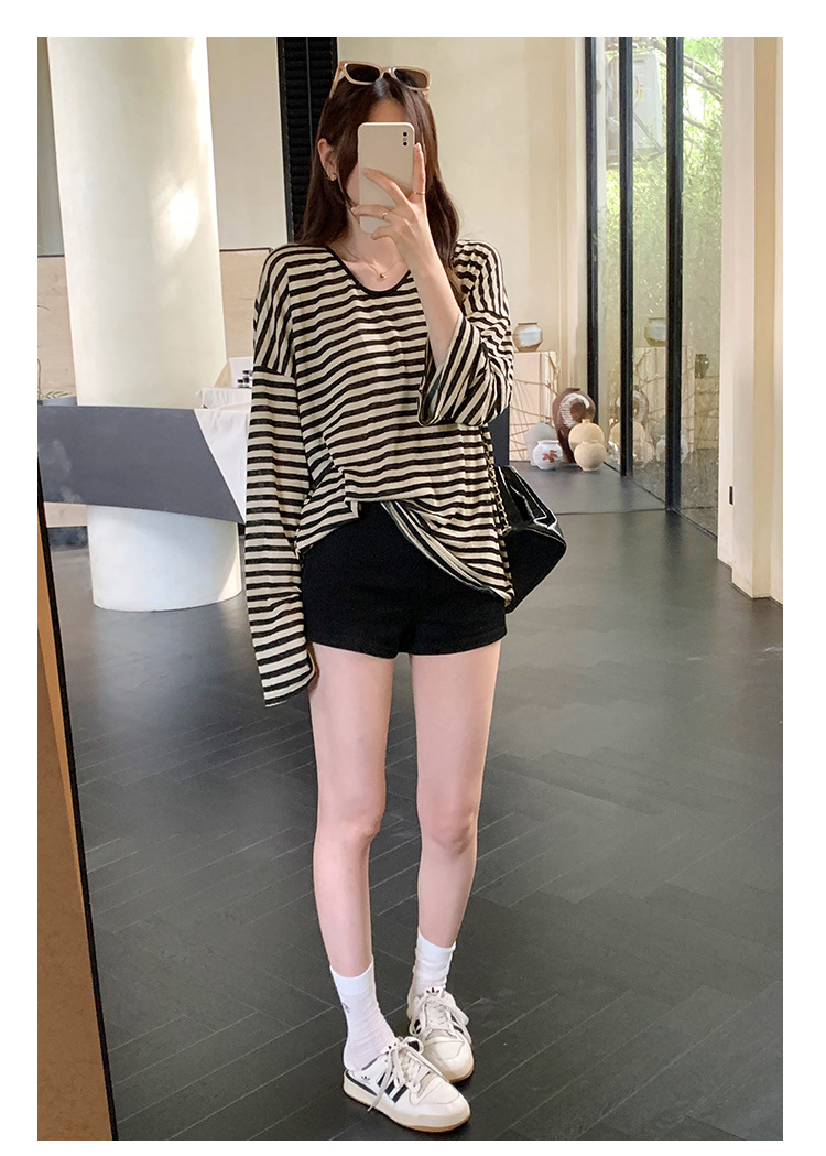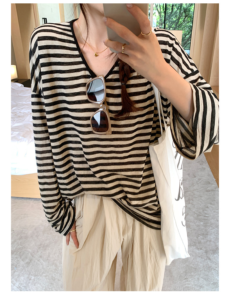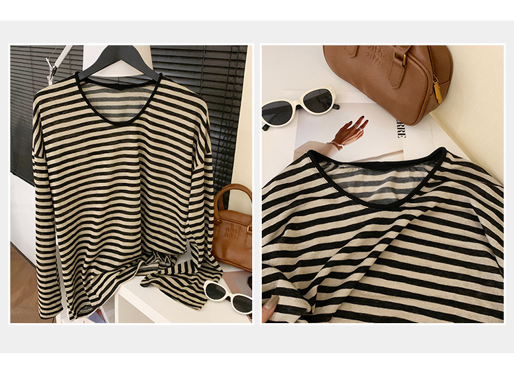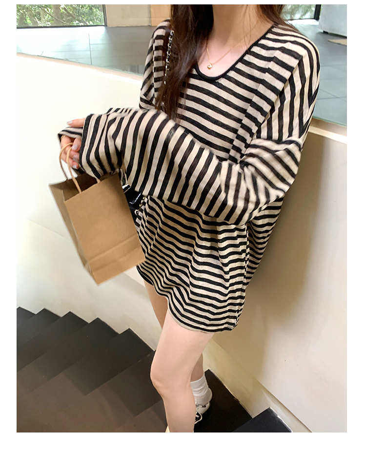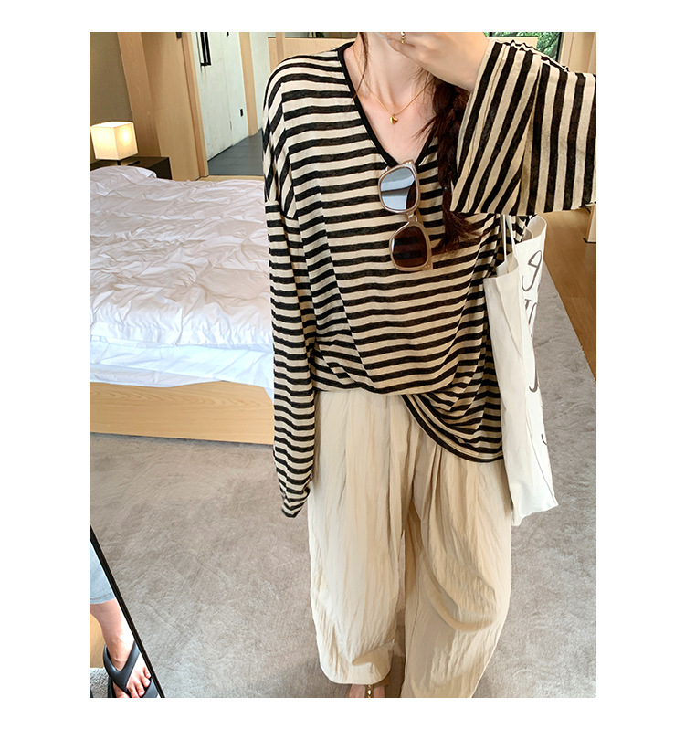 수평 줄무늬 U-목 느슨한 게으른 태양 보호 셔츠 얇은 긴 소매 티셔츠 2024 새로운 캐주얼 올 매치 미드 롱 탑