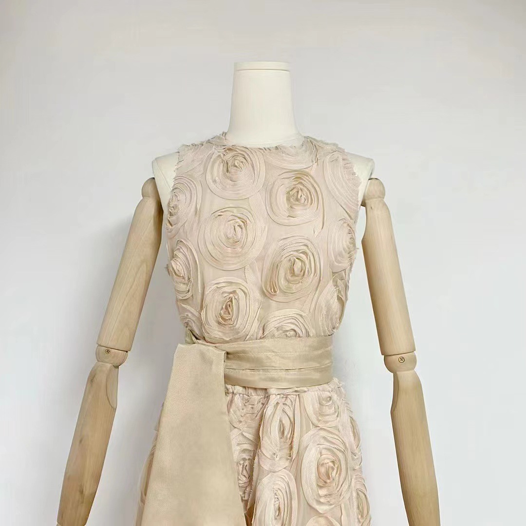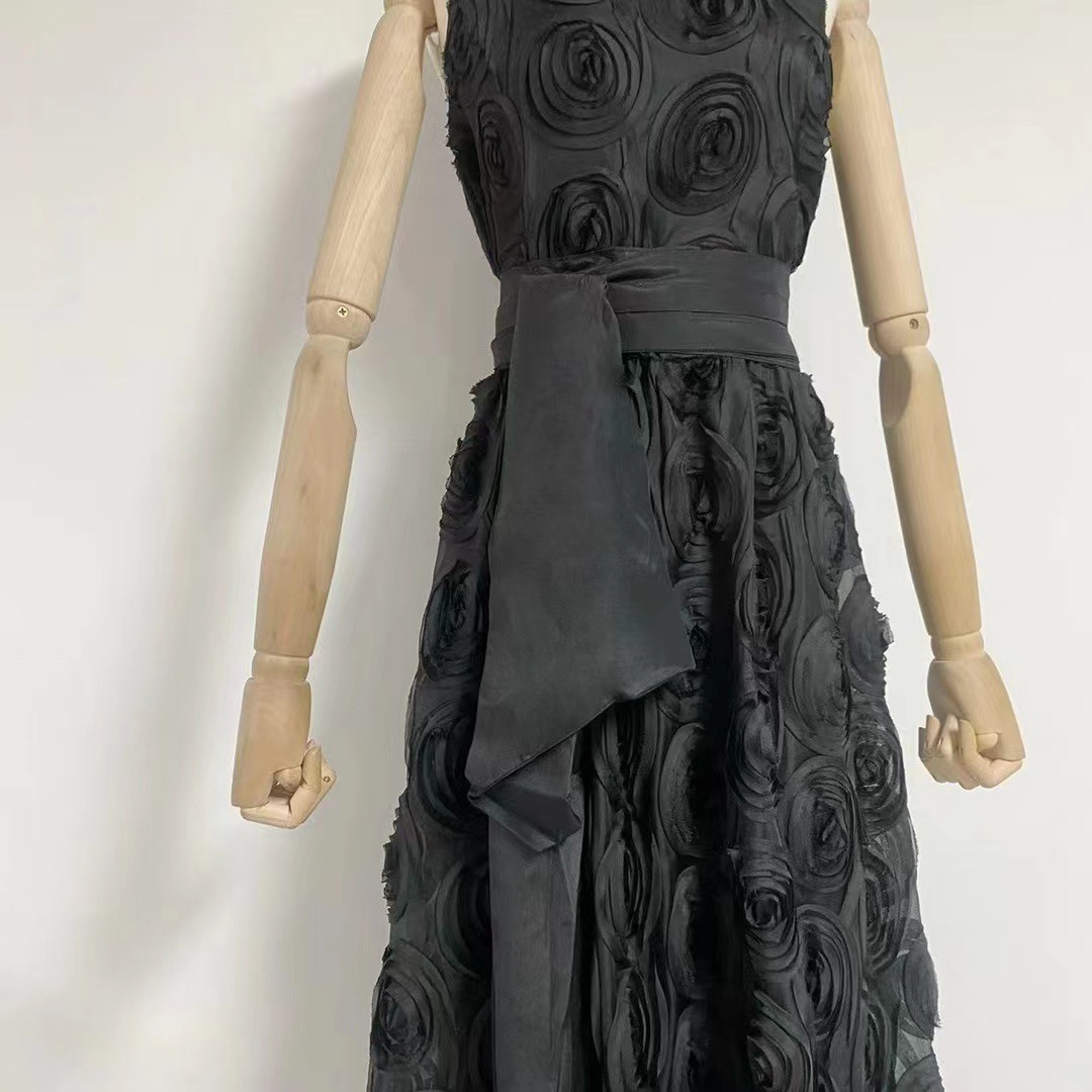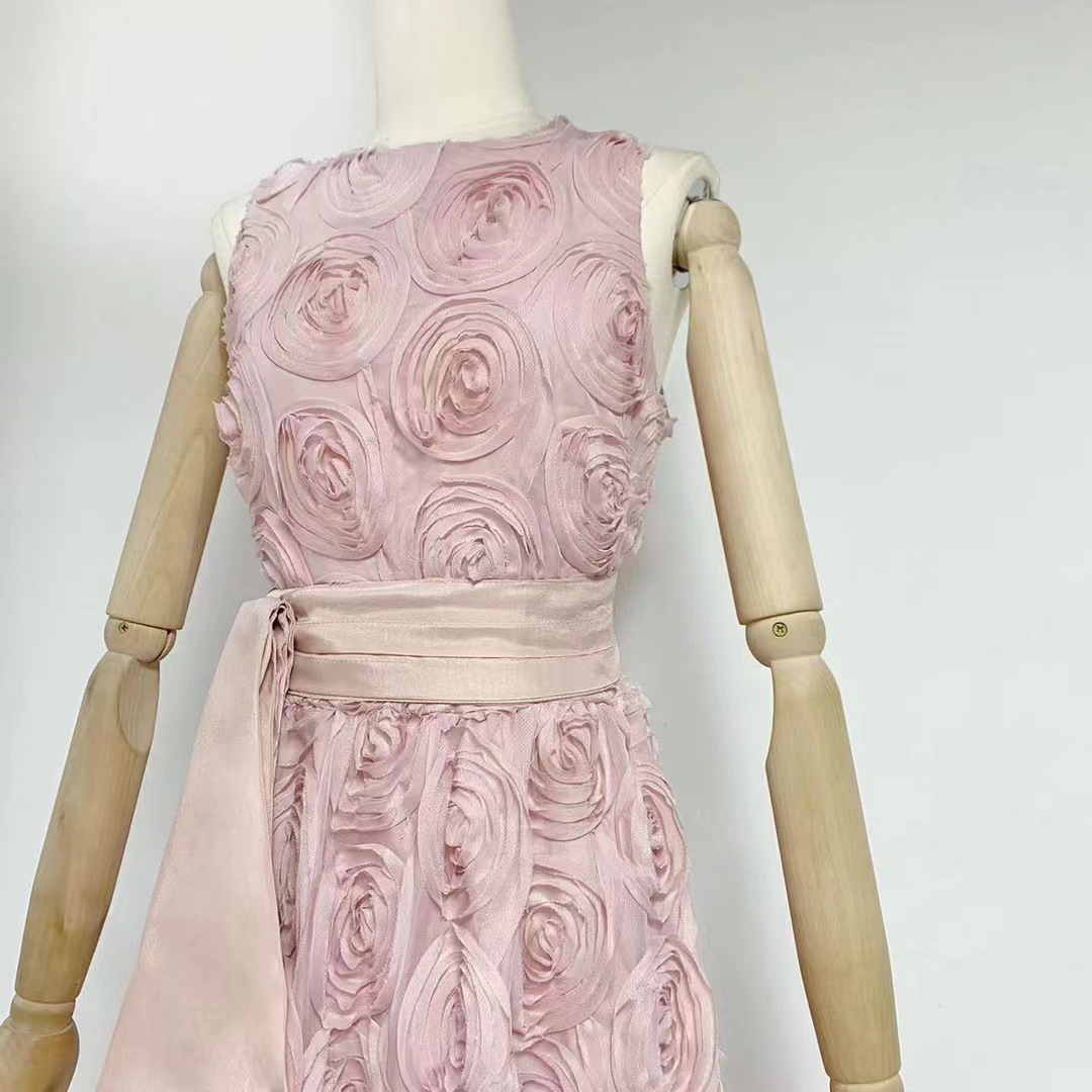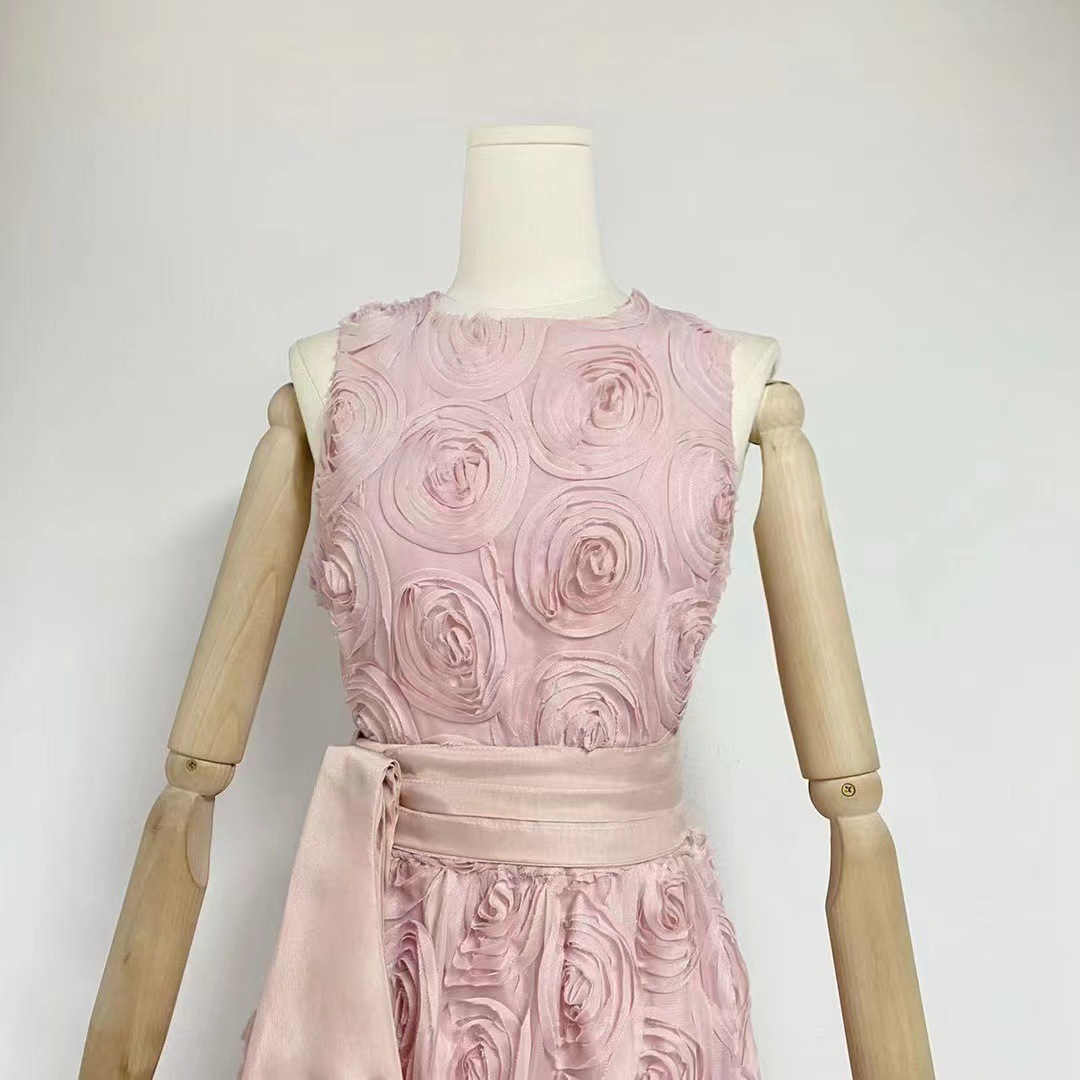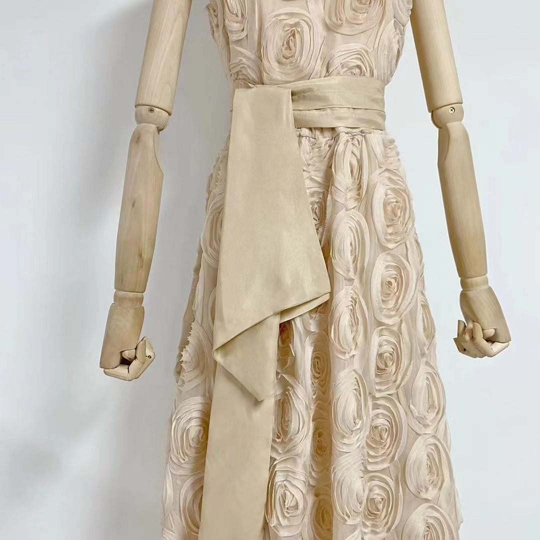 유럽과 미국의 대외 무역 국경 2024 여름 새로운 둥근 목 민소매 3 차원 꽃 벨트 허리 긴 원피스 여성