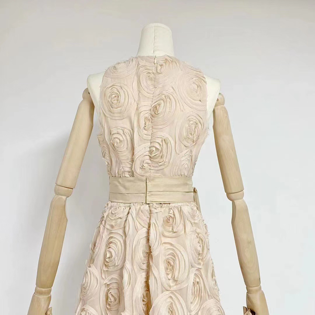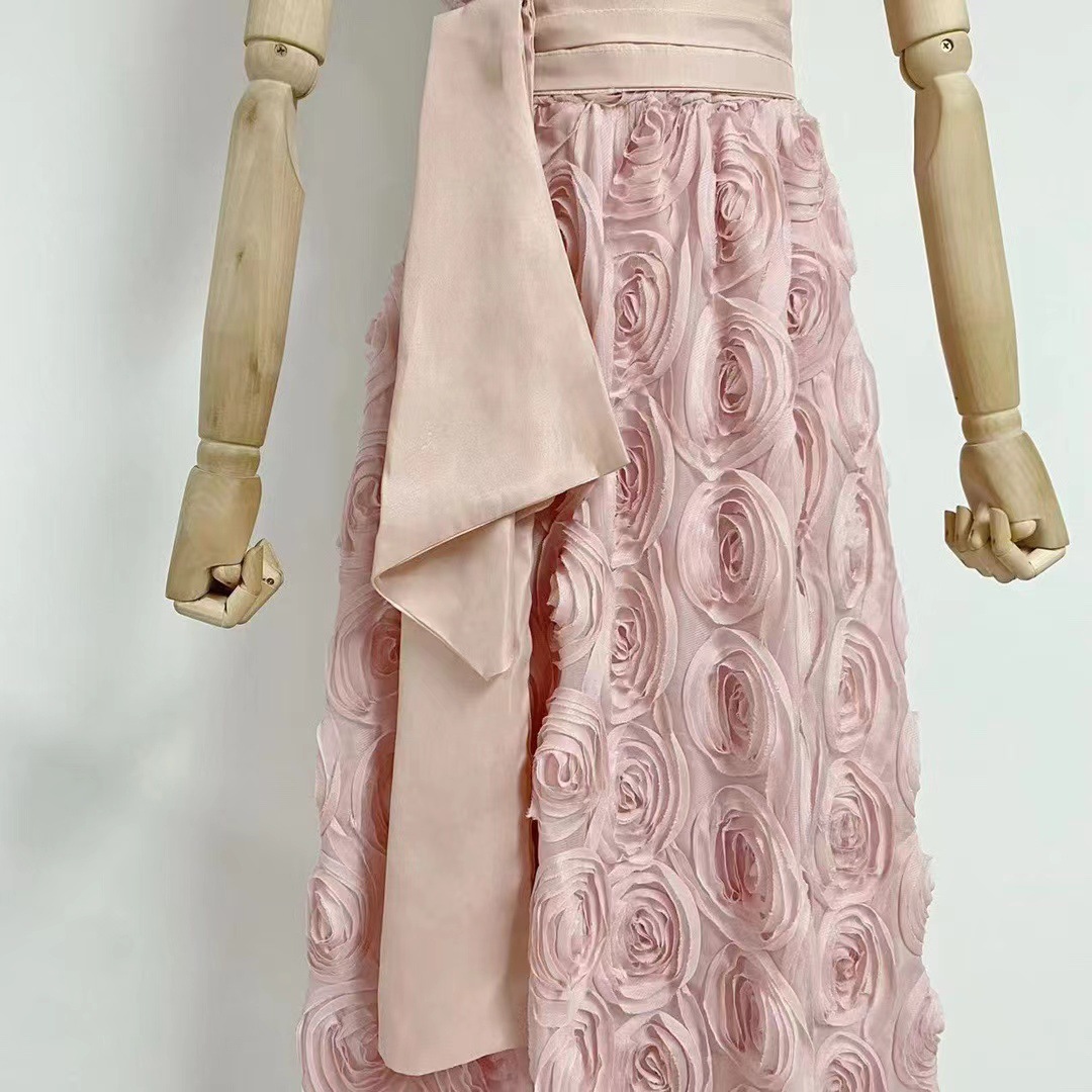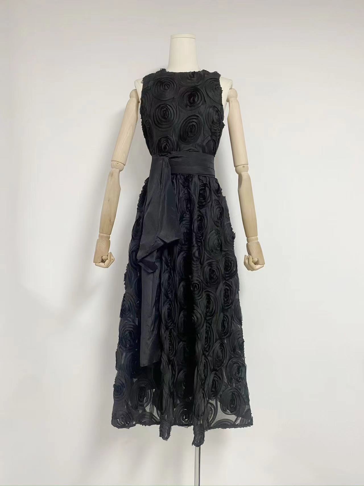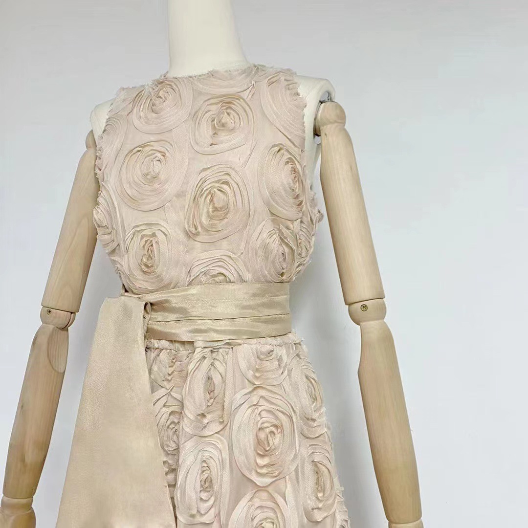 유럽과 미국의 대외 무역 국경 2024 여름 새로운 둥근 목 민소매 3 차원 꽃 벨트 허리 긴 원피스 여성