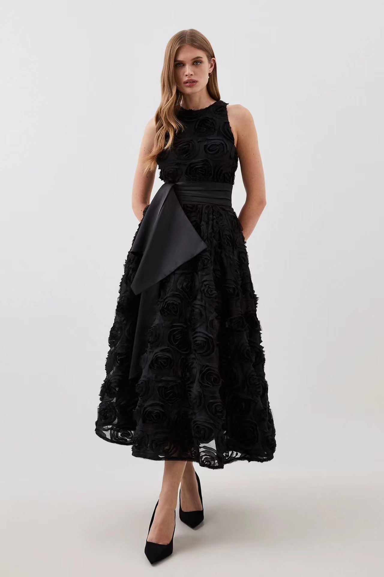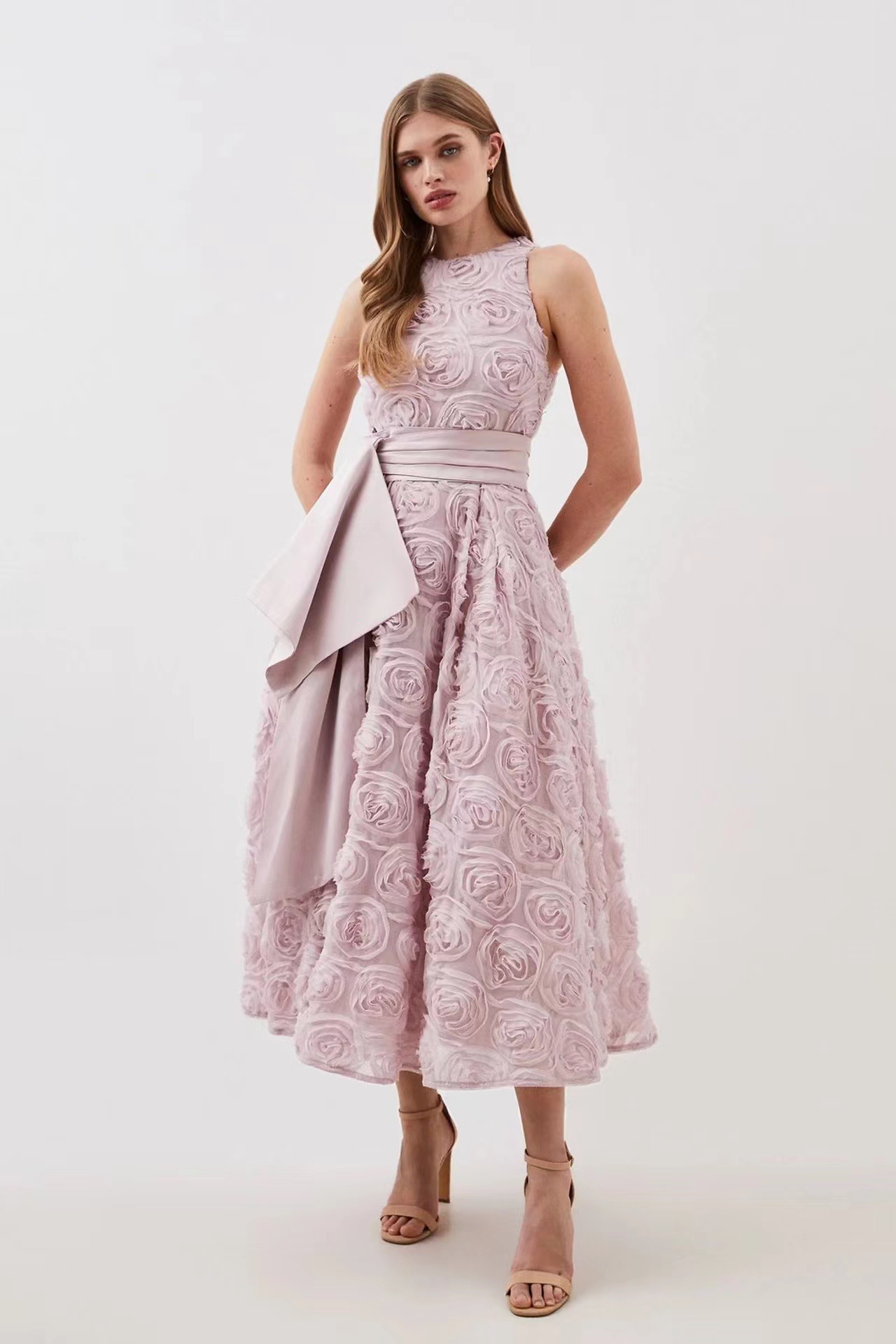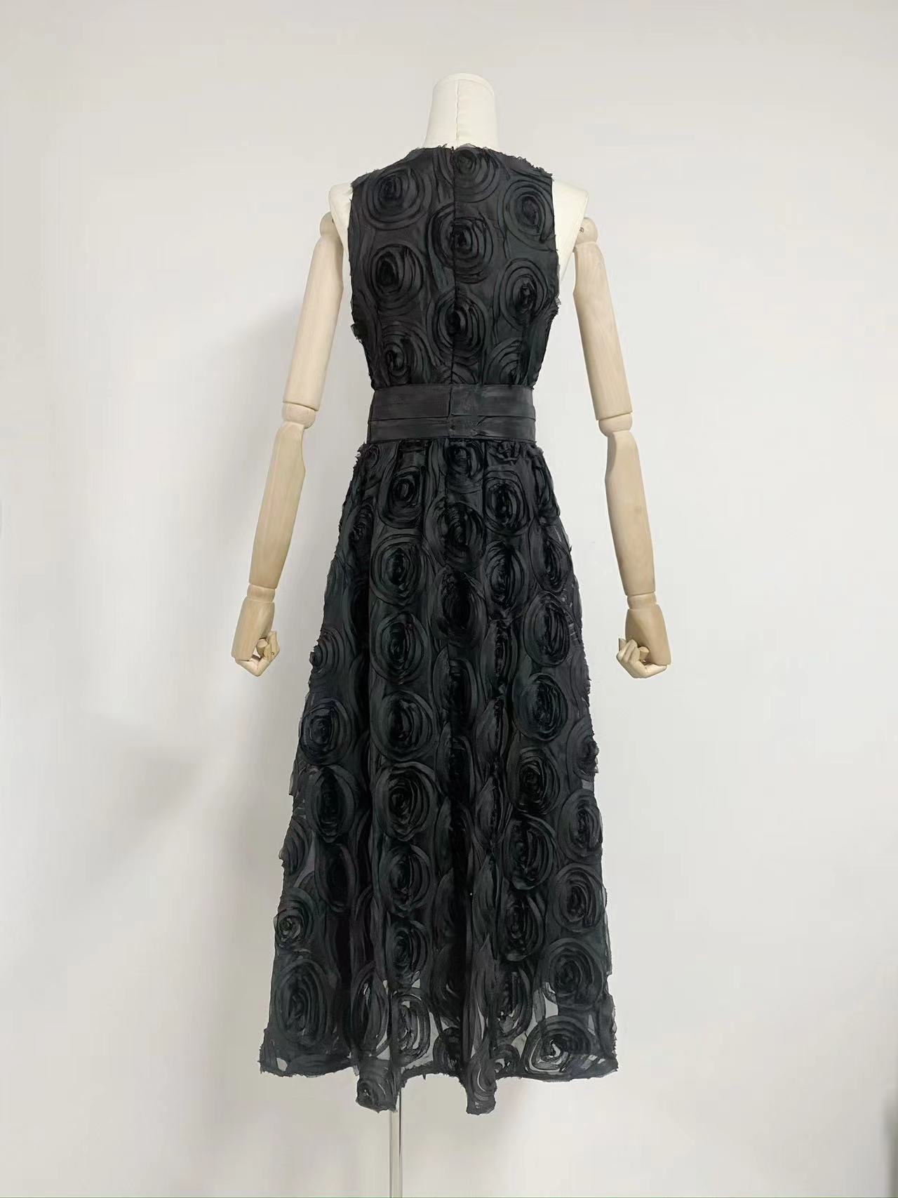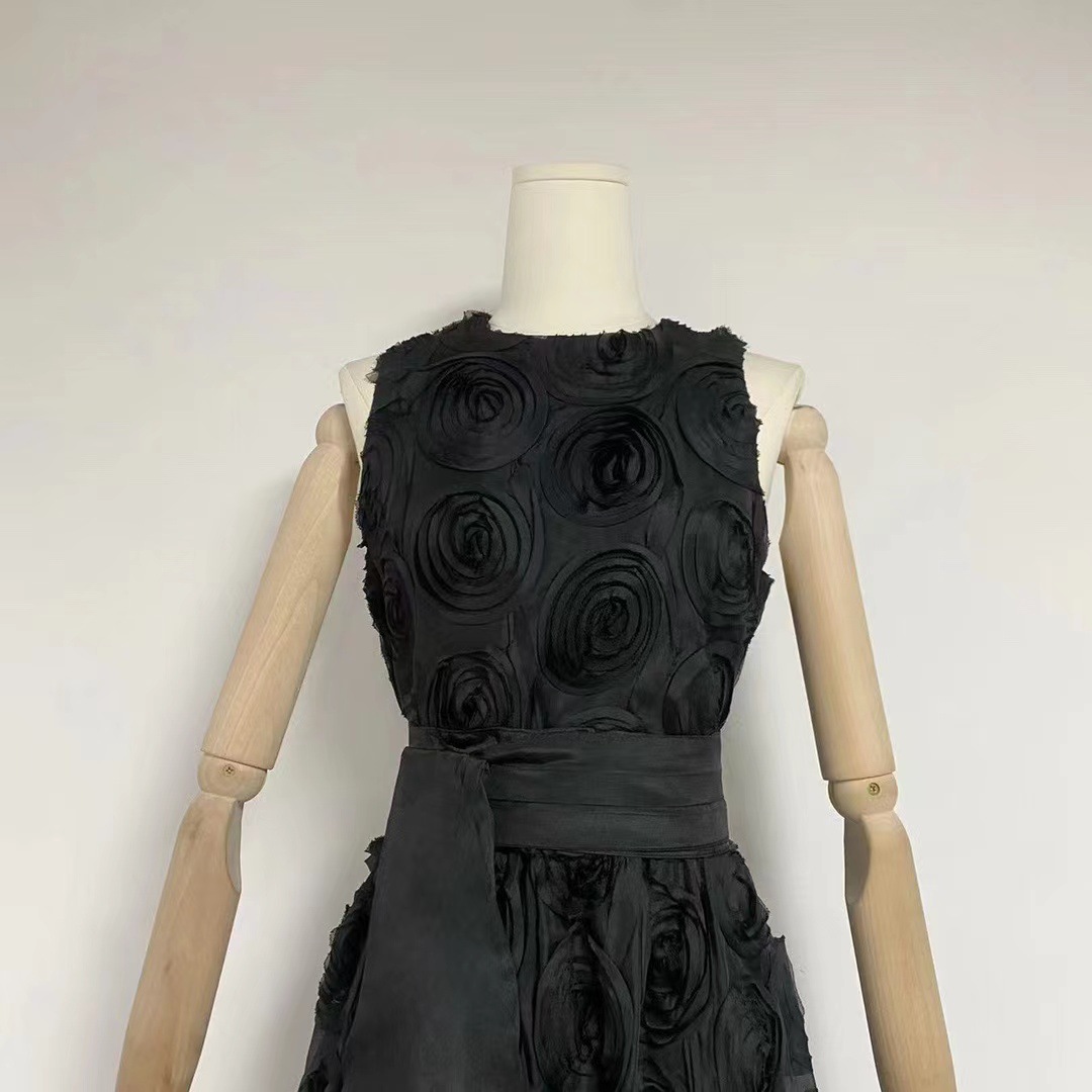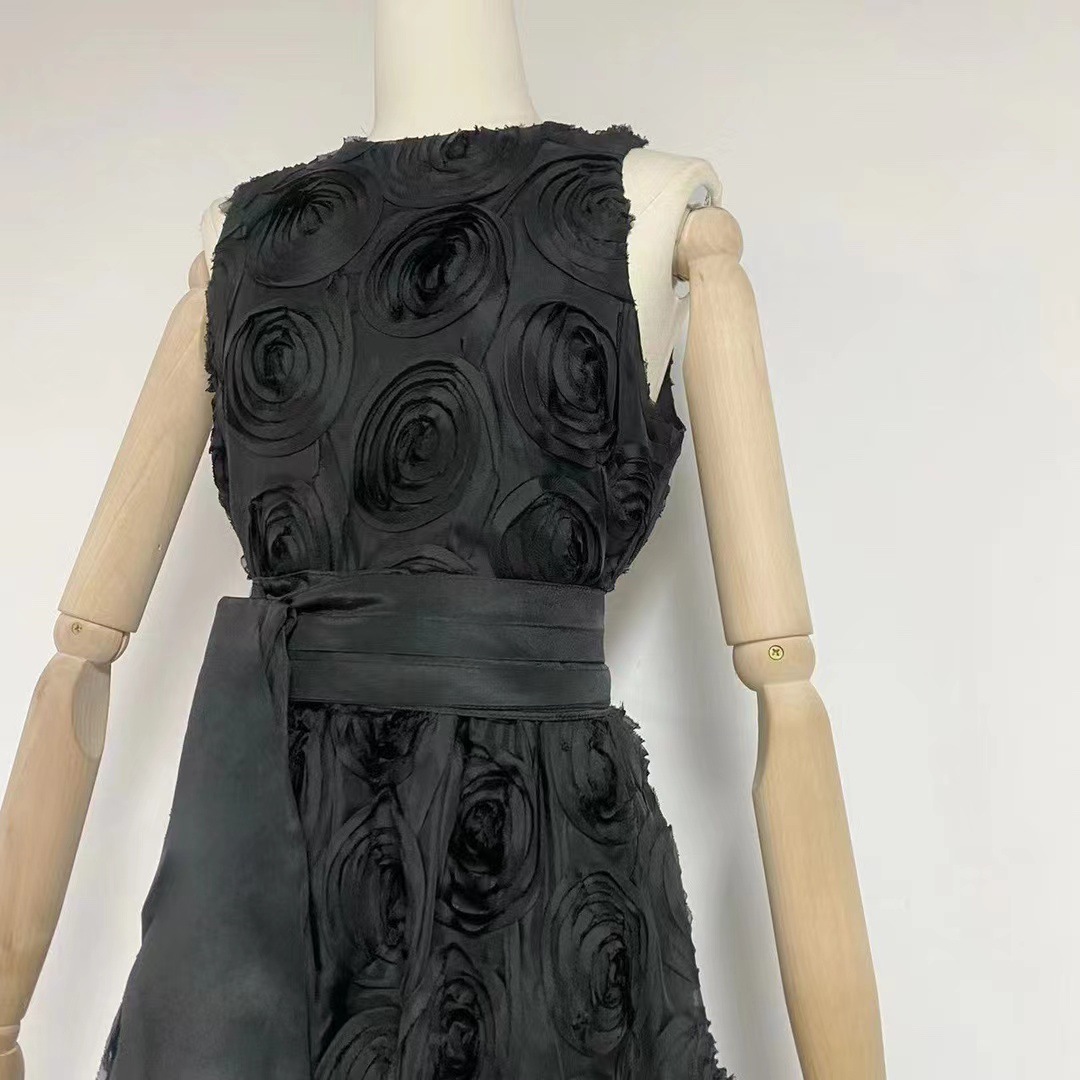 유럽과 미국의 대외 무역 국경 2024 여름 새로운 둥근 목 민소매 3 차원 꽃 벨트 허리 긴 원피스 여성