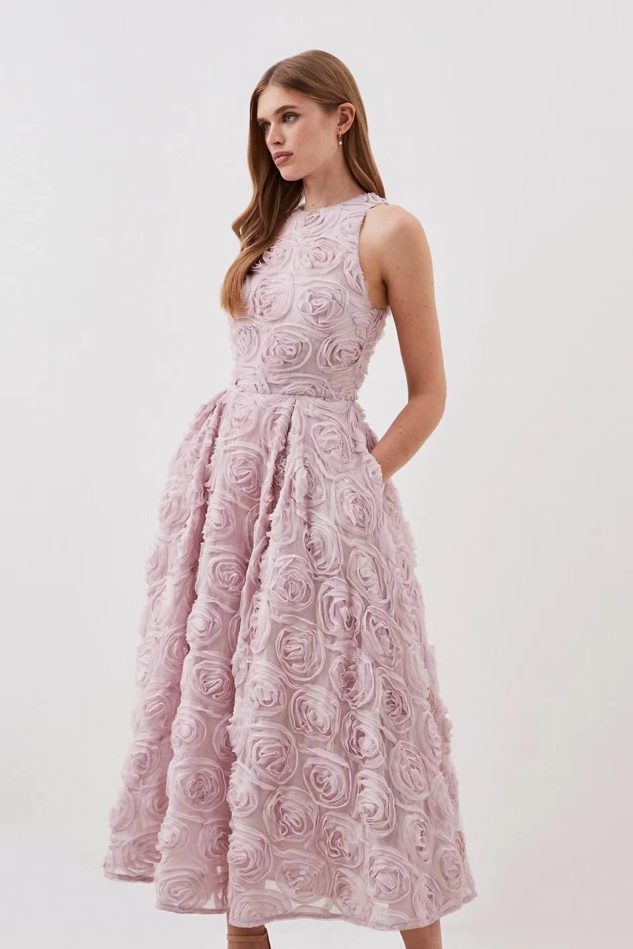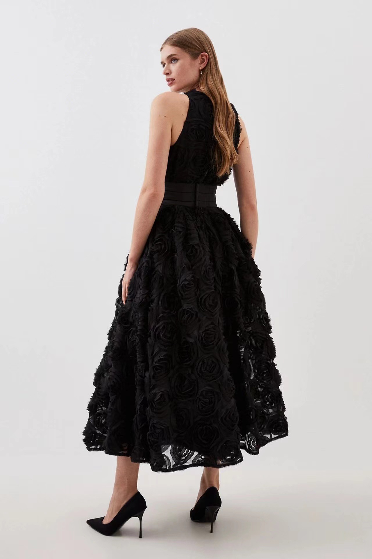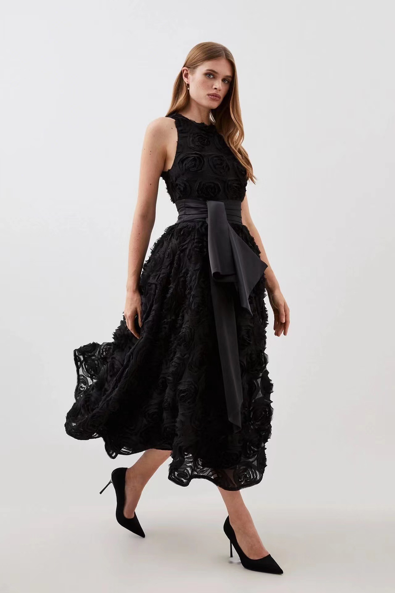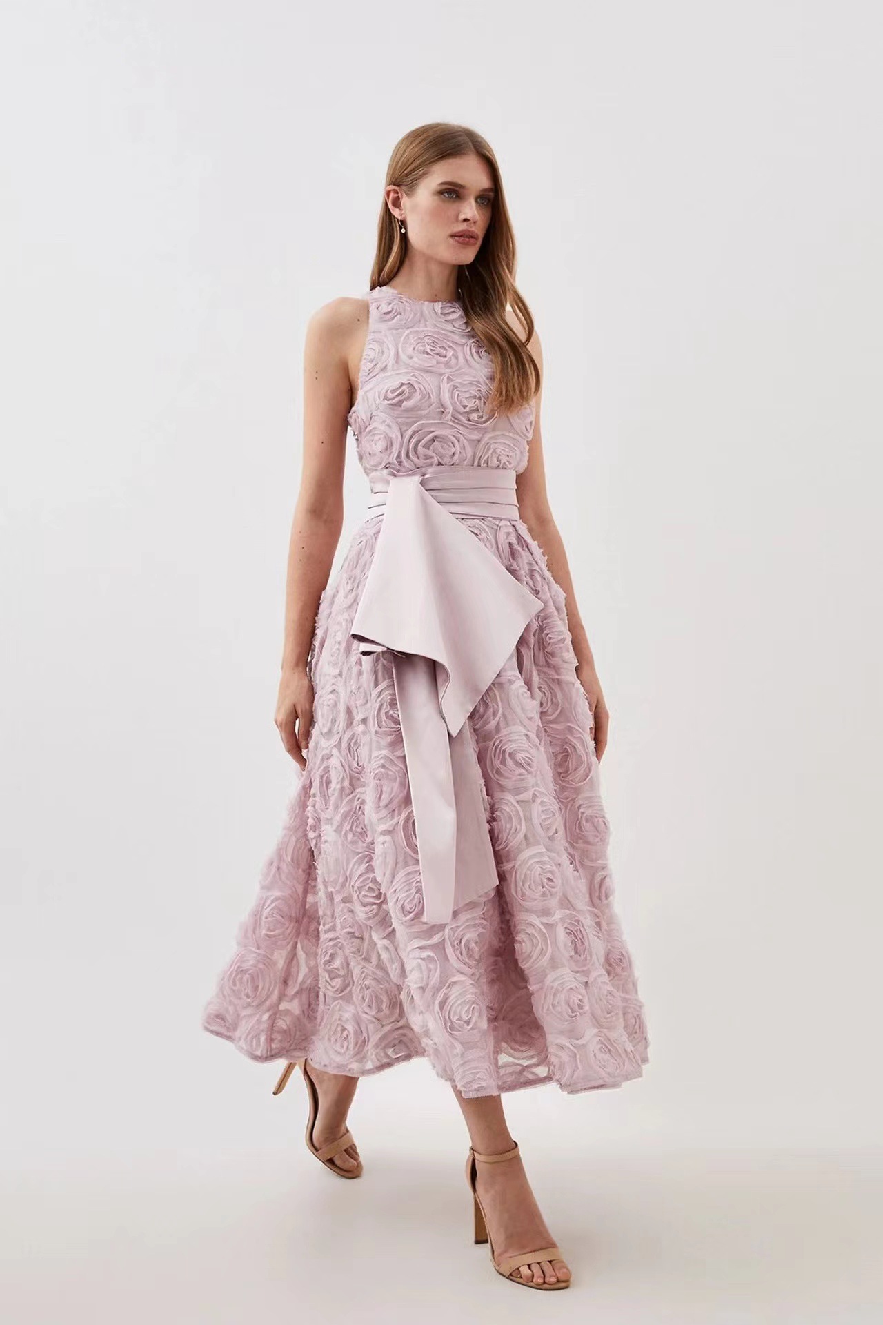 유럽과 미국의 대외 무역 국경 2024 여름 새로운 둥근 목 민소매 3 차원 꽃 벨트 허리 긴 원피스 여성