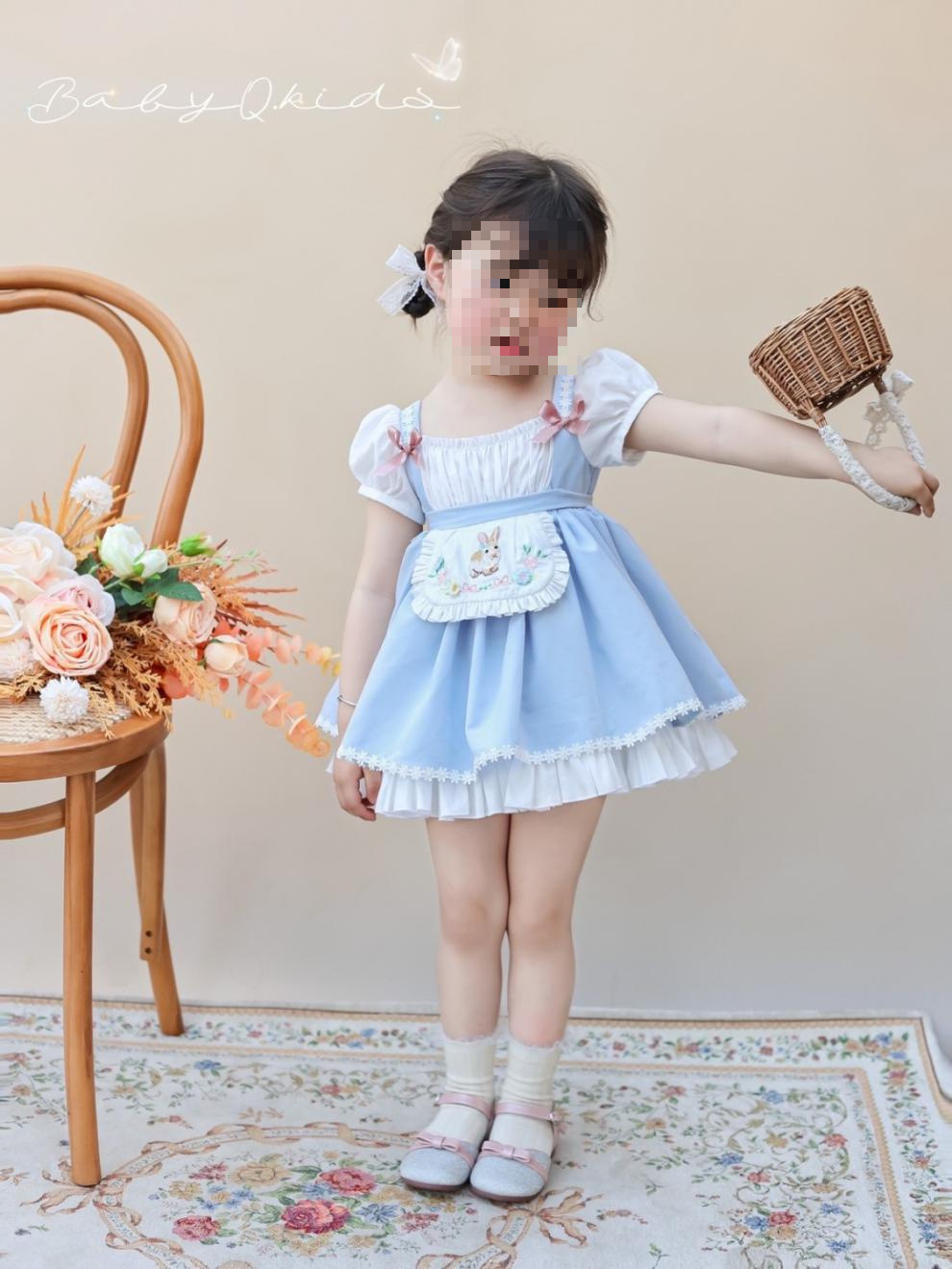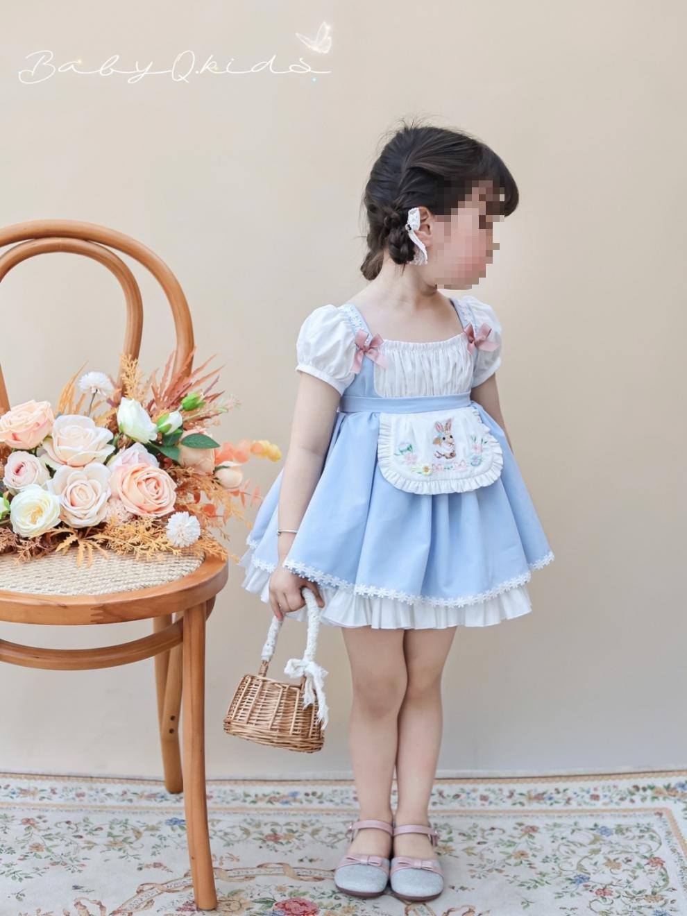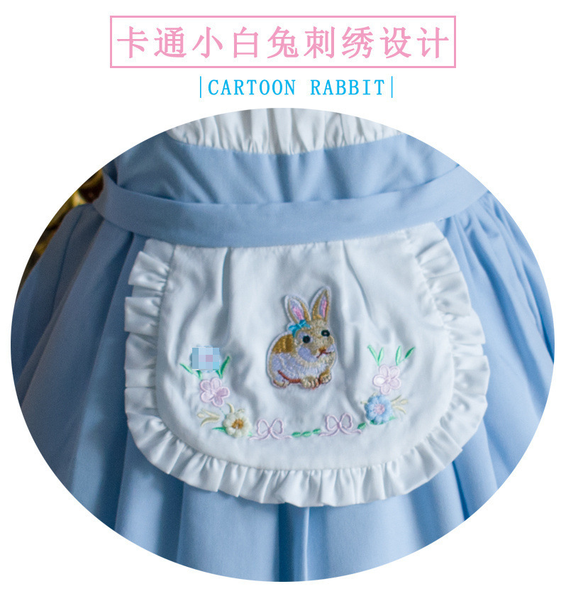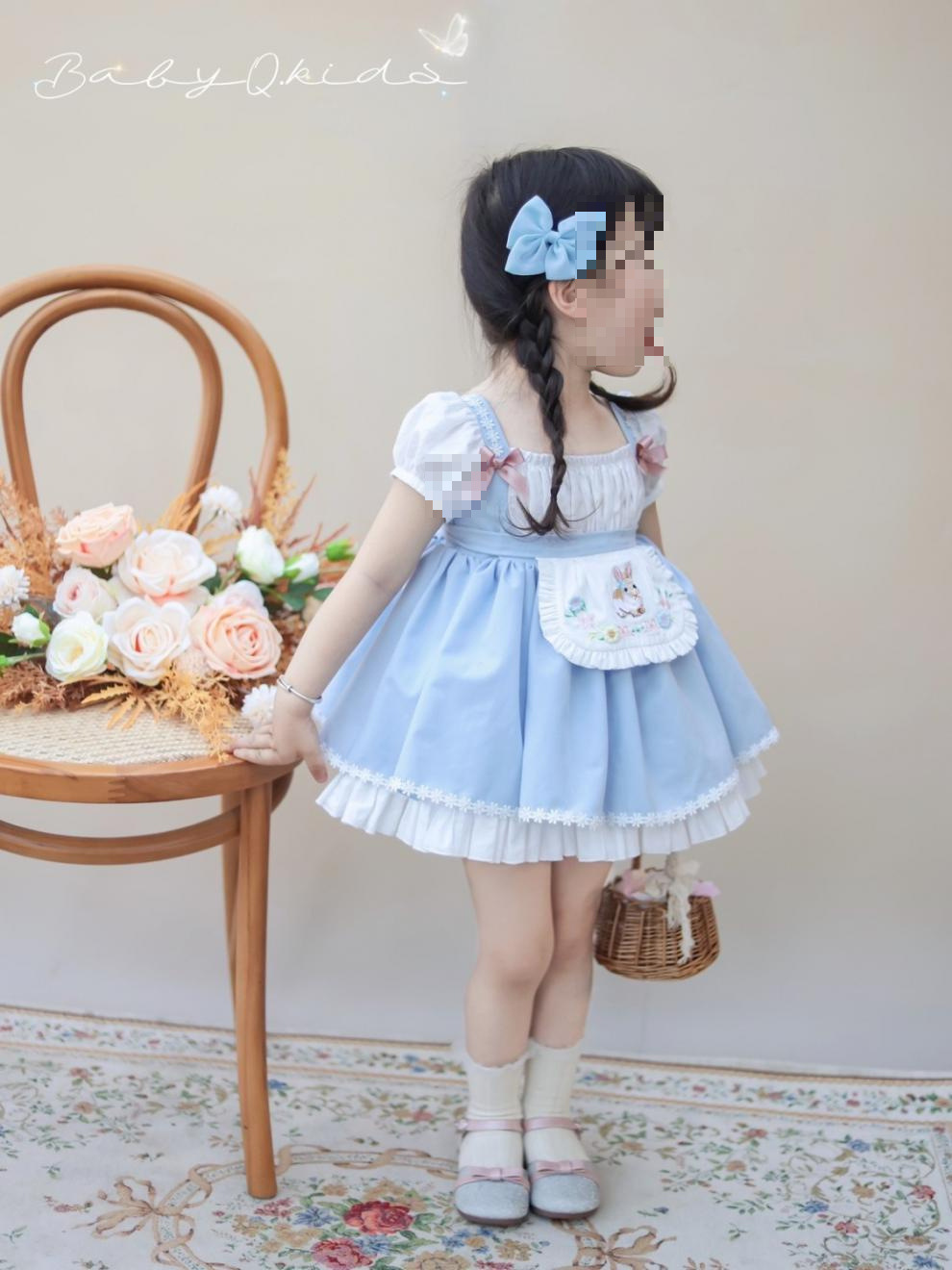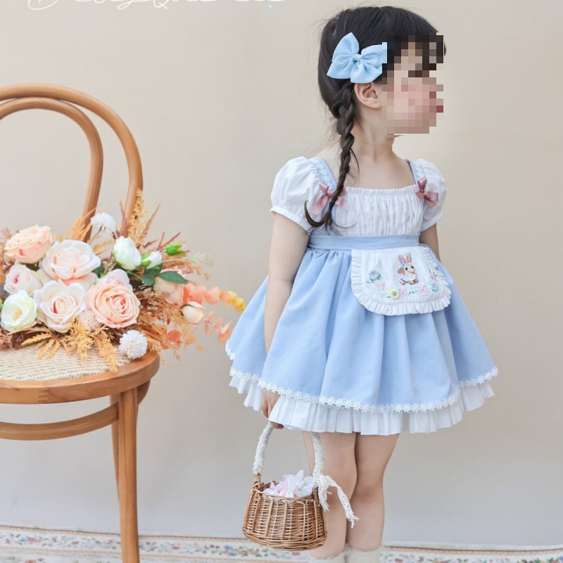 여자 짧은 캐노피 원피스 새로운 2024 여름 신선한 푸른 흰색 토끼 만화 공주 원피스 퍼프 소매 생일 원피스스토어 가기