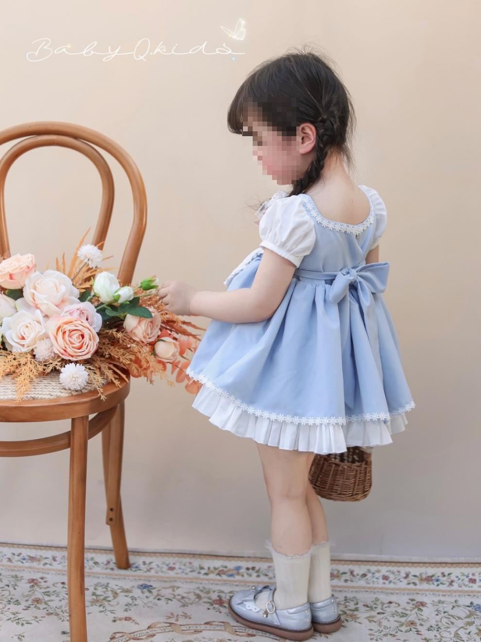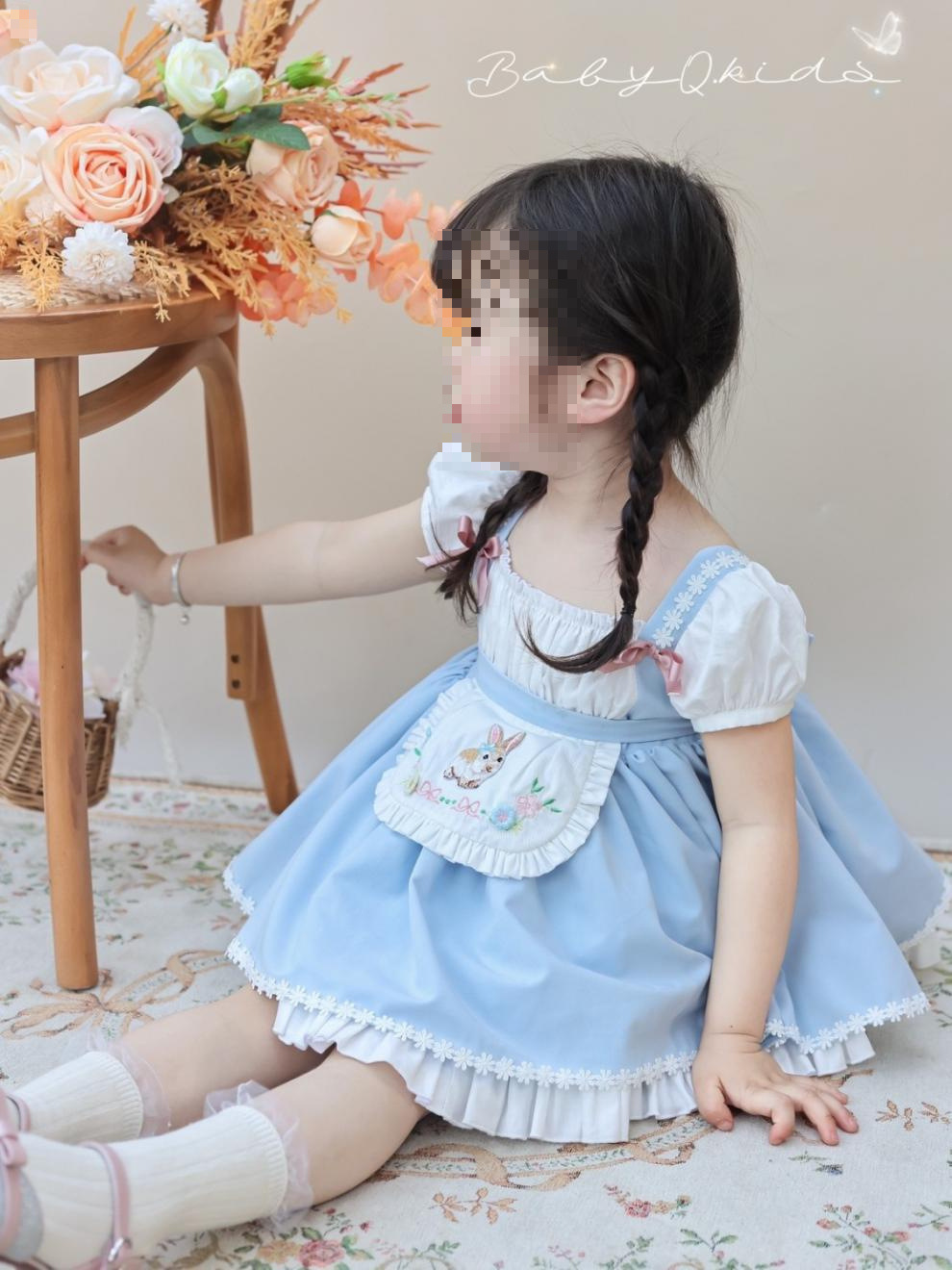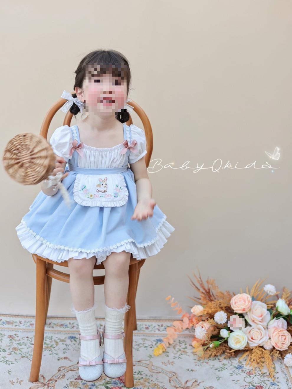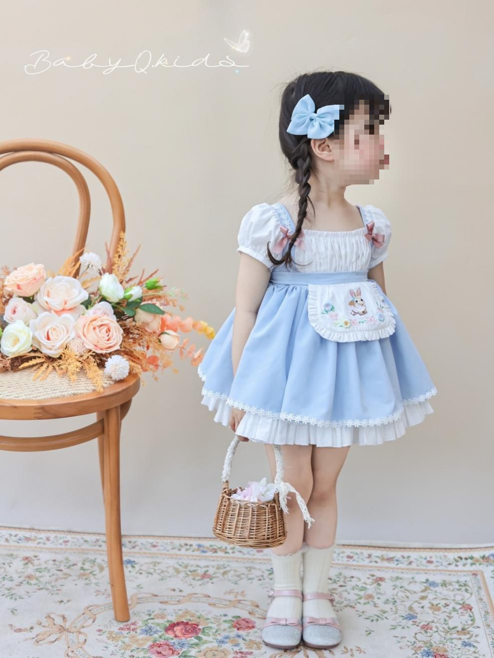 여자 짧은 캐노피 원피스 새로운 2024 여름 신선한 푸른 흰색 토끼 만화 공주 원피스 퍼프 소매 생일 원피스스토어 가기