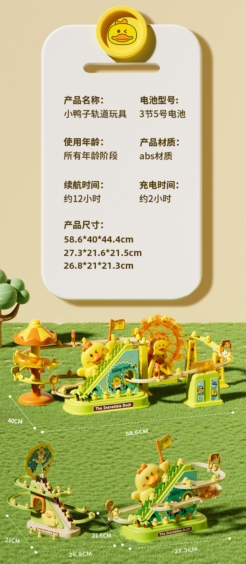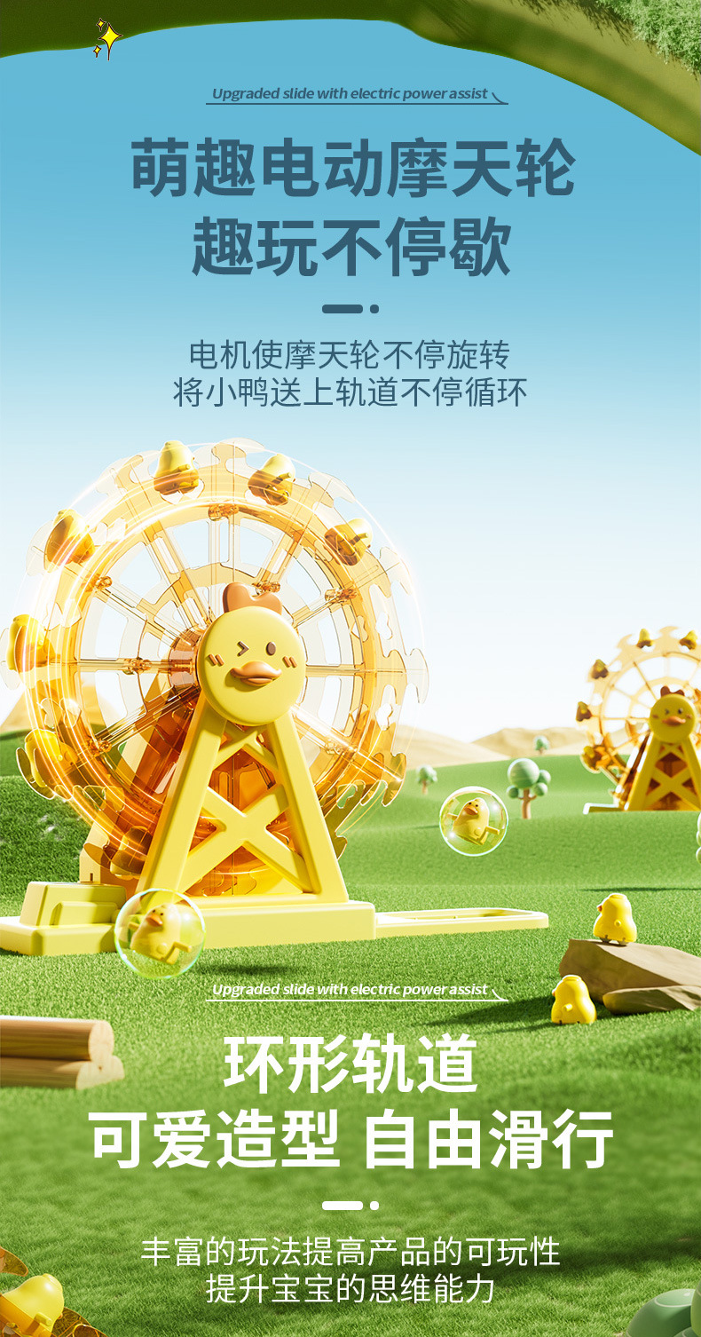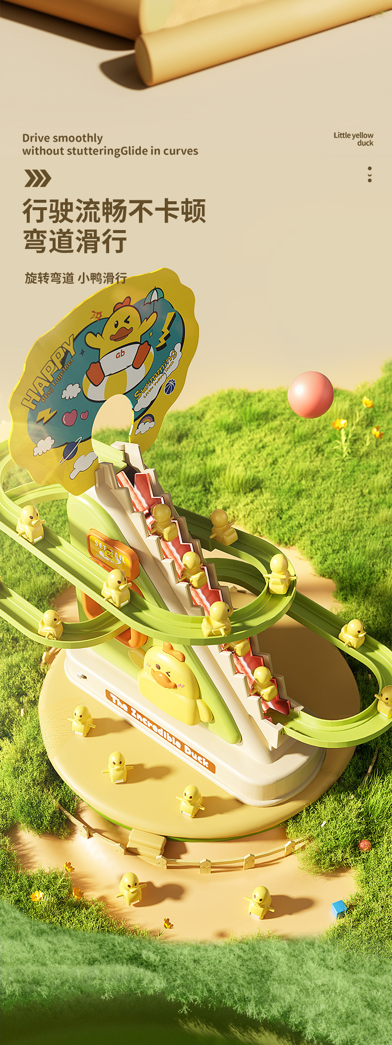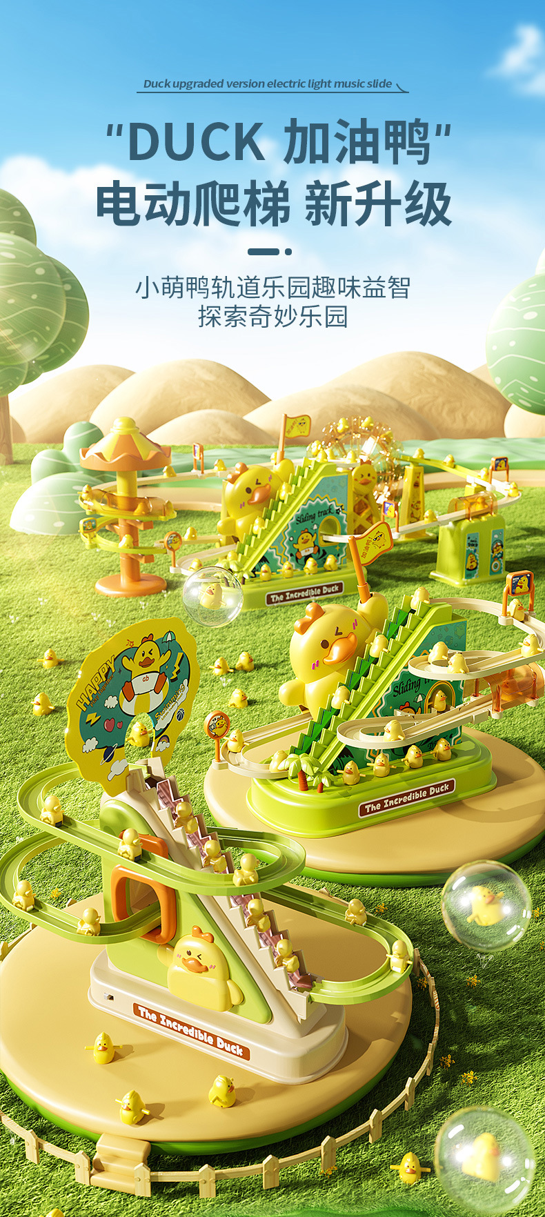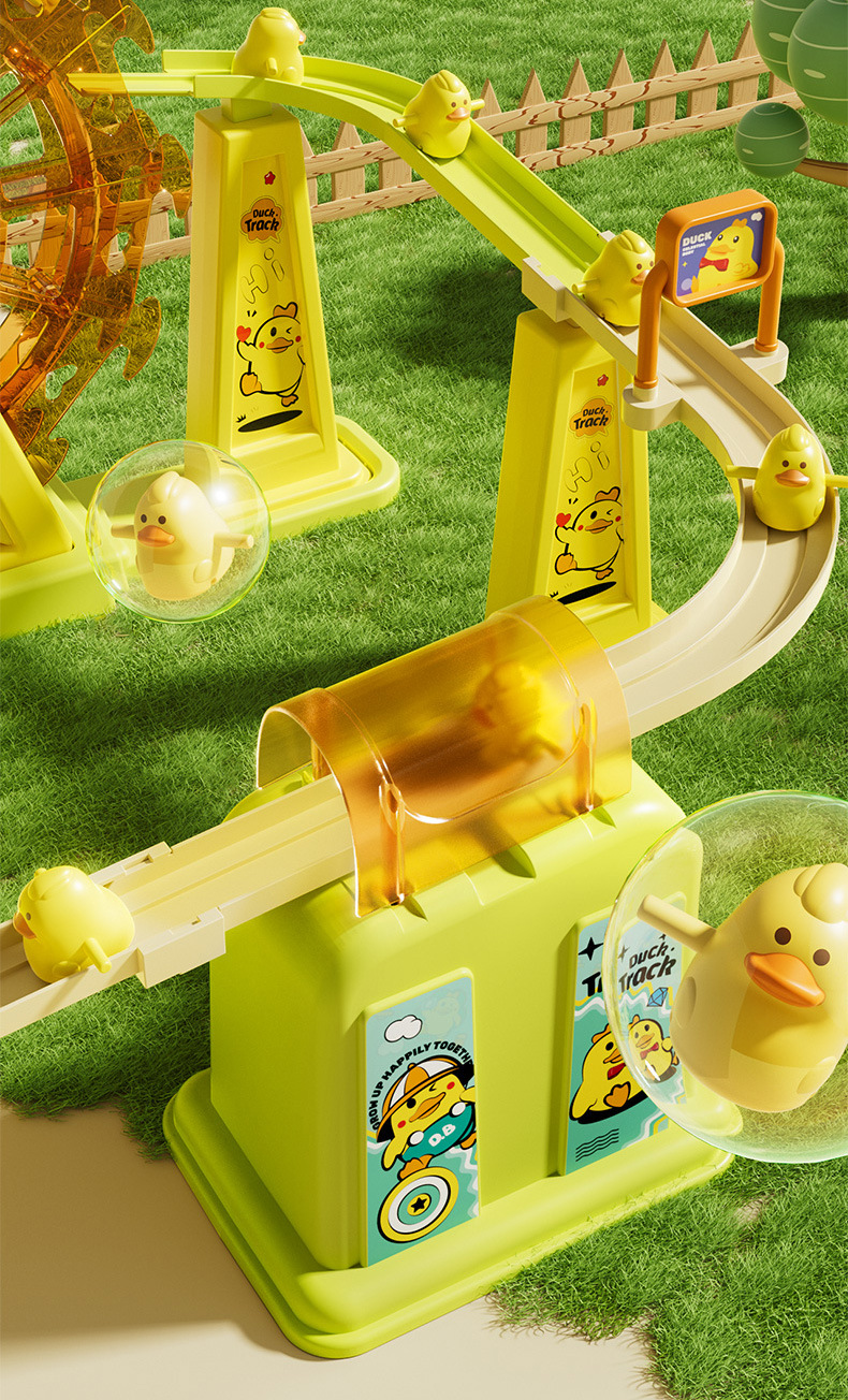 뜨거운 판매 전기 급유 오리 레일 자동차 아기 오리 자동 등반 계단 슬라이드 장난감 직접 도매의 소리를 흔들어