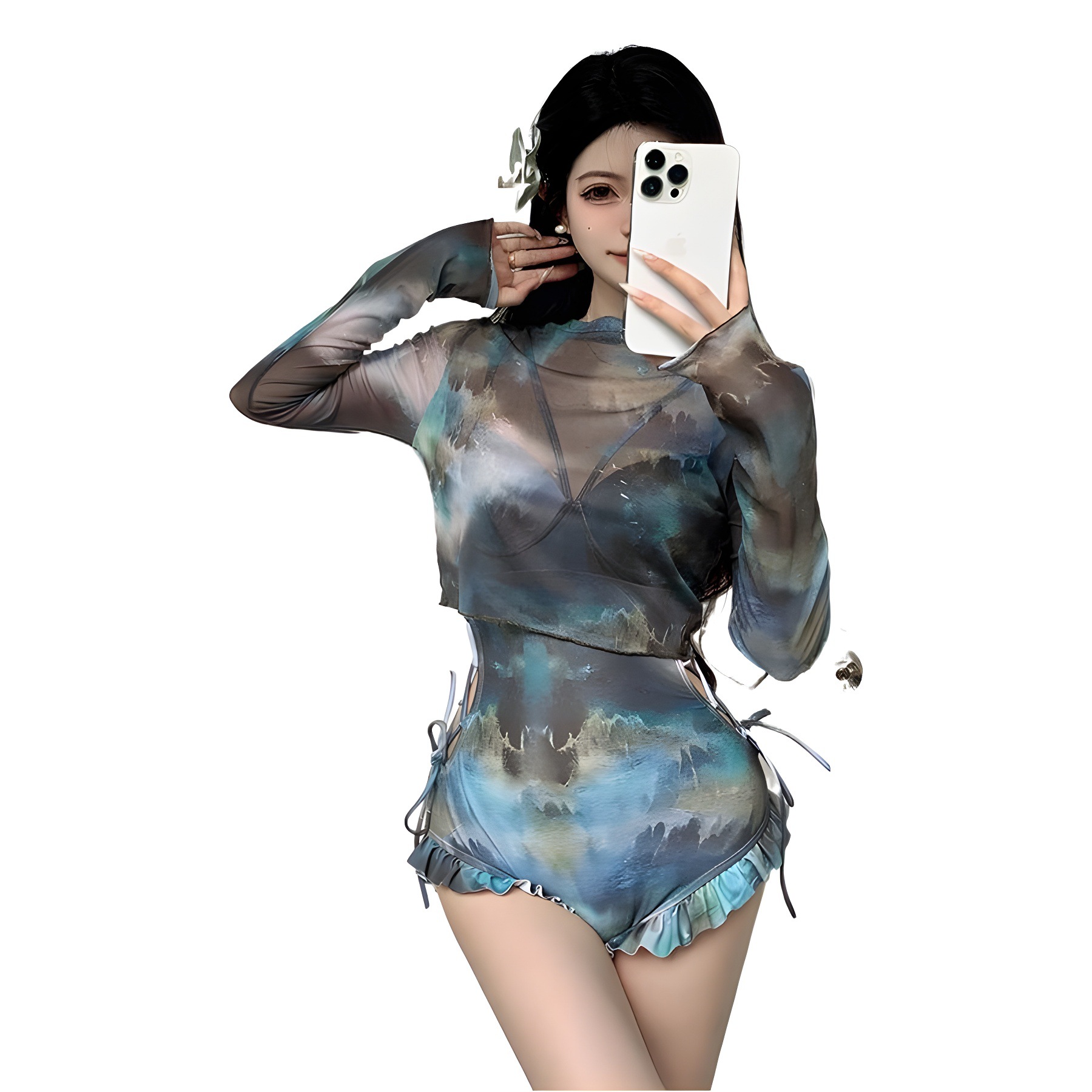 2024 새로운 비키니 보수 긴팔 블라우스 세트 여성 살로 덮인 슬리밍 온천 휴가 순수한 욕망 수영복