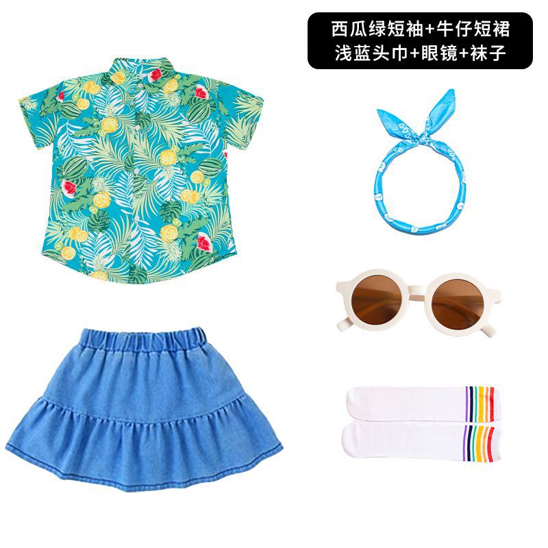 • 수박 녹색 반팔 + 데님 스커트 + 하늘색 스카프 안경 양말
