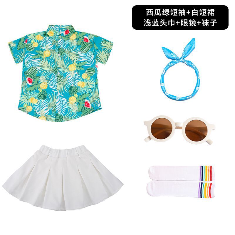 • 수박 녹색 반팔 + 순백색 스커트 + 하늘색 스카프 안경 양말