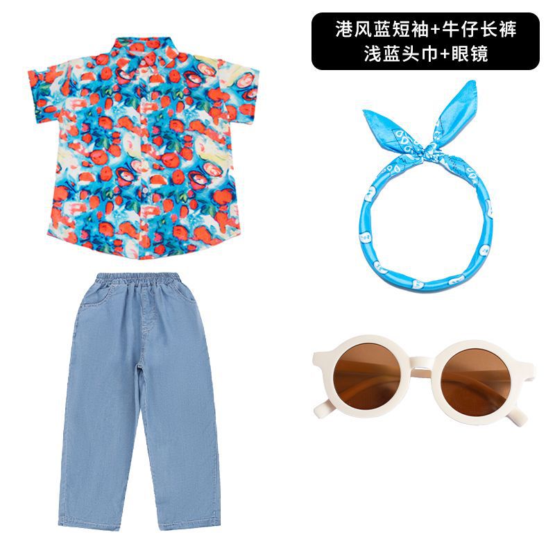 • 홍콩 스타일 블루 반팔 + 데님 반바지 + 라이트 블루 스카프 안경 양말