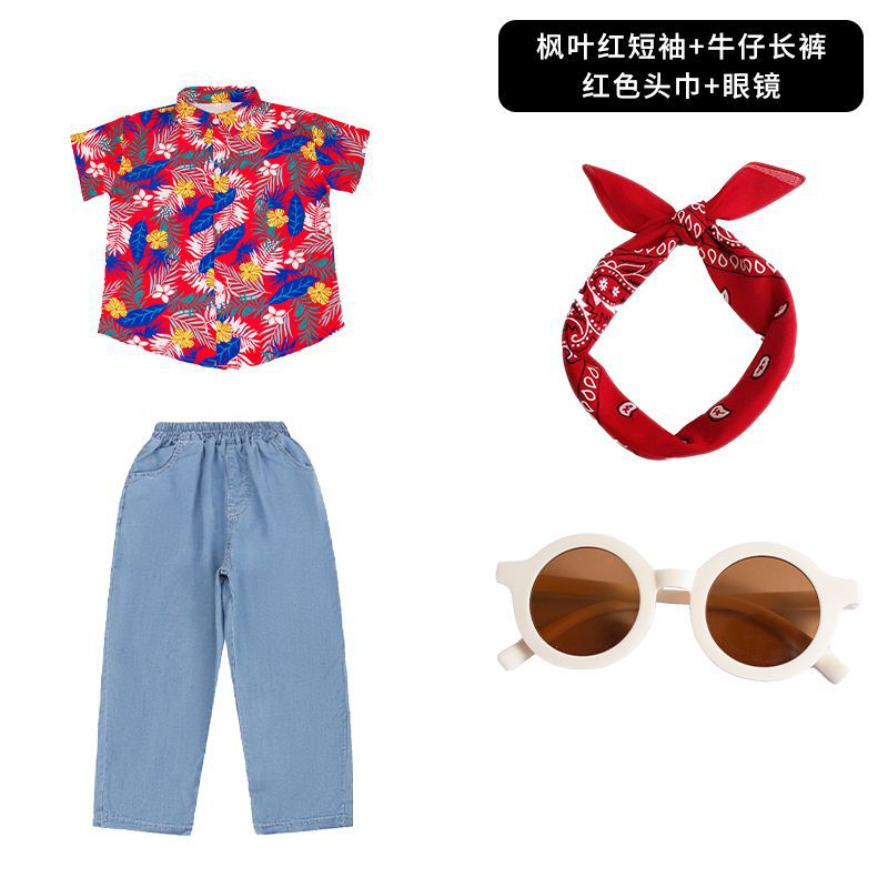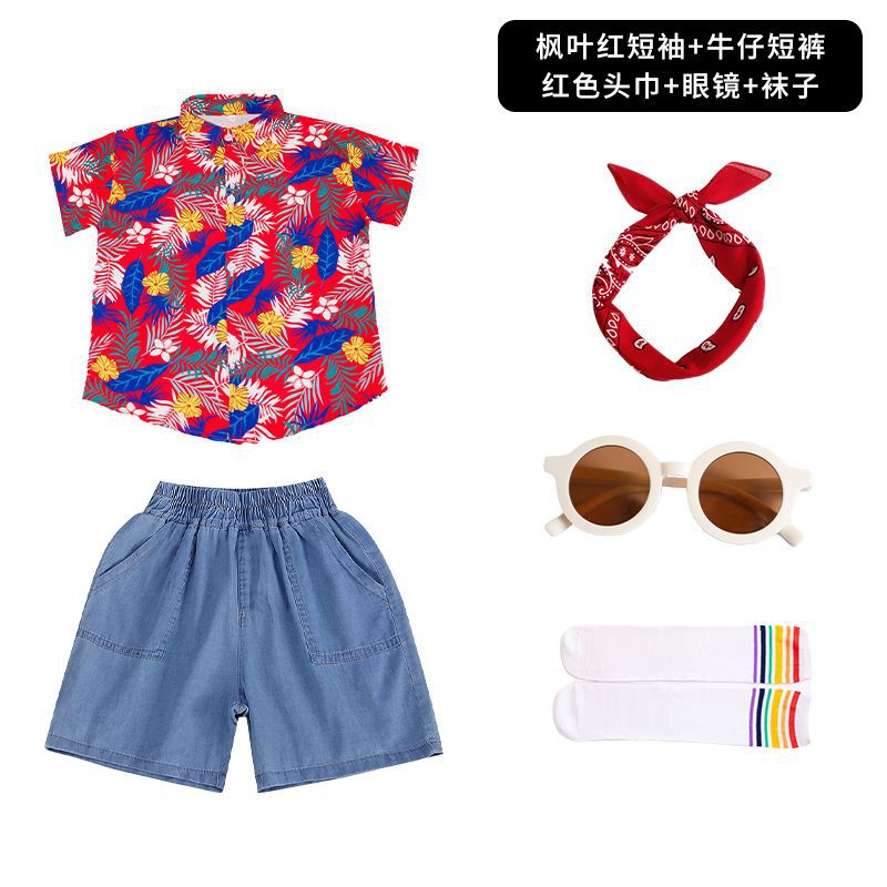 • 메이플 리프 레드 반팔 + 데님 반바지 + 레드 터번 안경 양말