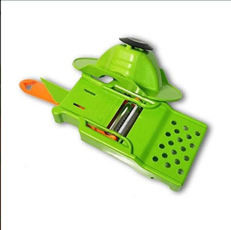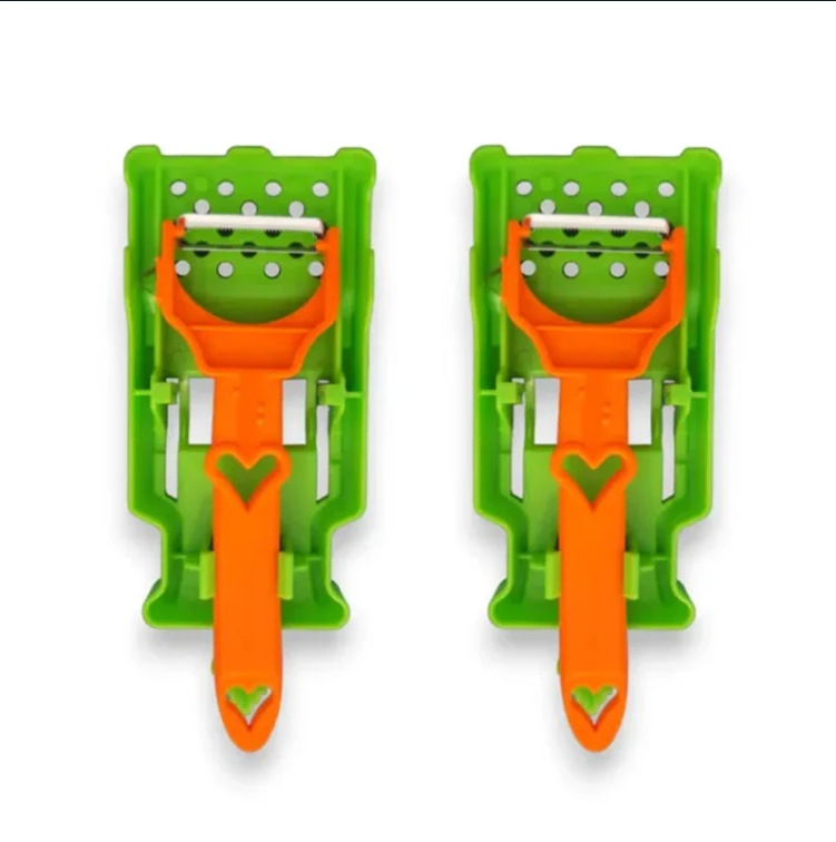坚固的 ABS 塑料手柄、托盘和护指器均不含 BPA。手柄一侧配有锯齿状德国不锈钢削皮刀片,另一侧配有切丝刀片。