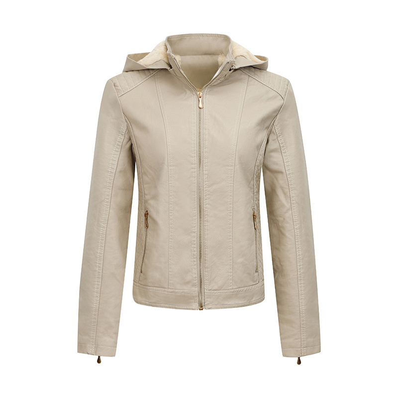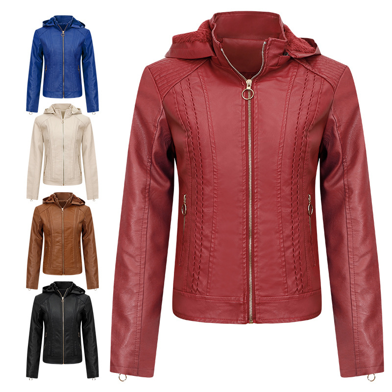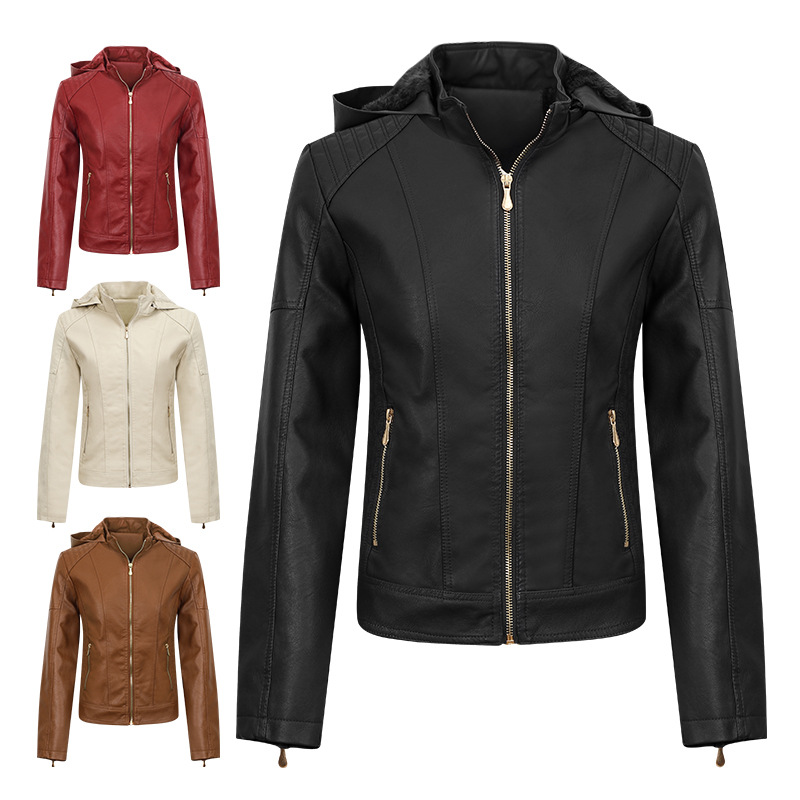 2024 아마존 플러스 사이즈 여성용 후드가 달린 벨벳 두꺼운 가죽 자켓, 여성용 슬림핏 PU 가죽 자켓, 여성용 가죽 자켓