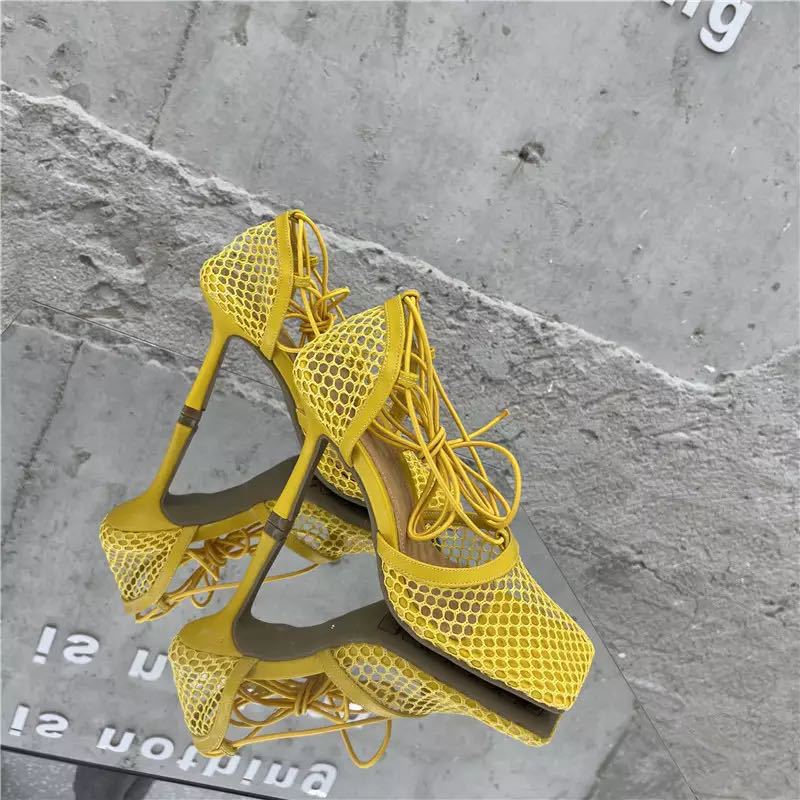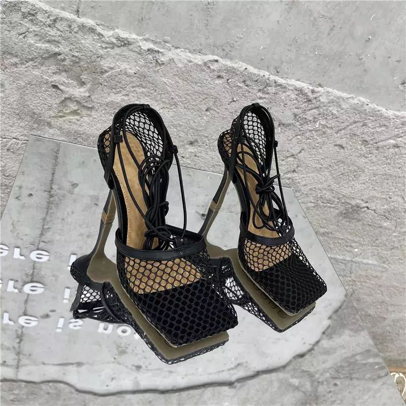 2024 년 여름 새로운 메쉬 스트랩 하이힐 여성 플러스 사이즈 스틸레토 벨트 할로우 로마 샌들 국경 여성 신발스토어 가기