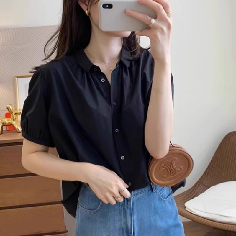 여름 새로운 반팔 셔츠 숙녀 우아한 통근 착용 독특한 작은 옷깃 달콤한 탑
