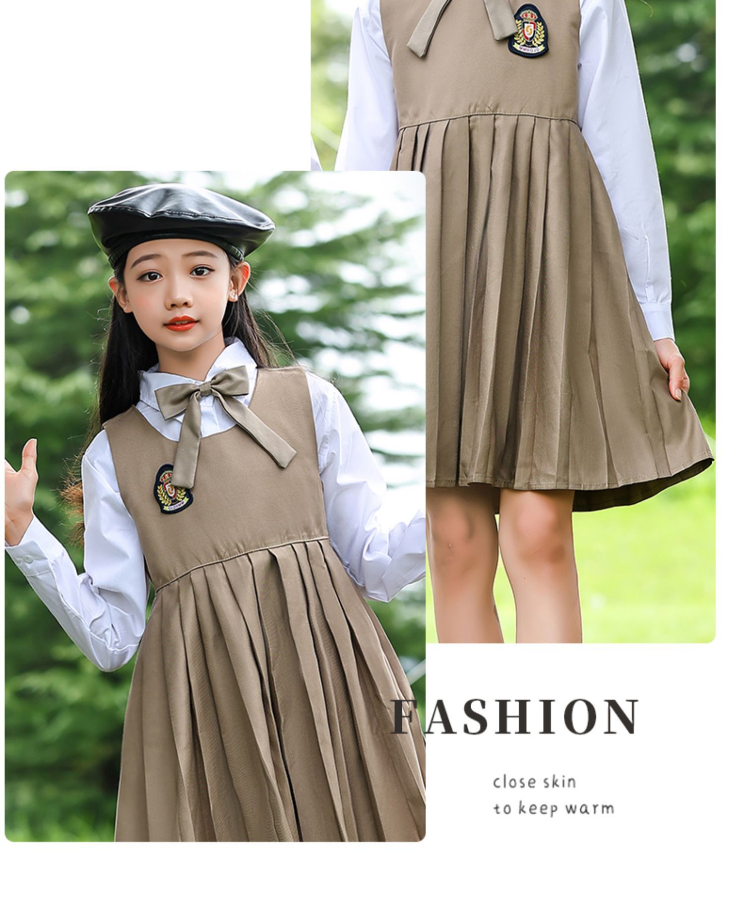 • B형 여성용 긴팔 + 카키 서스펜더 스커트 [무료 나비넥타이 + 양말 + 뱃지]