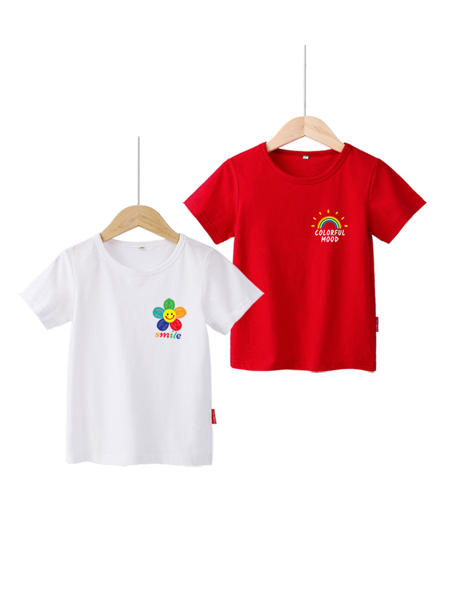 국경일 어린이 공연 의상 초등학생 무지개 웃는 얼굴 소년 소녀 흰색 반팔 티셔츠 유치원 수업 교복