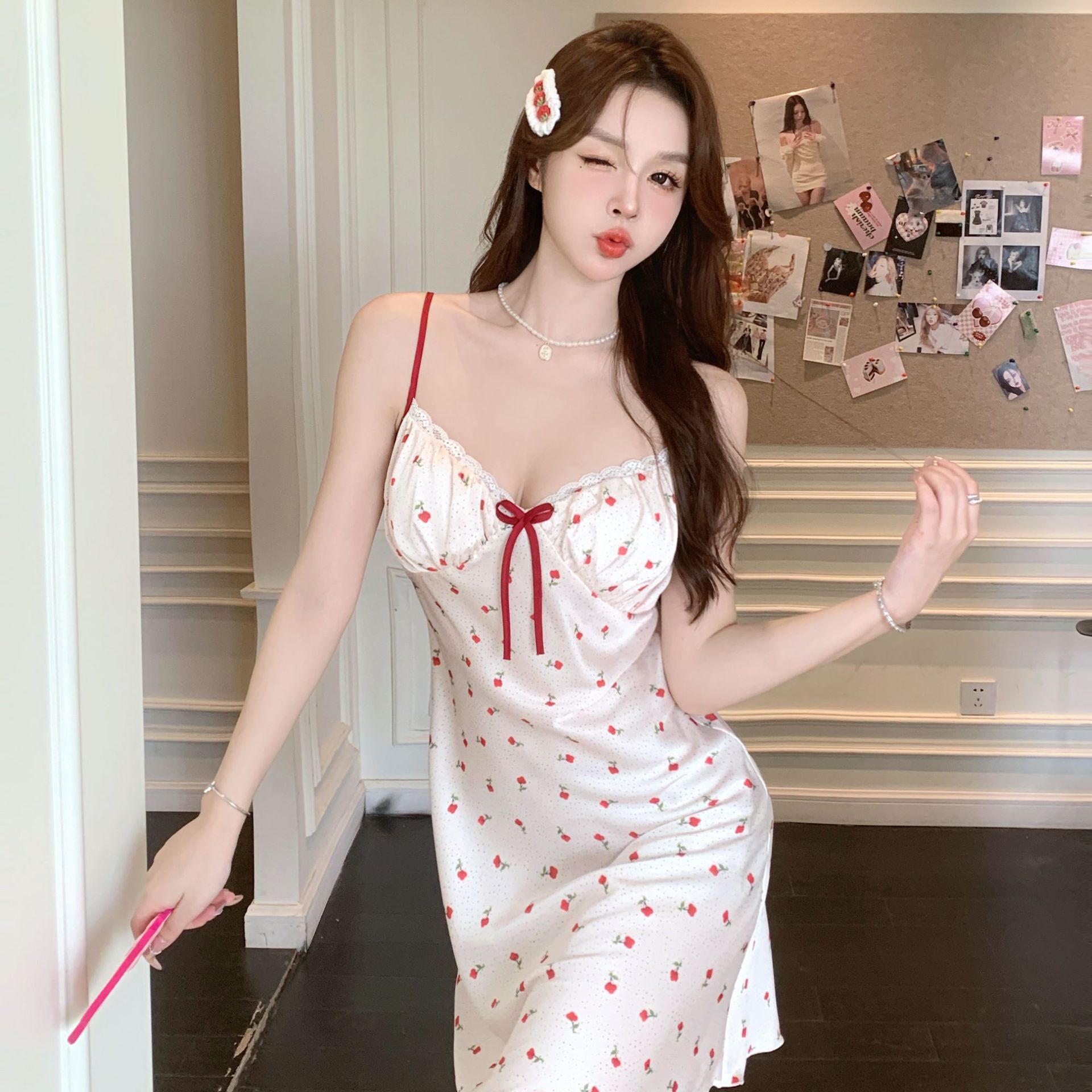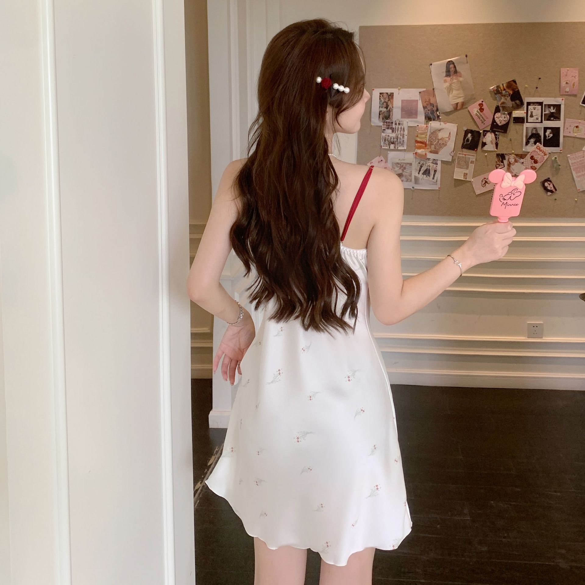 섹시한 잠옷 여성 아이스 리본 가슴 패드 인쇄 순수한 욕망 실크 2024 새로운 도착 슬링 나이트 드레스 홈 크로스 테두리스토어 가기
