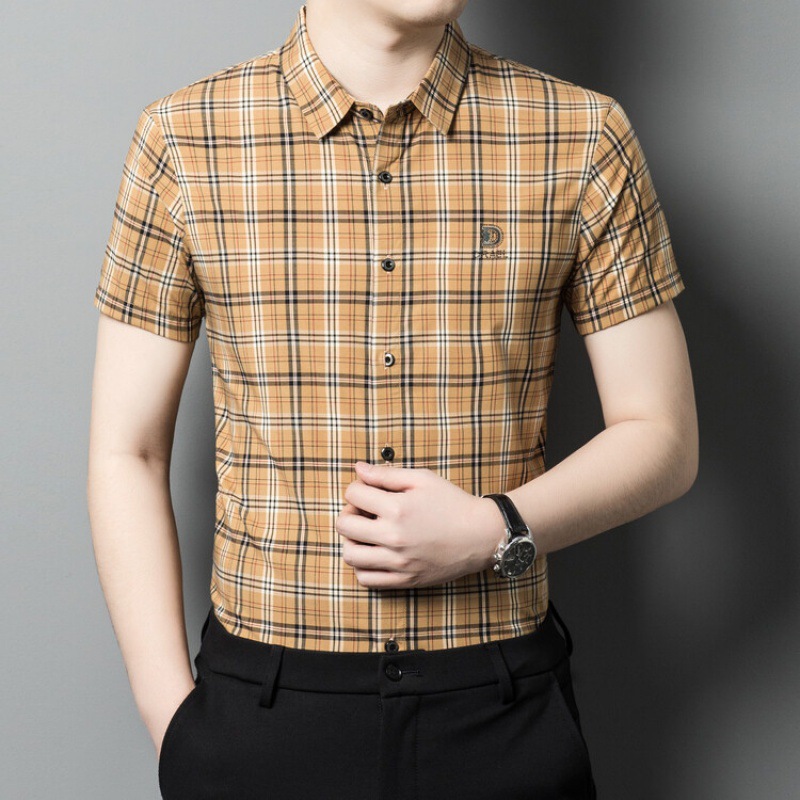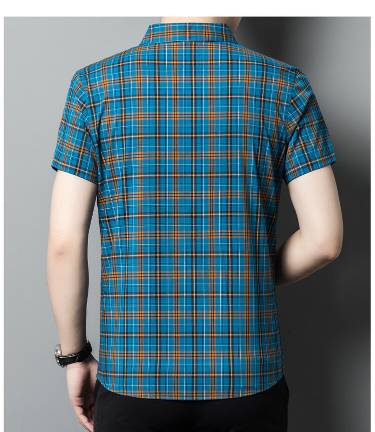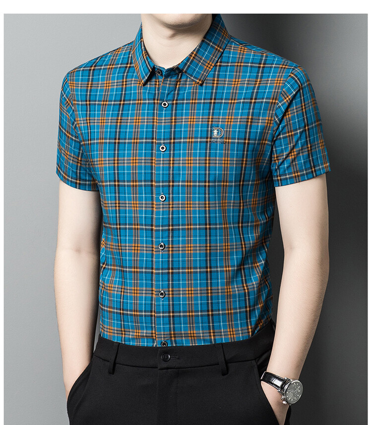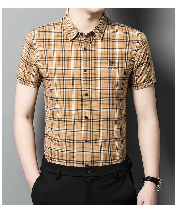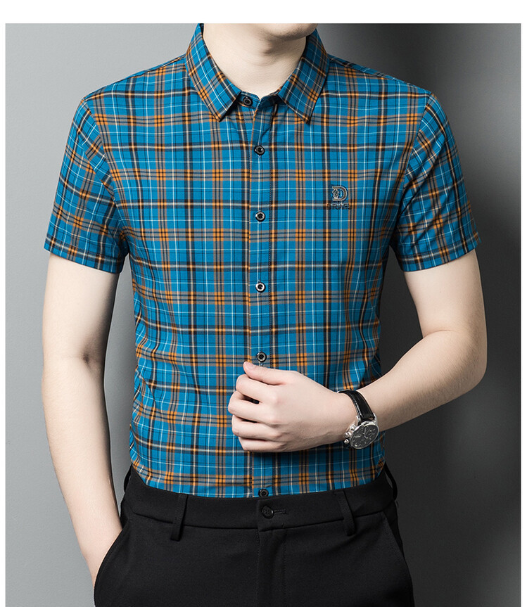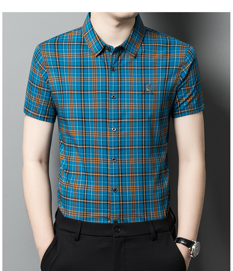 2024 년 여름 새로운 캐주얼 셔츠 남성용 반팔 옷깃 격자 중년 비 다림질 높은 스트레치 남성용 셔츠