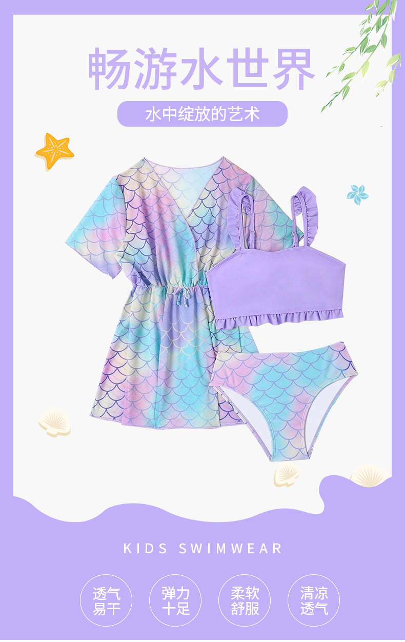 2025년 신형 아동 수영복 3피스 여아 스플릿 수영복 커버업 중대형 아동 크로스보더 수영복 대외 무역스토어 가기