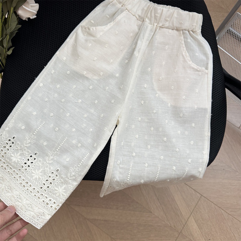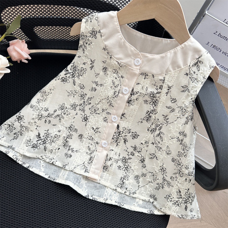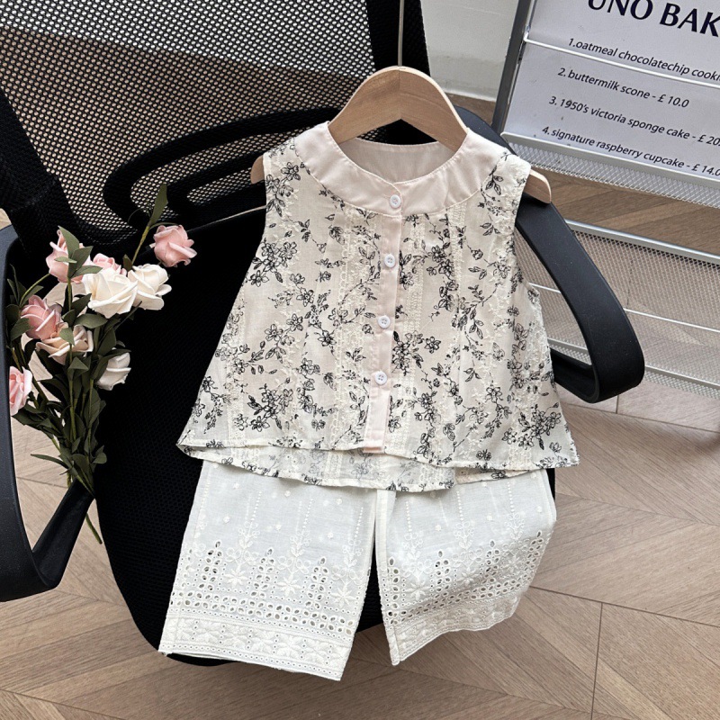 77302 여자 복고풍면과 린넨 조끼 여름 24 새로운 한국식 어린이 인형 셔츠 넓은 다리 바지 세트