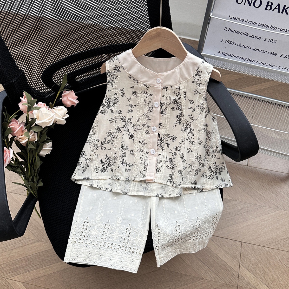 77302 여자 복고풍면과 린넨 조끼 여름 24 새로운 한국식 어린이 인형 셔츠 넓은 다리 바지 세트스토어 가기