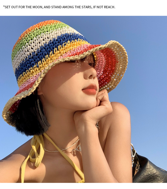 밀짚 모자 여성 현현 스타일 레인보우 밀짚 어부 모자 여성 여름 통기성 햇빛 선 스크린 버킷 모자 한국 스타일 작은 얼굴