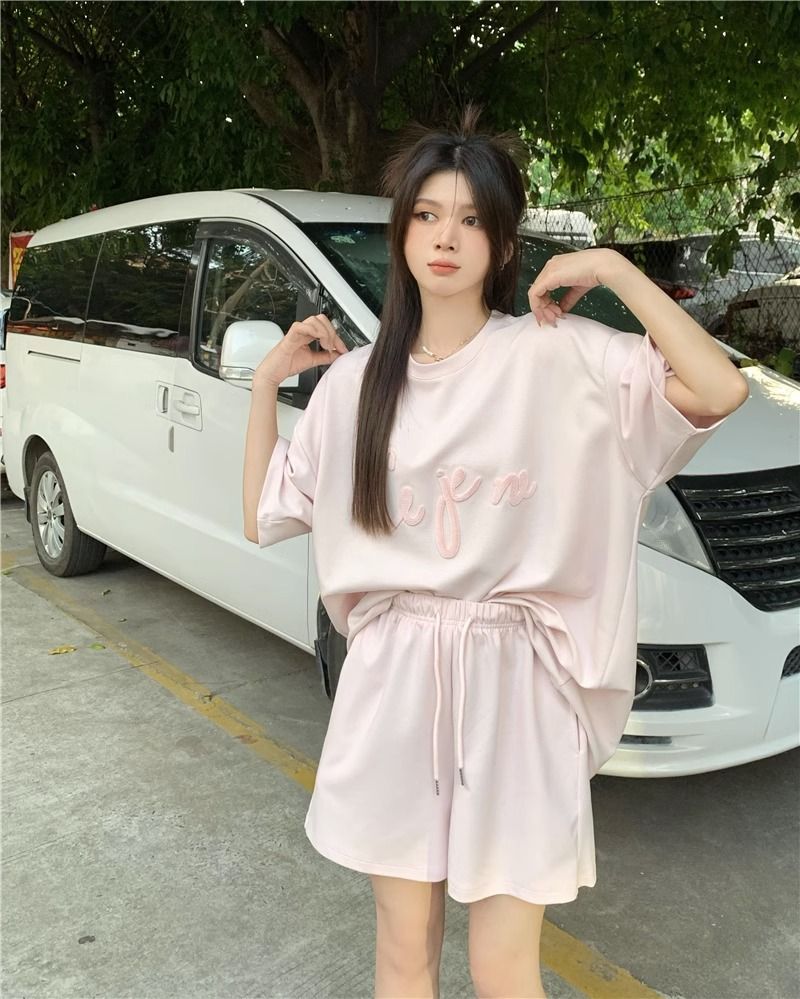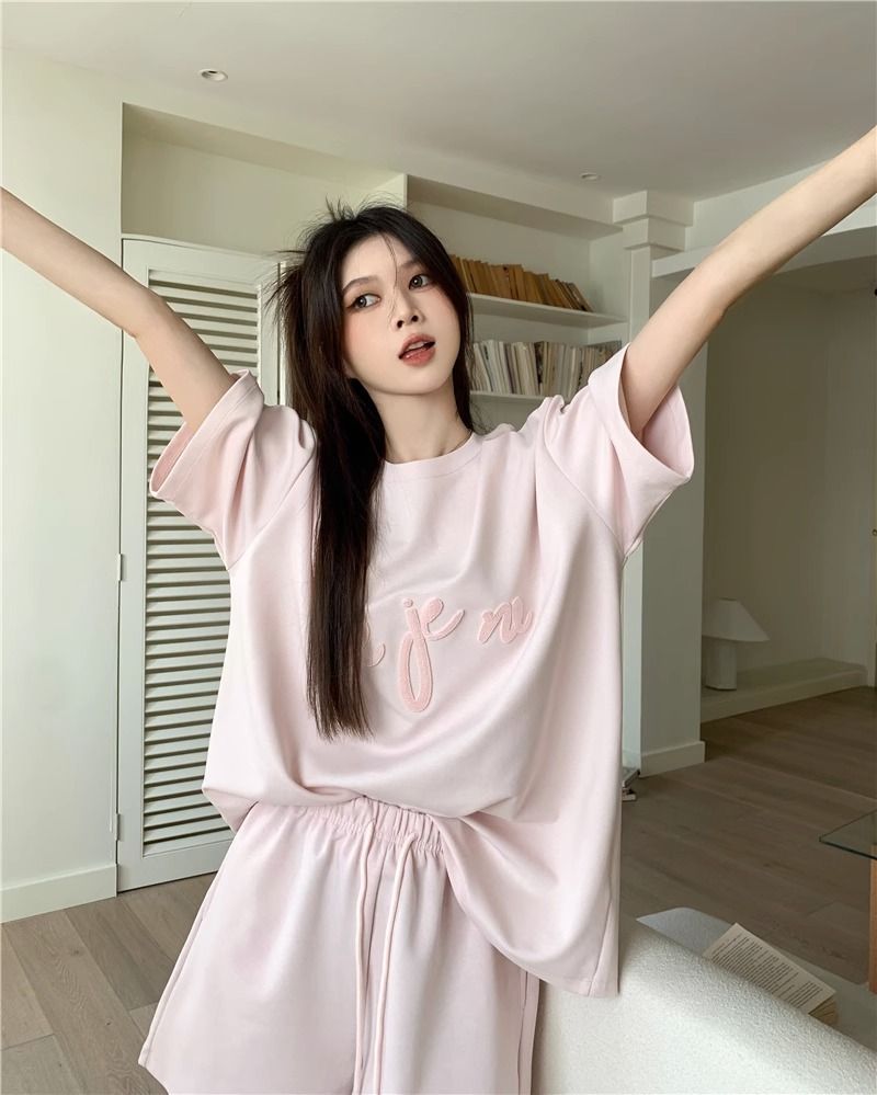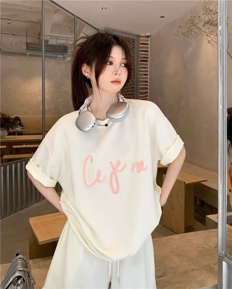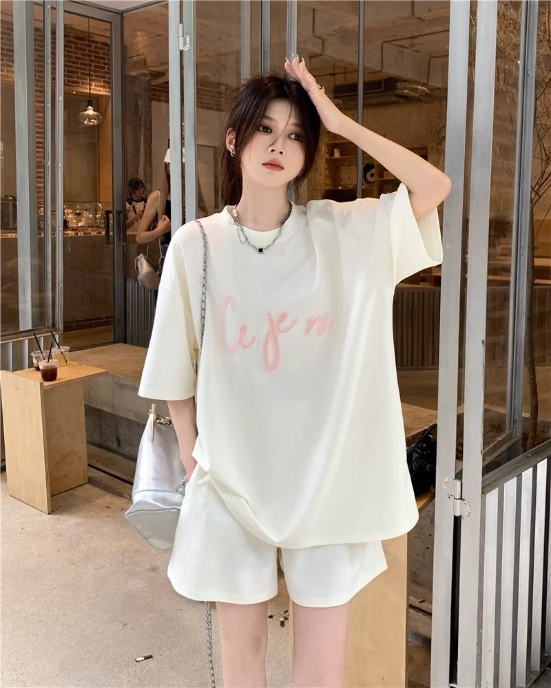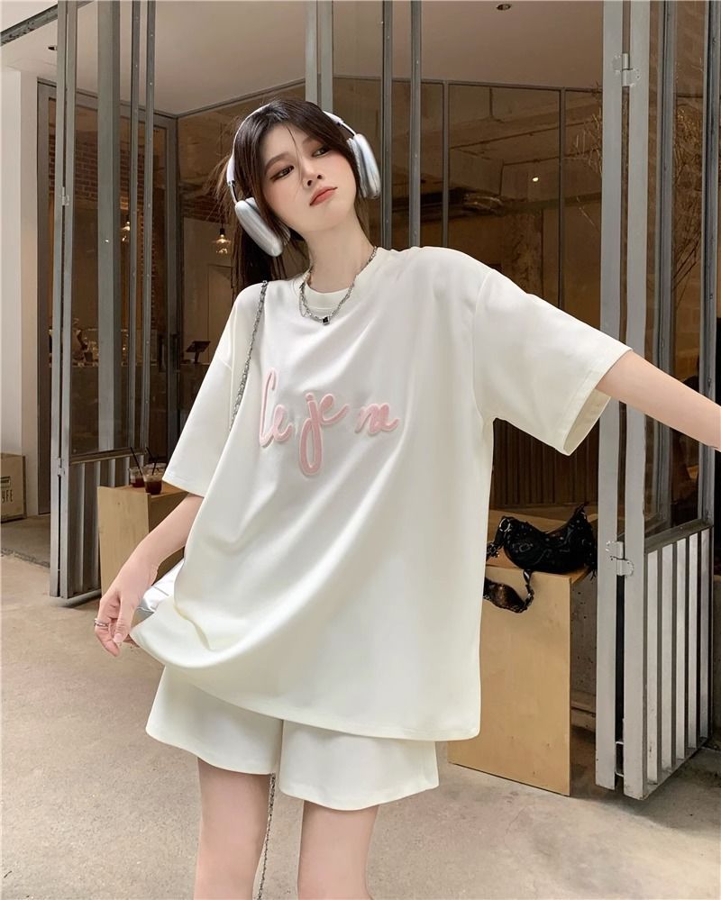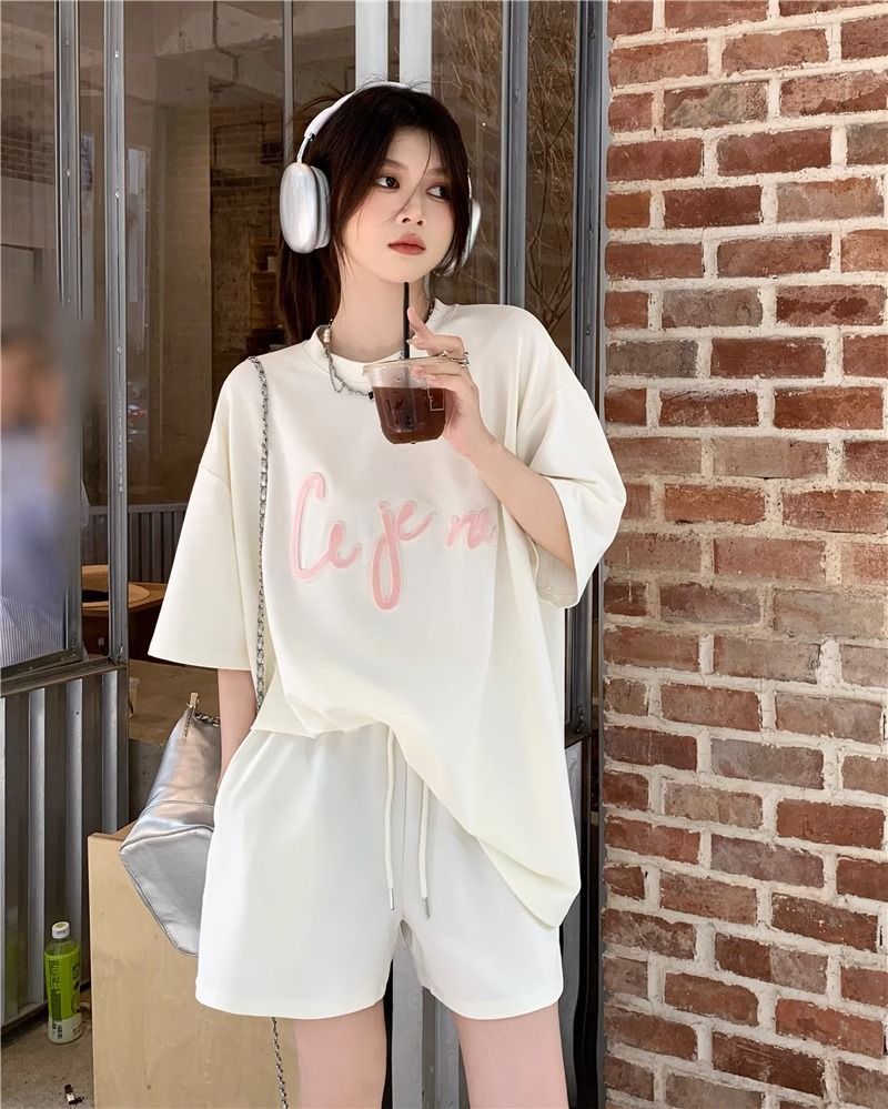 국경 간 플러스 사이즈 스포츠 레저 세트 여성 여름 학생 자수 느슨한 반팔 티셔츠 와이드 레그 투피스 세트