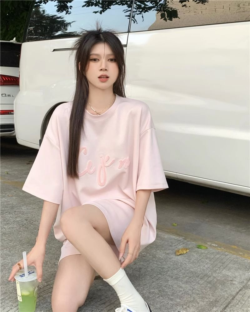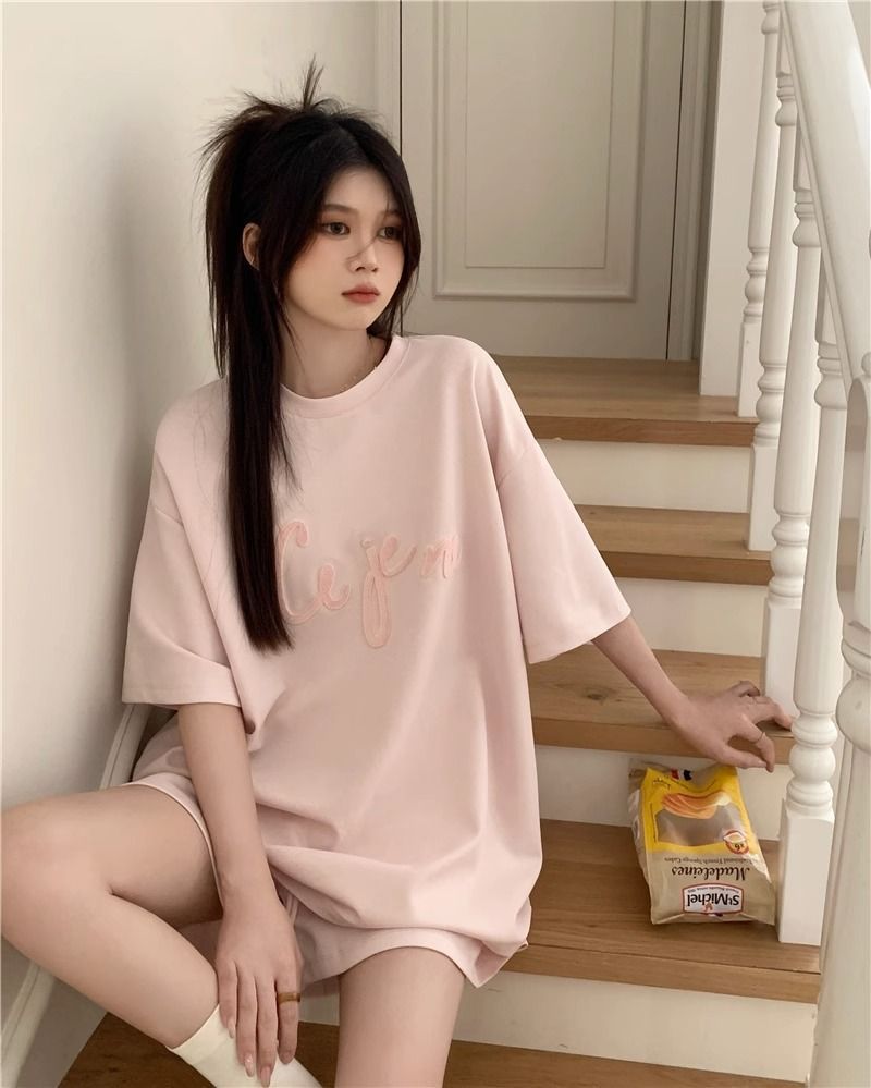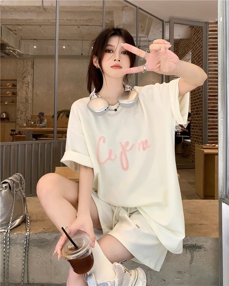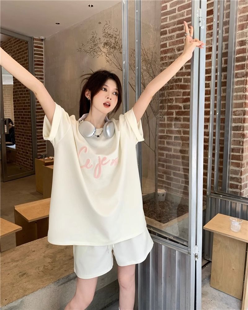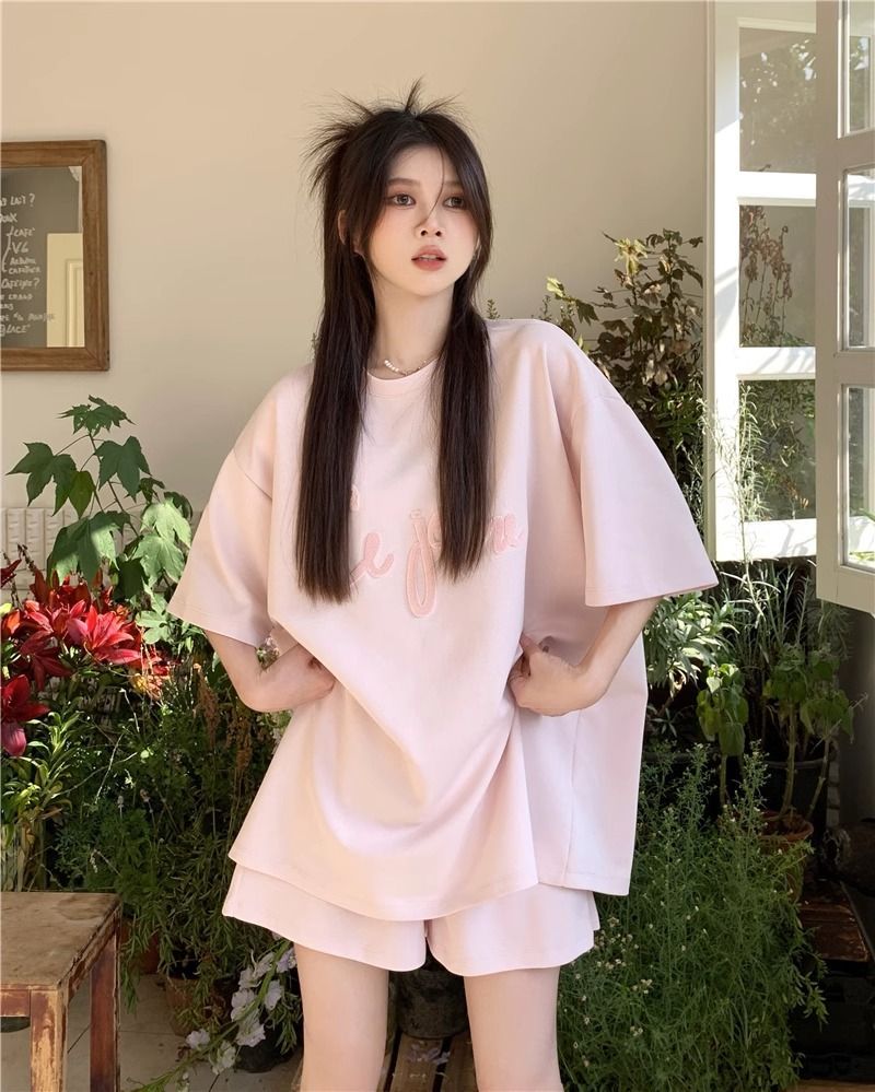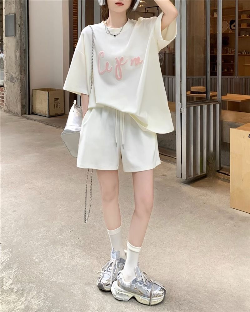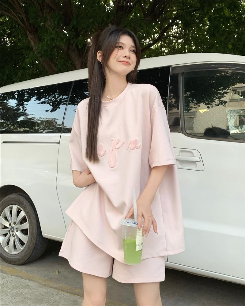 국경 간 플러스 사이즈 스포츠 레저 세트 여성 여름 학생 자수 느슨한 반팔 티셔츠 와이드 레그 투피스 세트