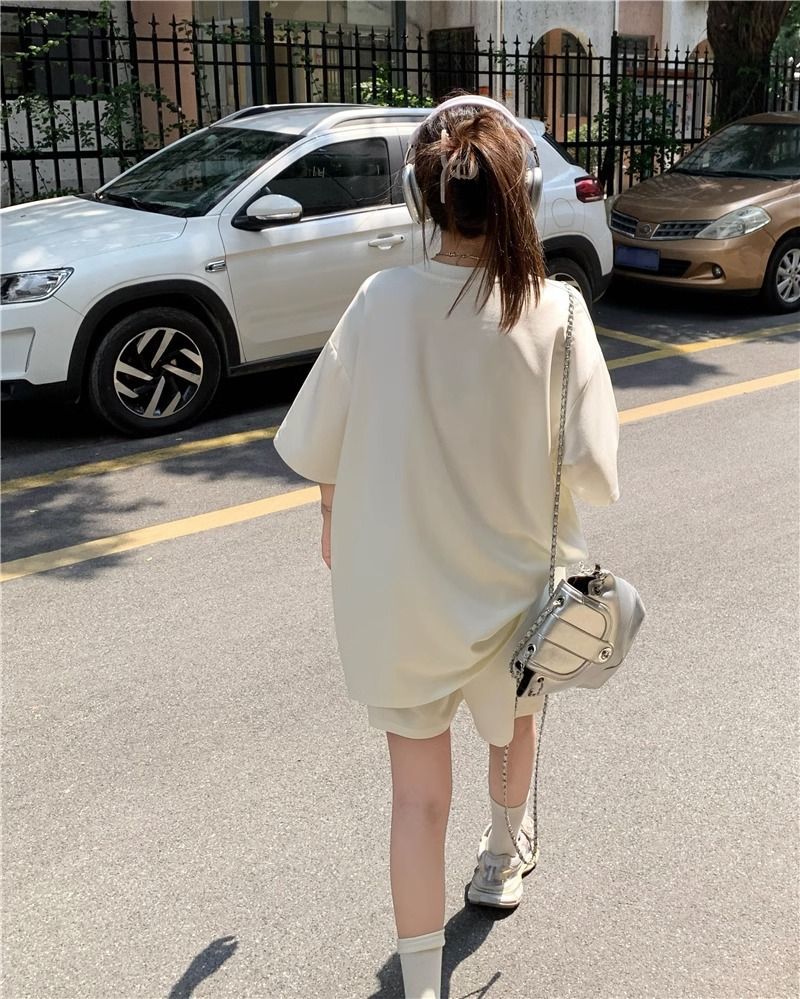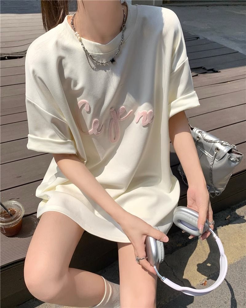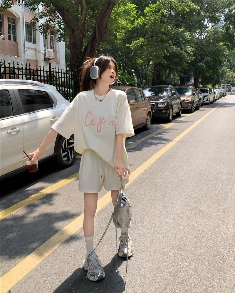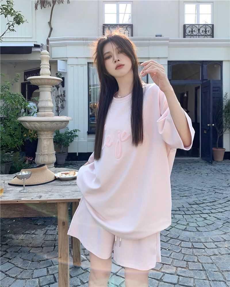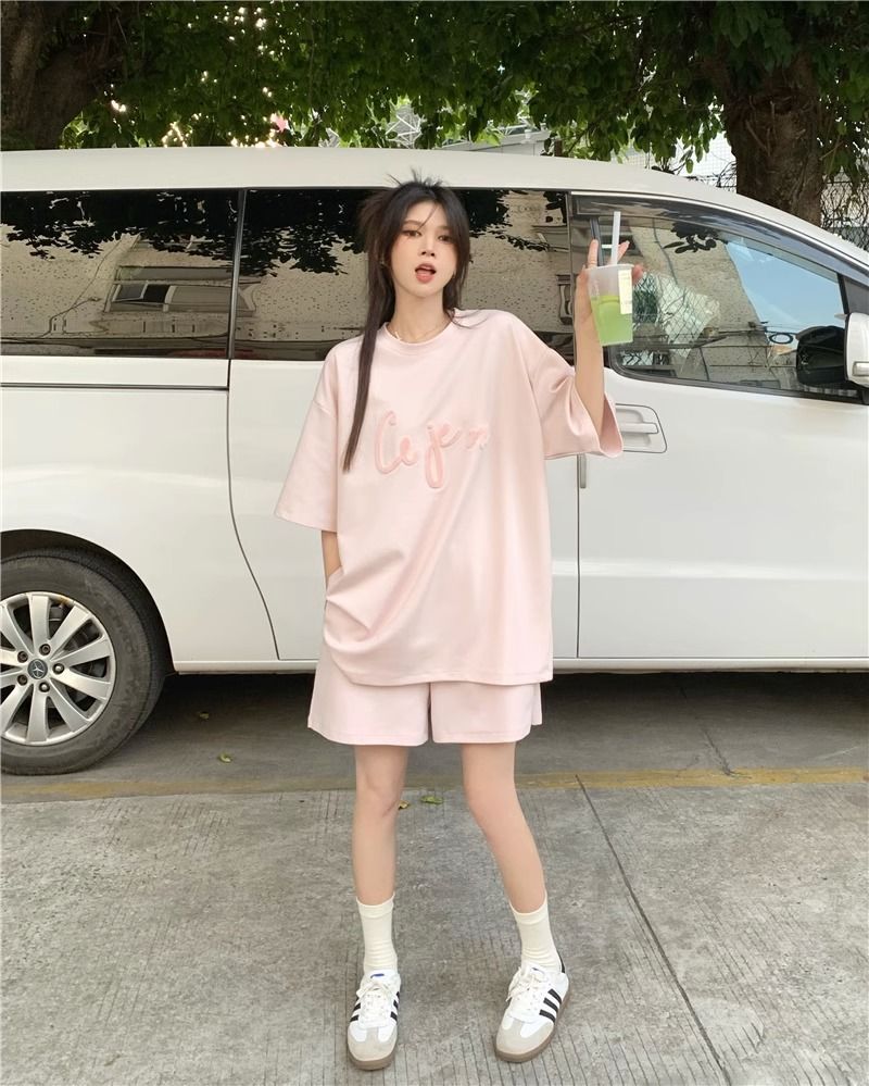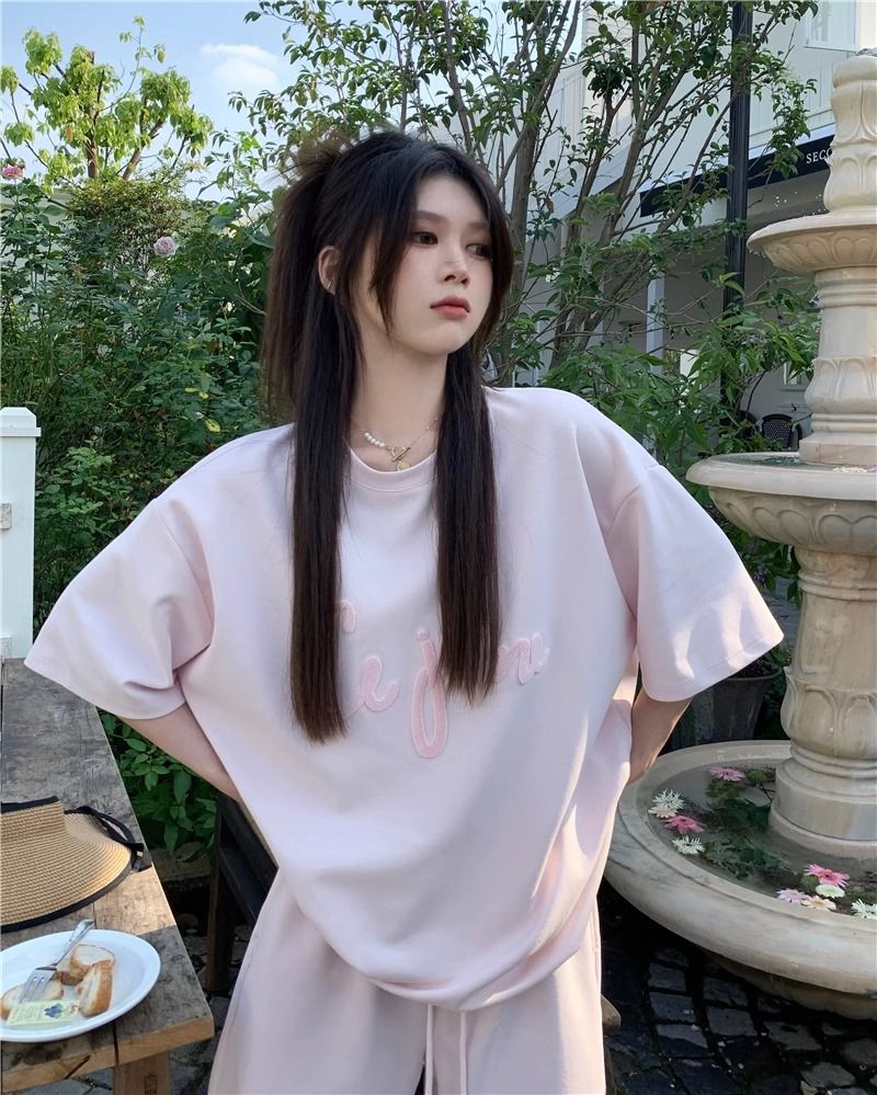국경 간 플러스 사이즈 스포츠 레저 세트 여성 여름 학생 자수 느슨한 반팔 티셔츠 와이드 레그 투피스 세트스토어 가기