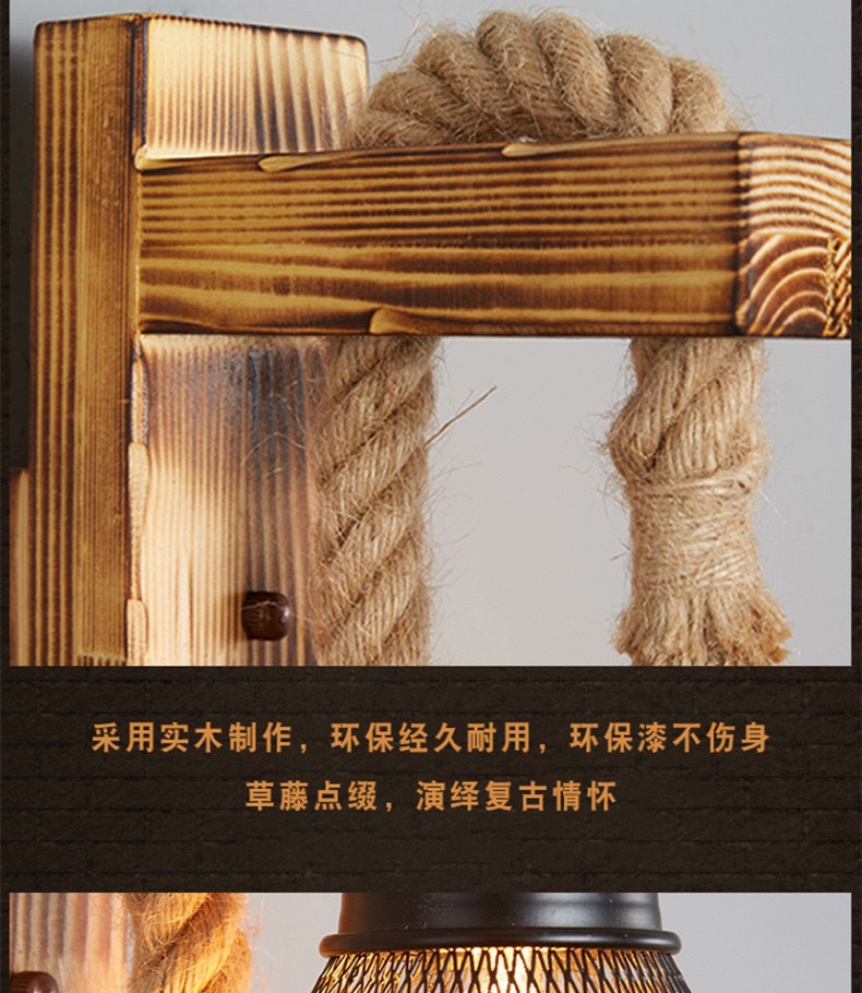 산업 스타일 레트로 독특한 벽 램프 골동품 나무 장식 침대 옆 홈스테이 목회 레스토랑 대마 로프 나무 벽 램프스토어 가기