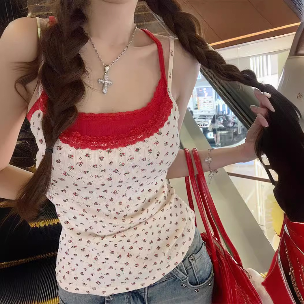 순수한 욕망 투피스 꽃 슬링 조끼 여성의 여름 달콤하고 뜨거운 섹시한 도파민 슬림 핏 쇼트베이스 탑