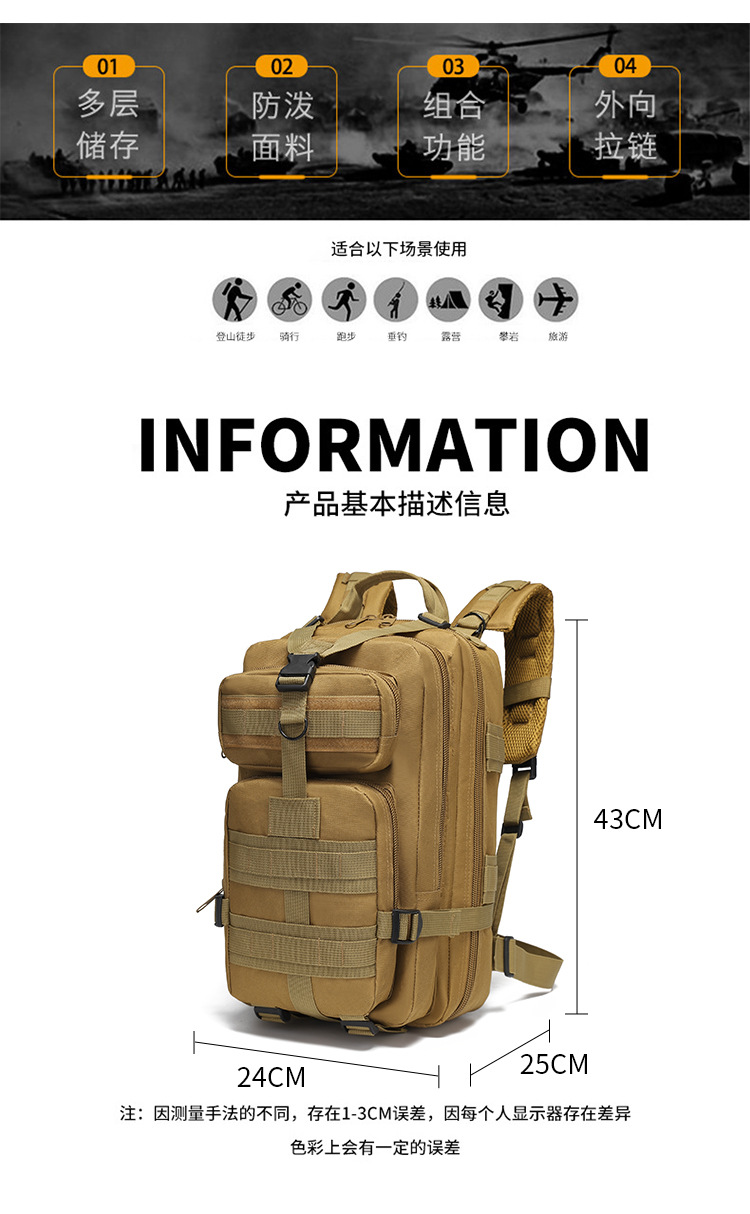 재고 도매 야외 전술 가방 훈련 장비 캠핑 배낭 스포츠 등산객 어깨 가방 3P 배낭 싱글
