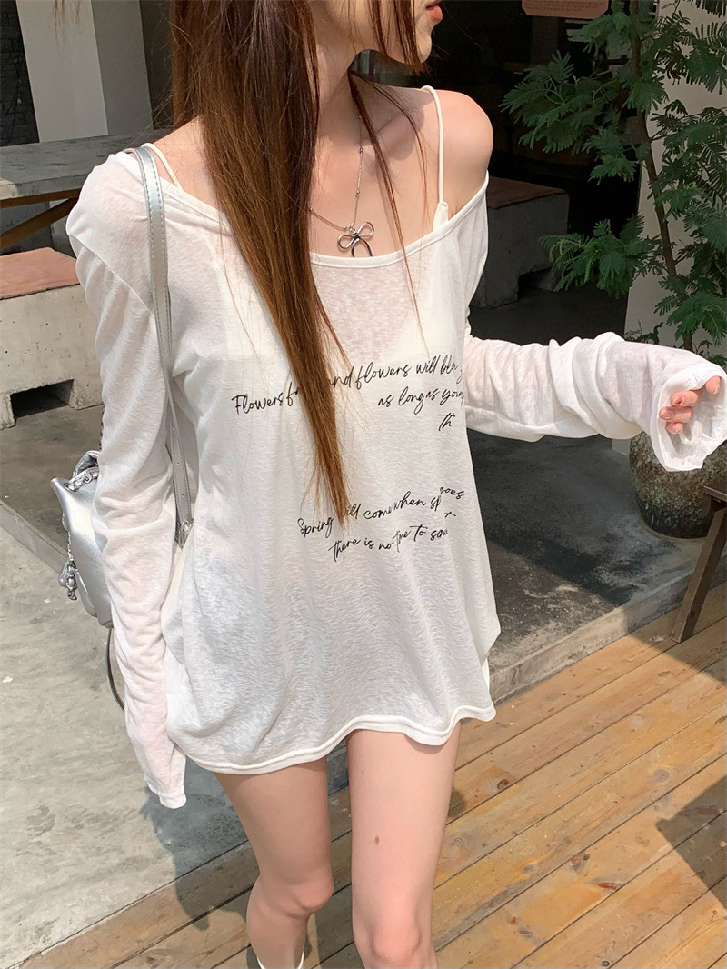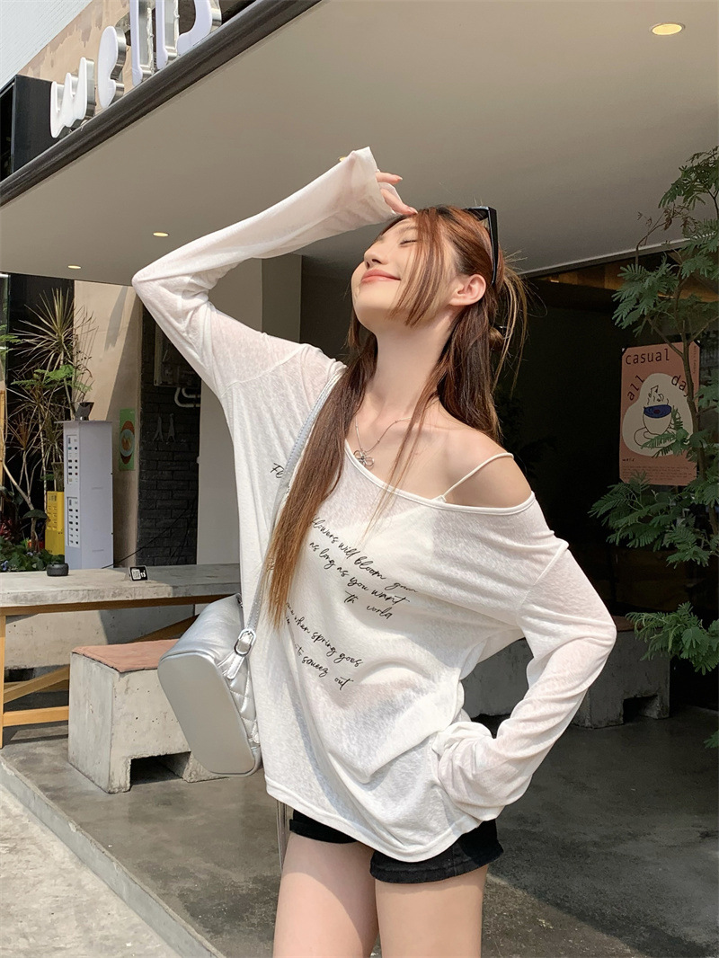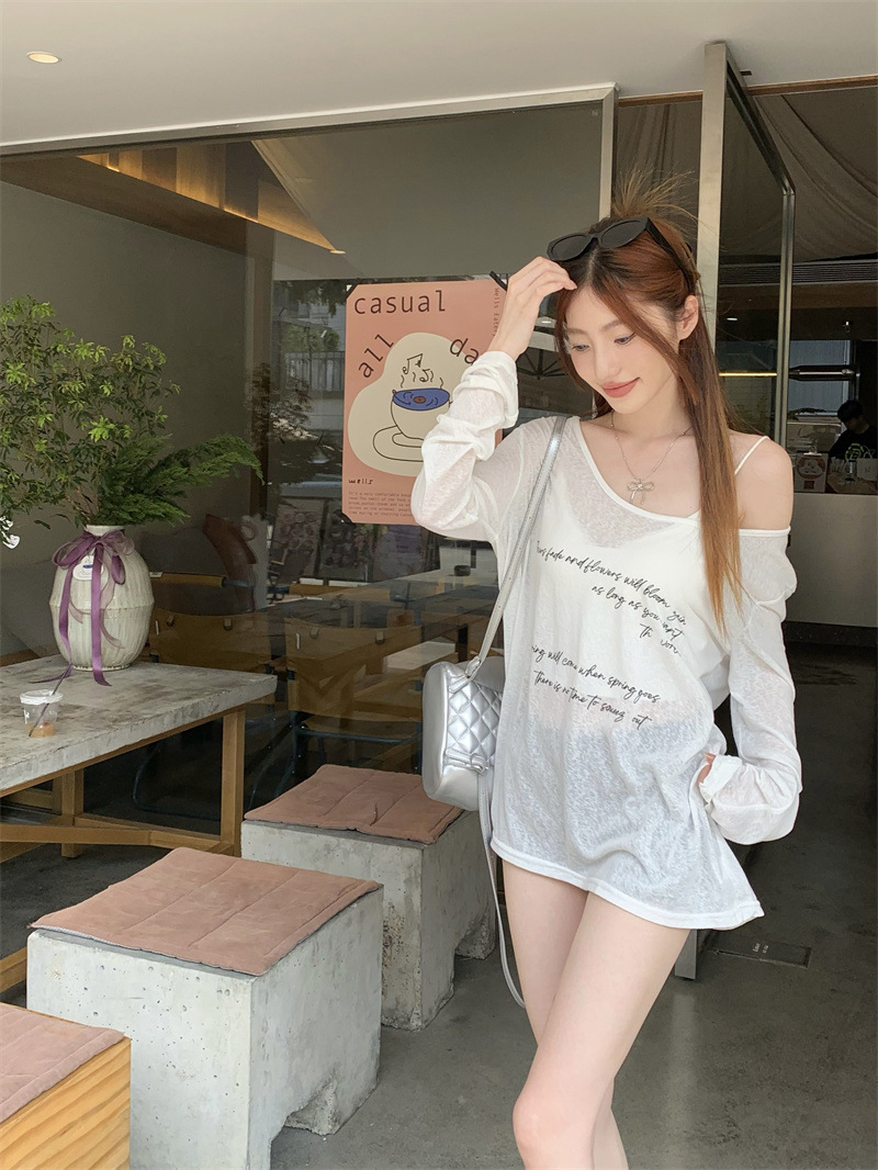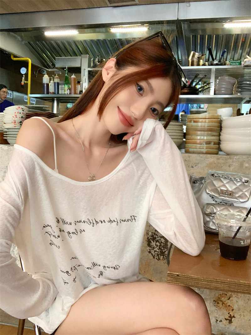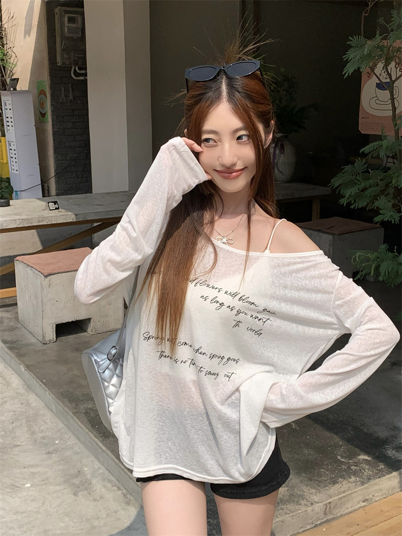 여성을위한 게으른 스타일 문자 인쇄 오프 숄더 긴팔 티셔츠 봄 루즈 캐주얼 슬리밍 다목적 얇은 자외선 차단 탑