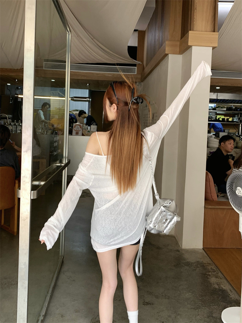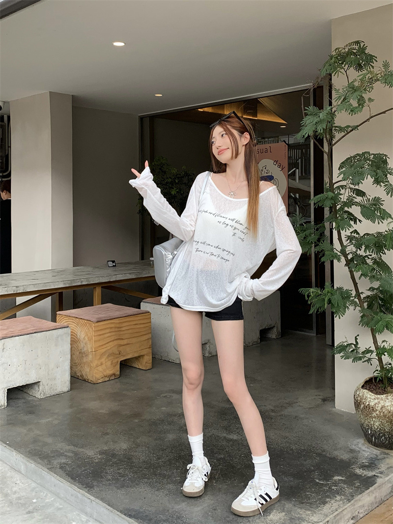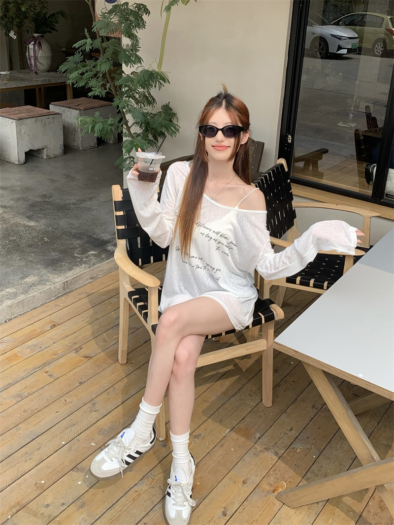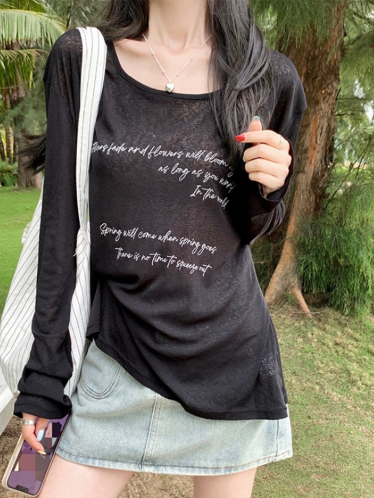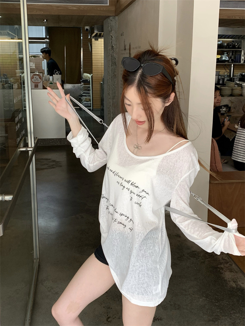 여성을위한 게으른 스타일 문자 인쇄 오프 숄더 긴팔 티셔츠 봄 루즈 캐주얼 슬리밍 다목적 얇은 자외선 차단 탑