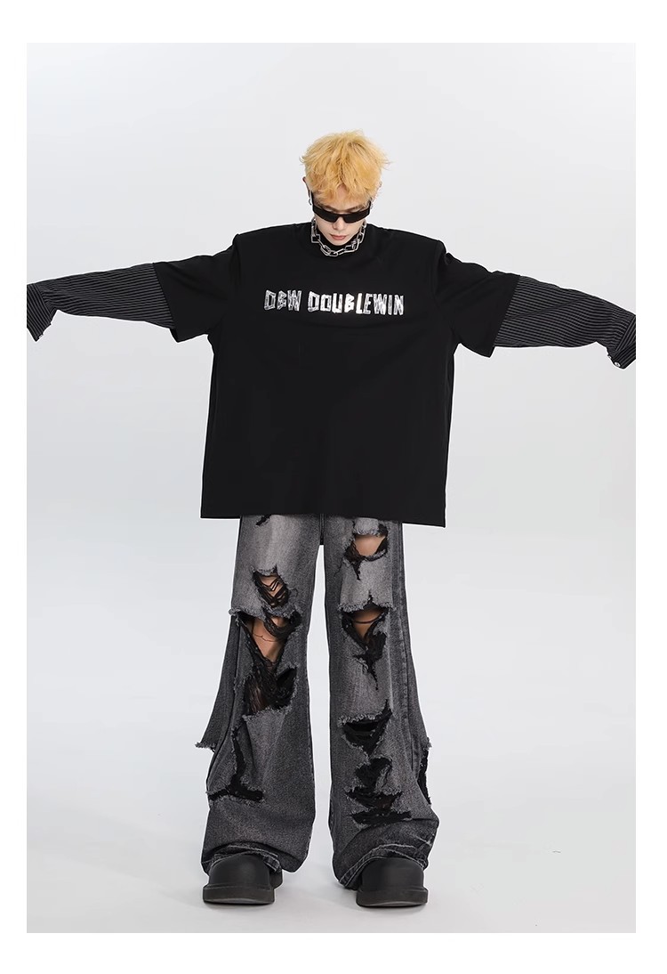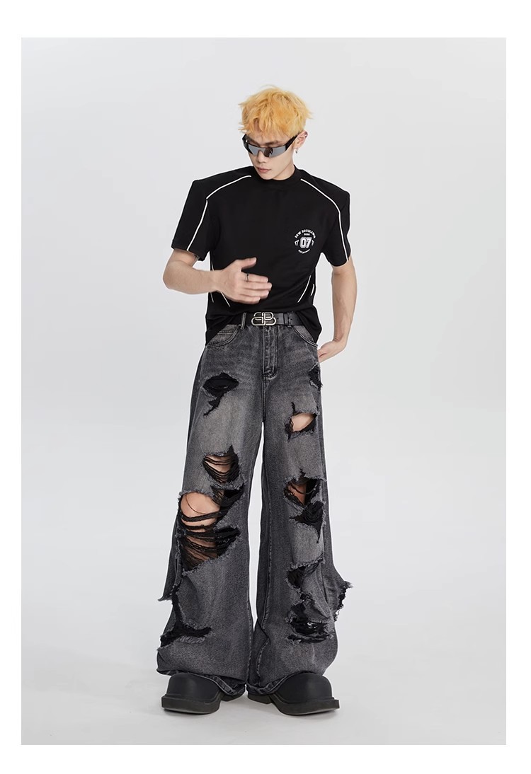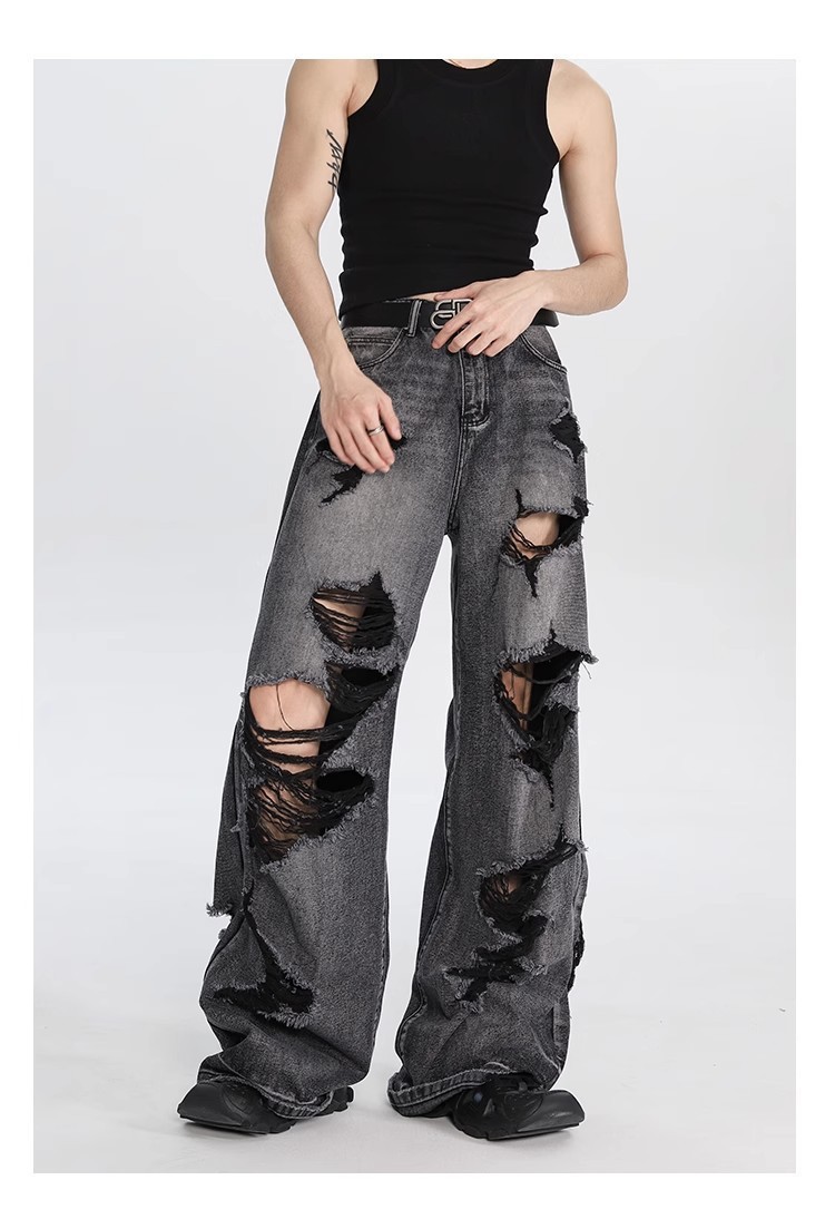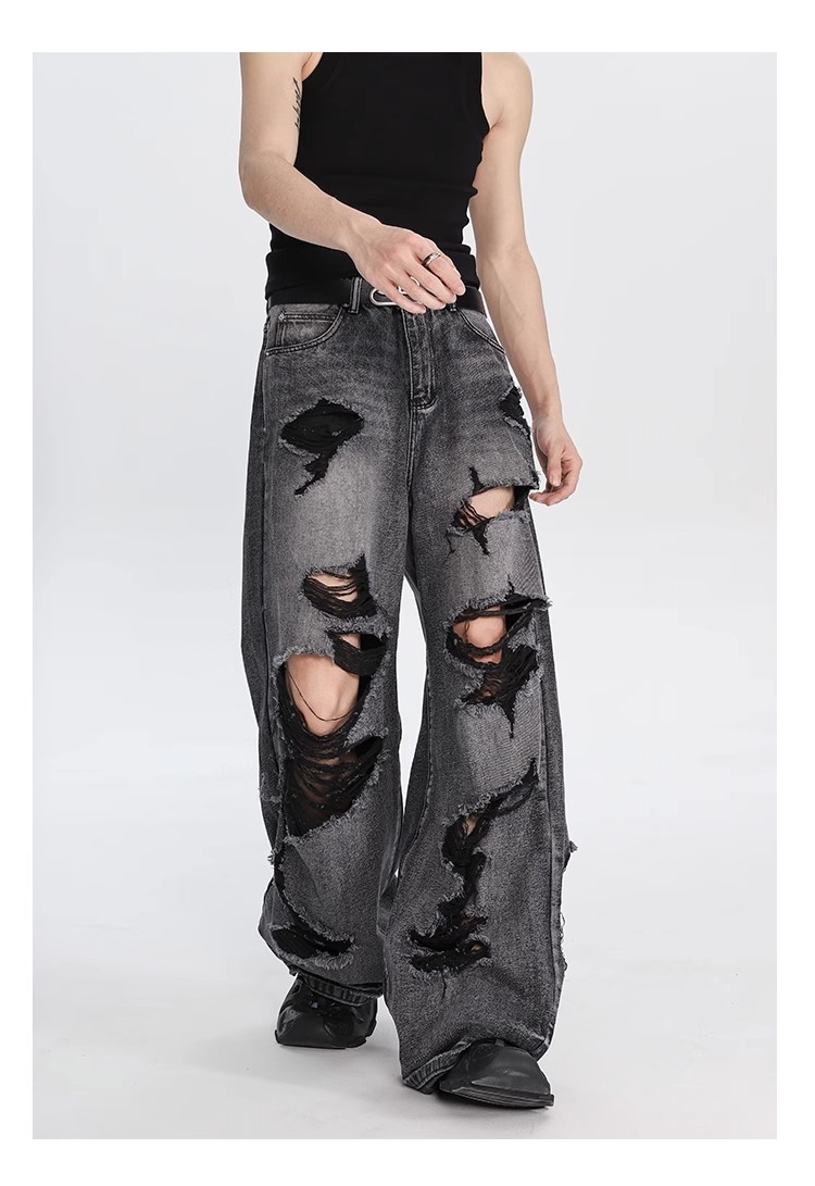 미국식 하이 스트리트 트렌디 남녀 동일 컷 거지의 데님 바지 올 매치 힙합 틈새 디자인 트렌디 바지