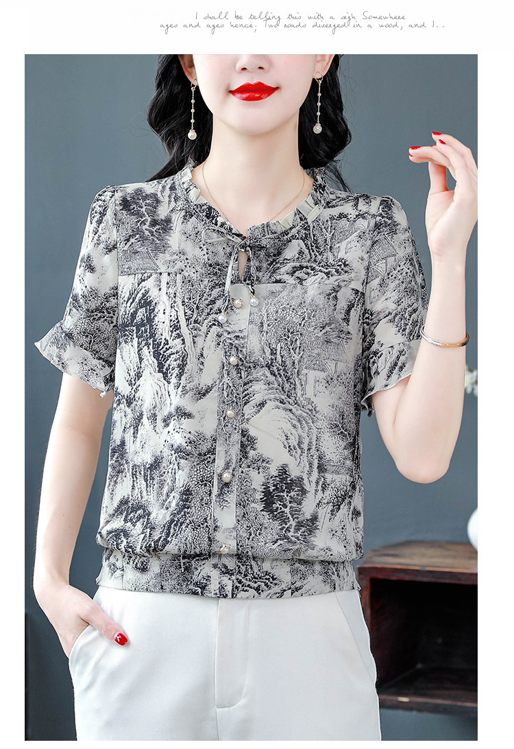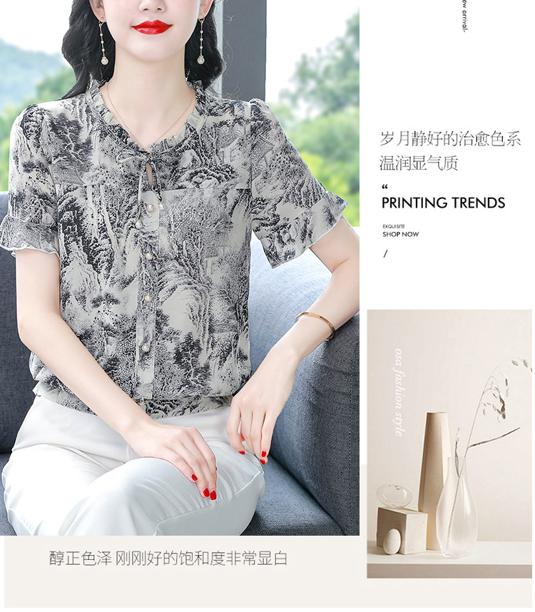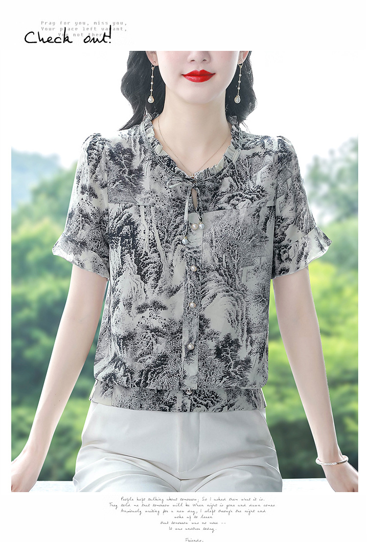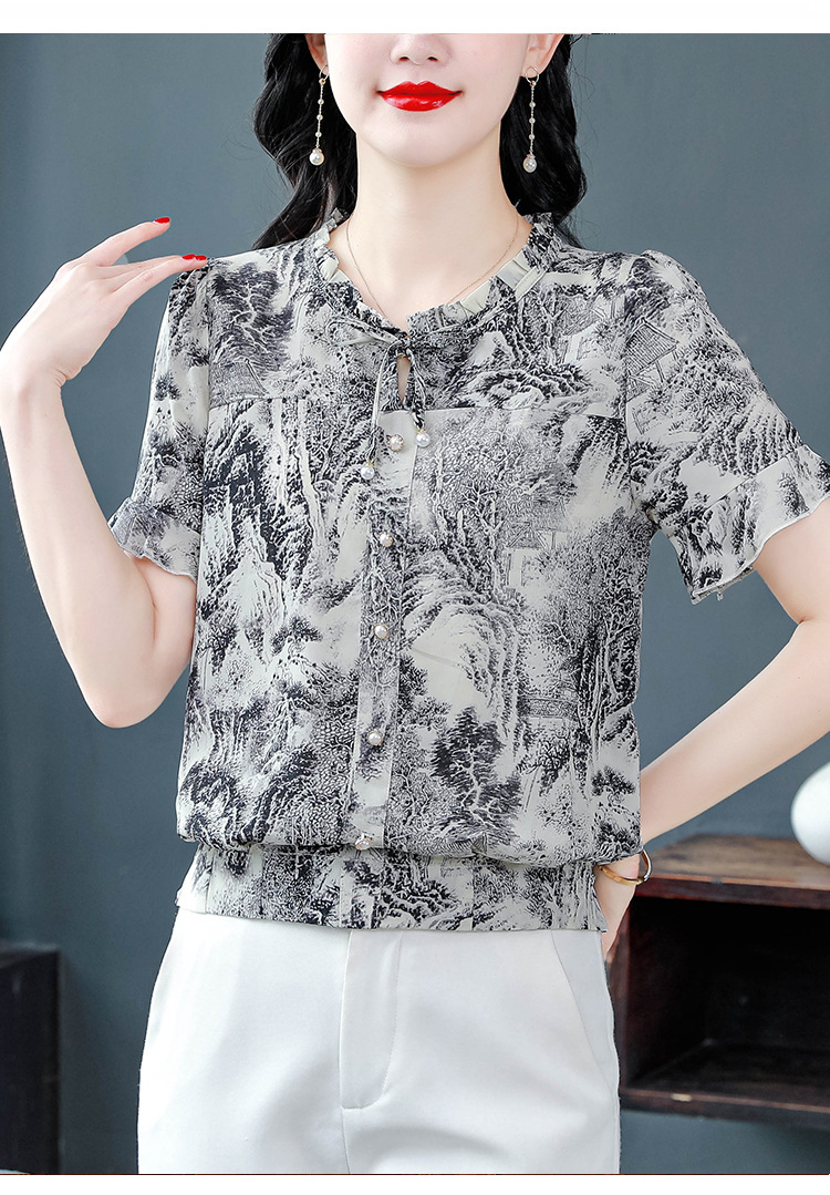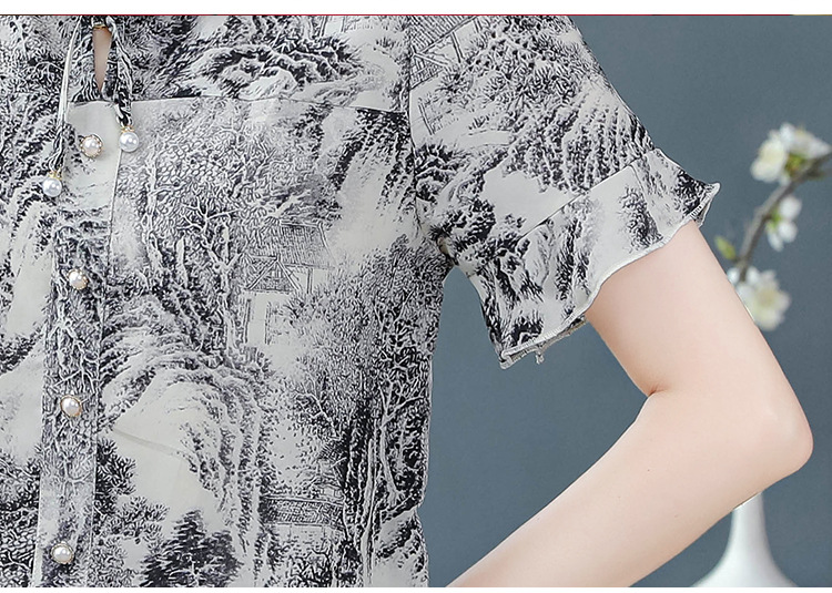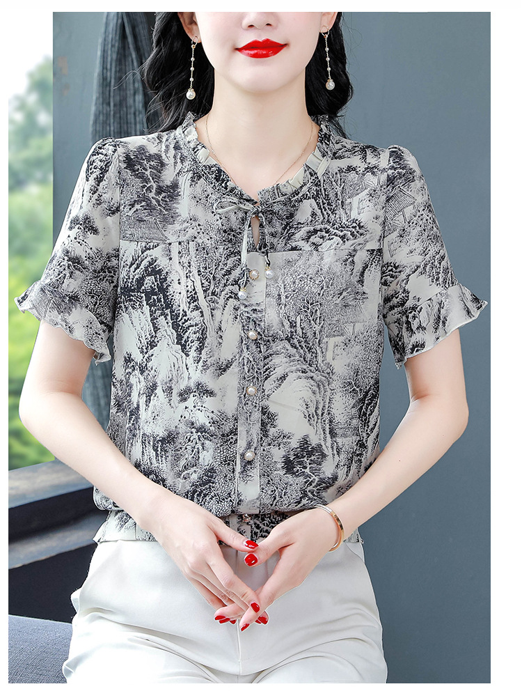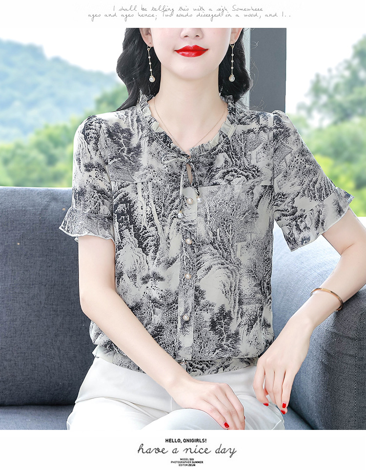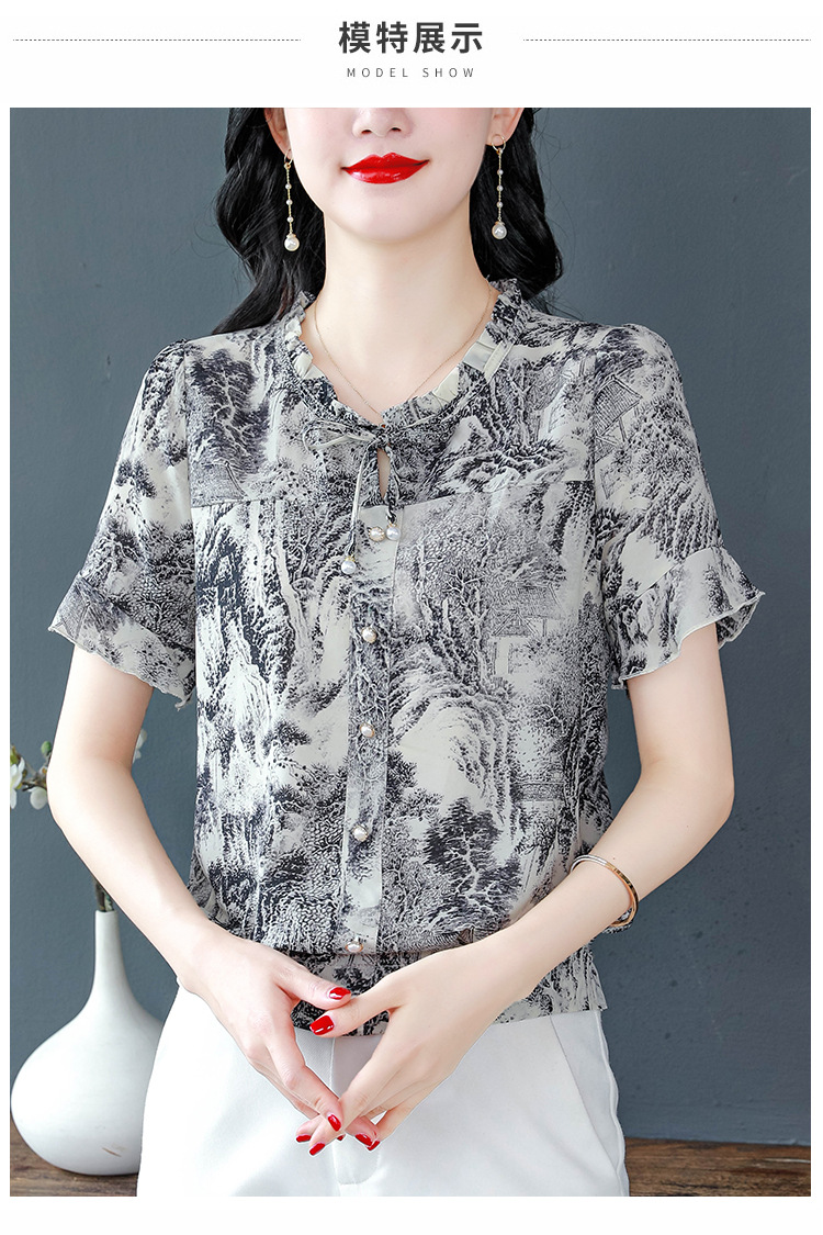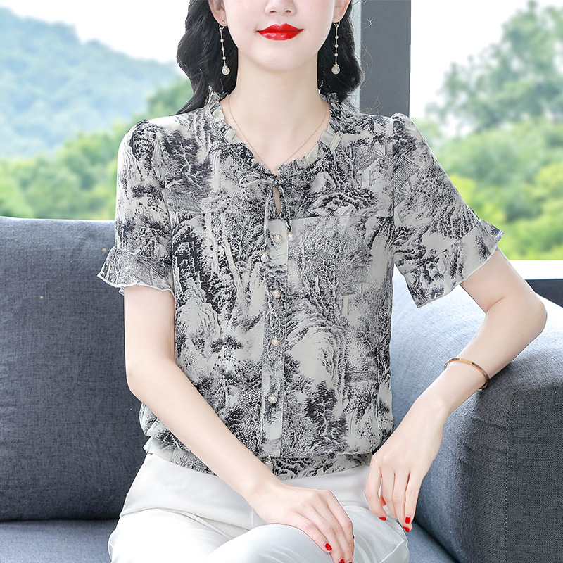 공장 직접 2024 여름 새로운 짧은 소매 최고 여성 패션 조커 꽃 쉬폰 셔츠 기질 인쇄 여성 의류