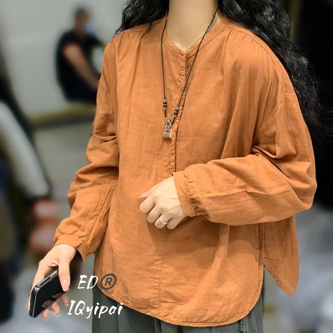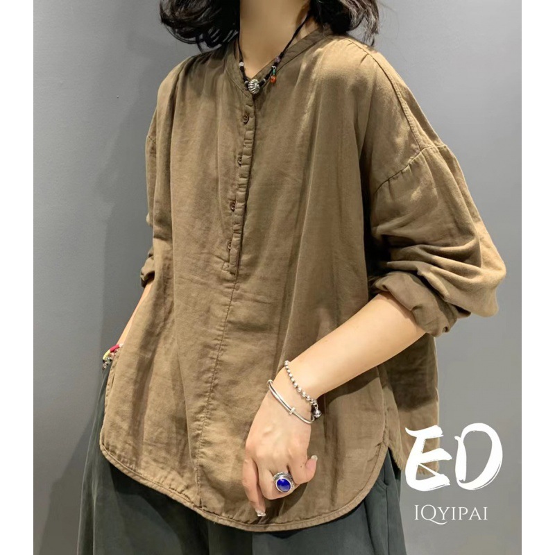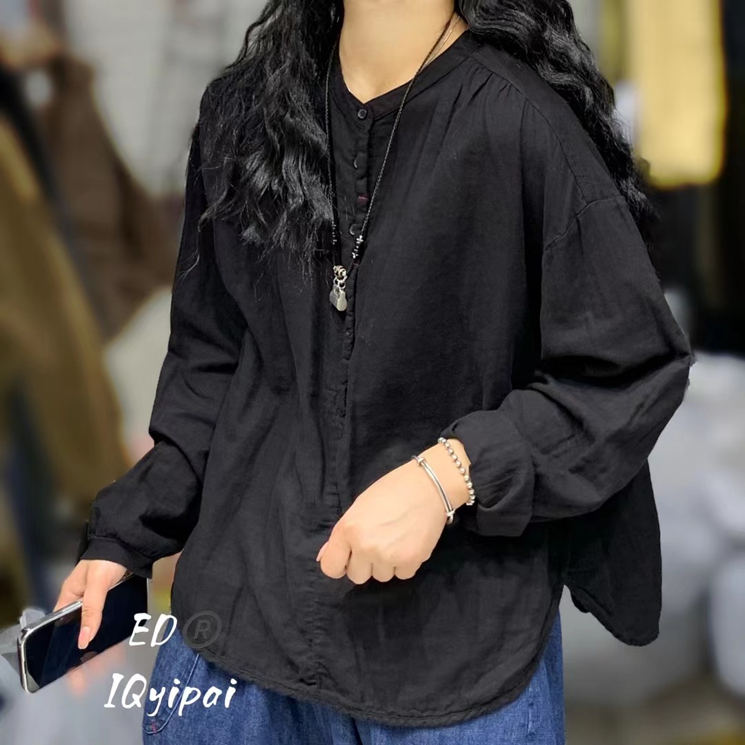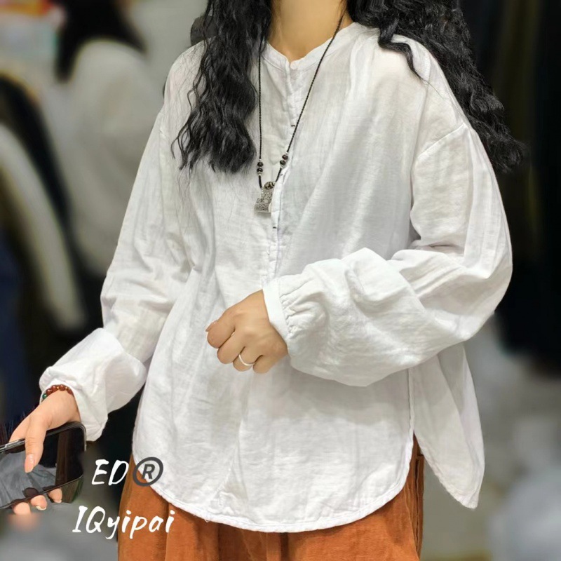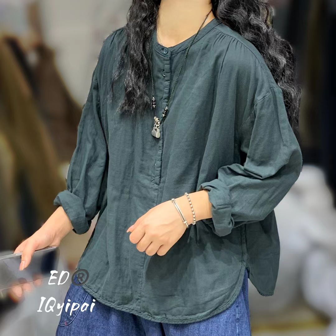 Ed3626 더블 레이어 코튼 및 리넨 라운드 넥 오픈 튜브 셔츠 2024 여성을위한 새로운 느슨한 플러스 사이즈 캐주얼 티셔츠베이스 탑스토어 가기