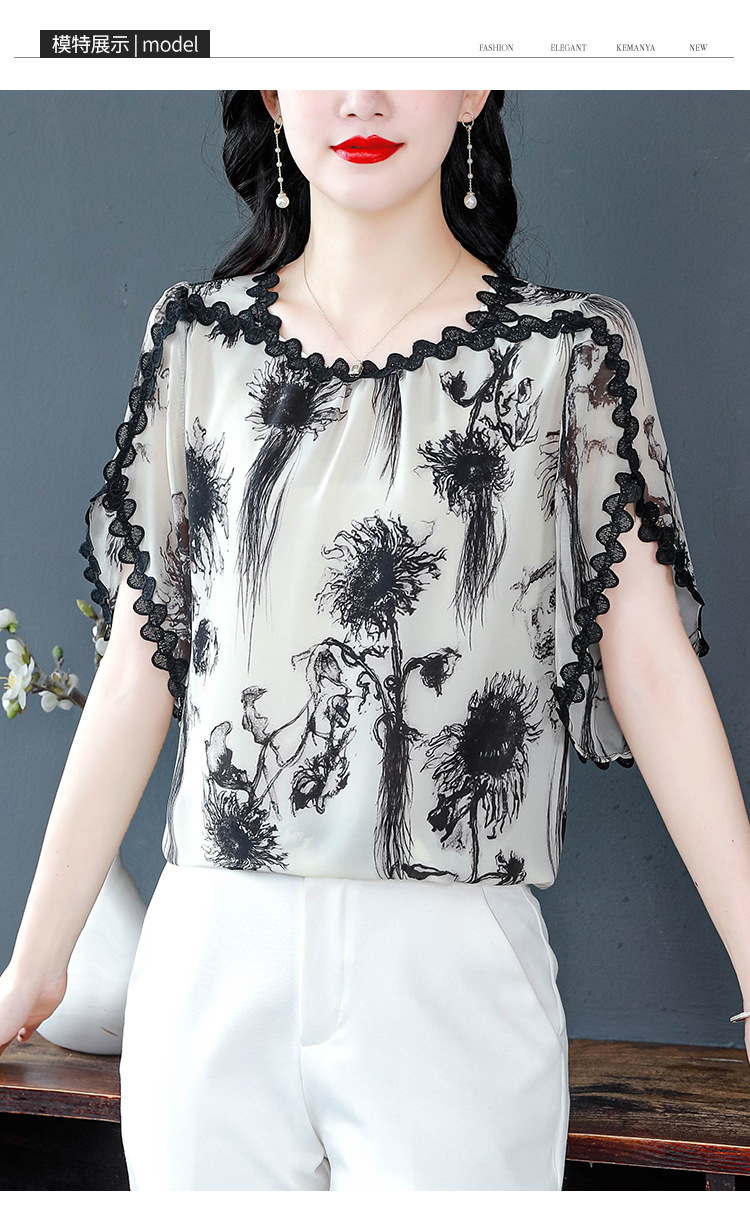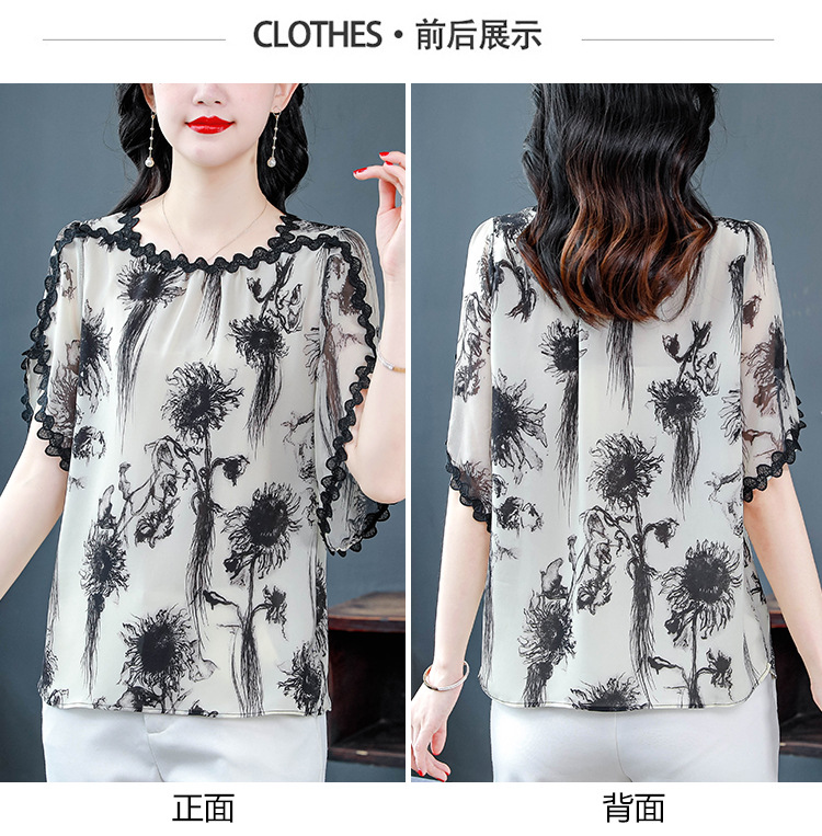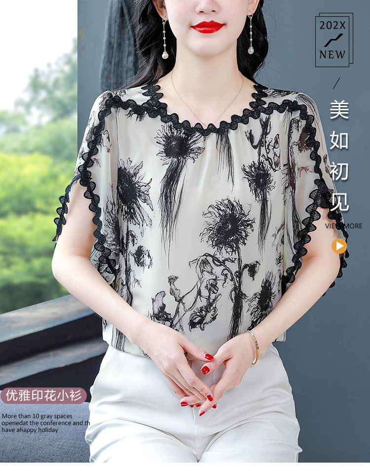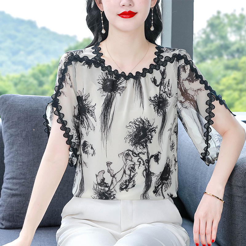 우아한 인쇄 된 여성의 2024 셔츠 여름 새로운 반팔 탑 레이스 바느질 패션 올 매치 꽃 쉬폰 셔츠