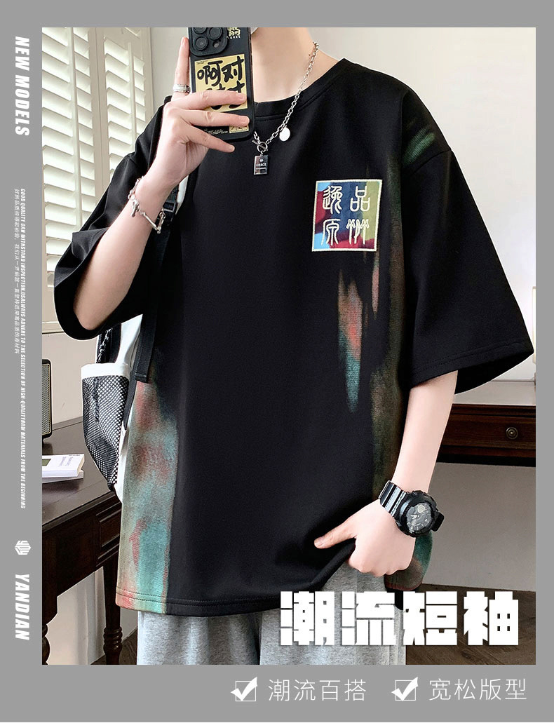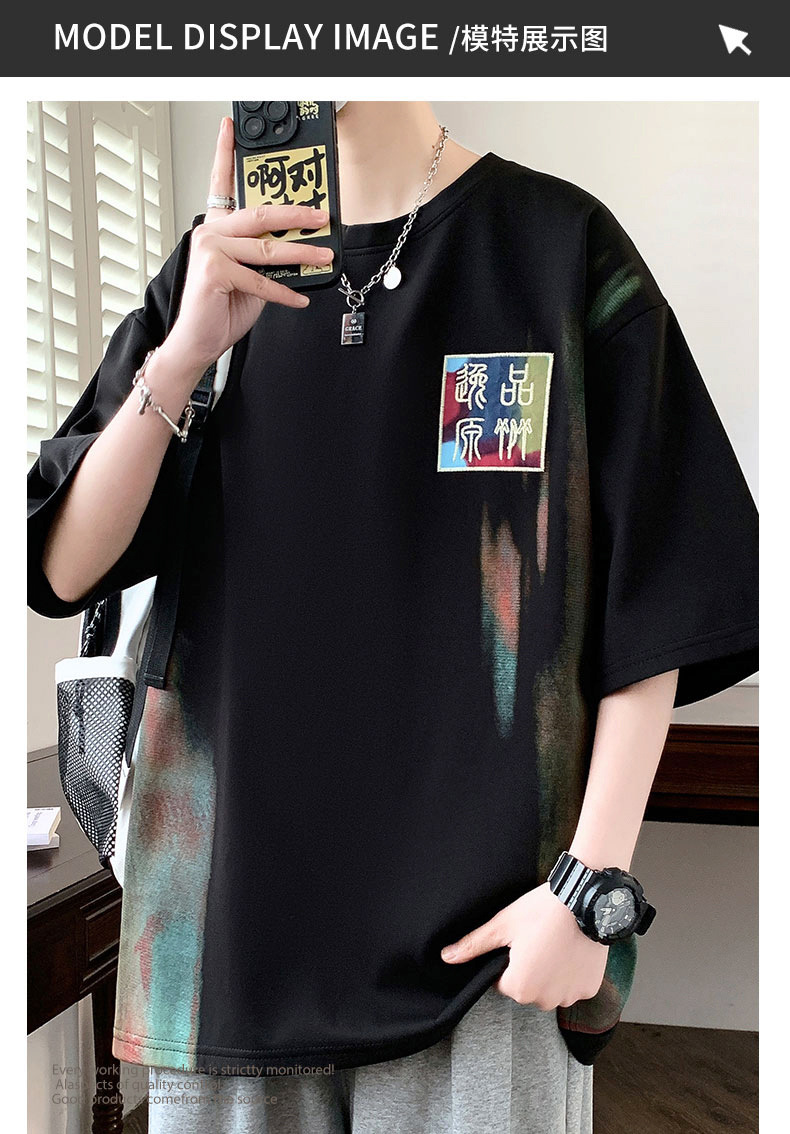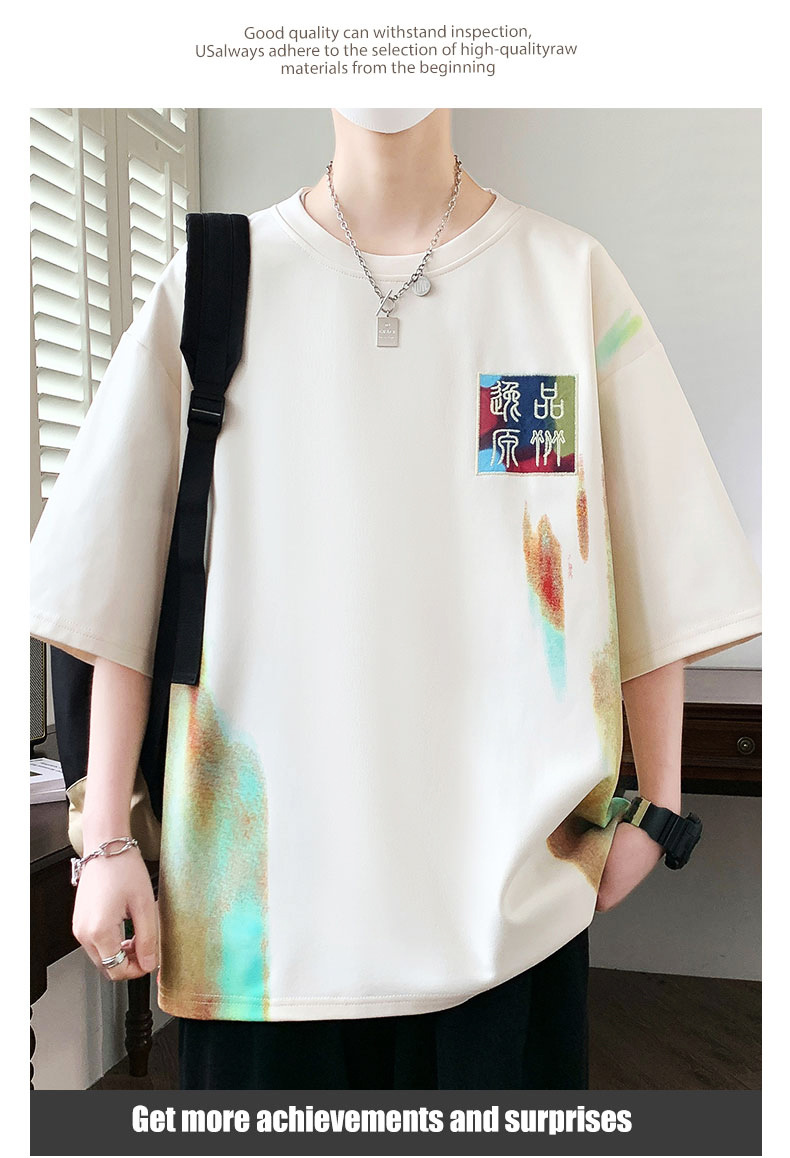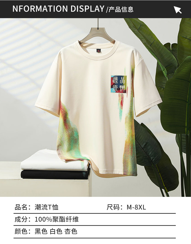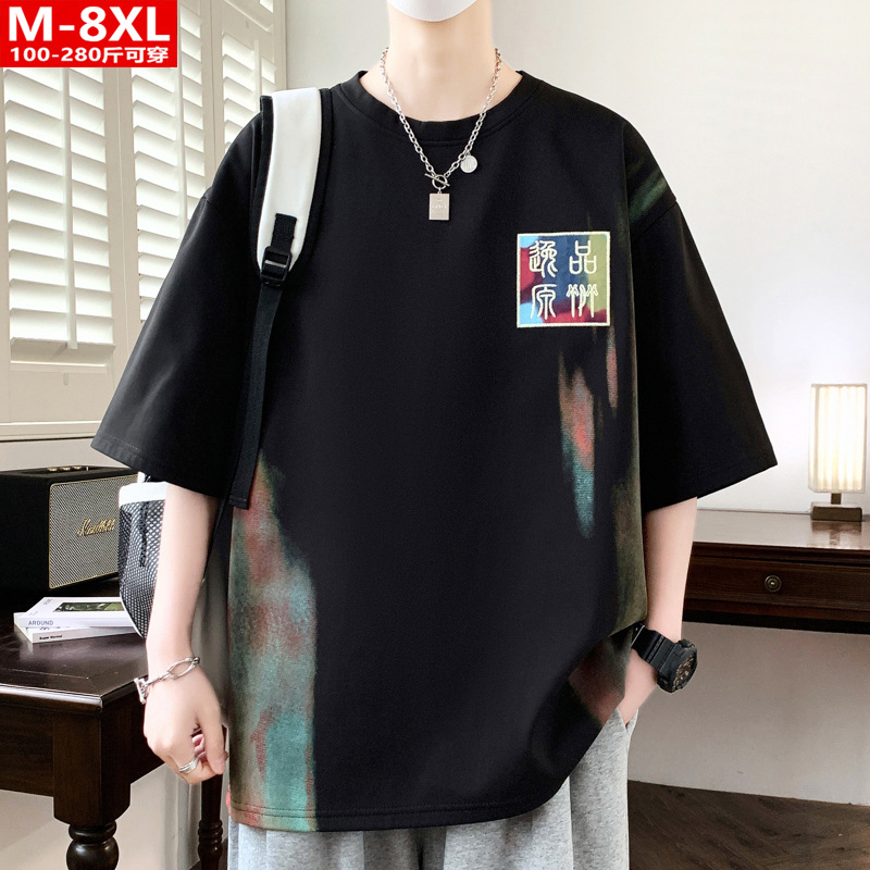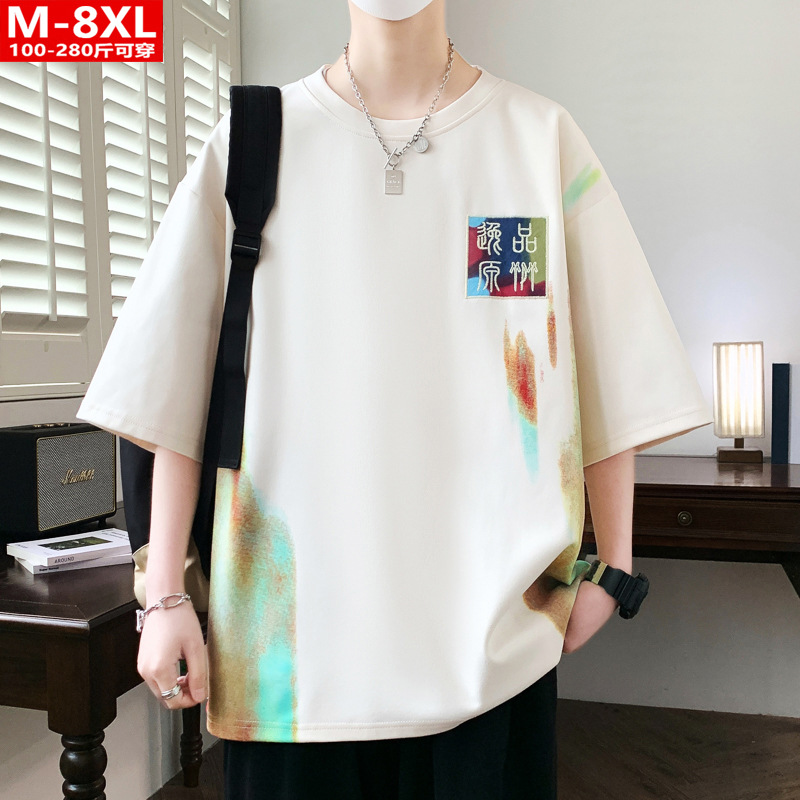 여름 유행 홍콩 스타일 남성 인쇄 라운드 넥 반팔 티셔츠 지방 남성 플러스 사이즈 플러스 사이즈 느슨한 캐주얼 티셔츠스토어 가기