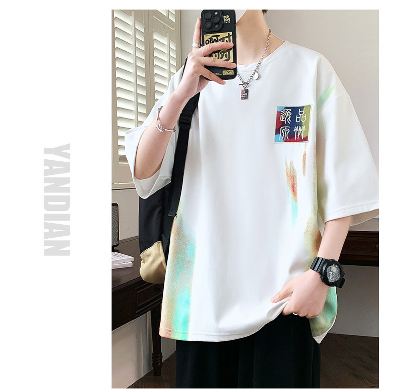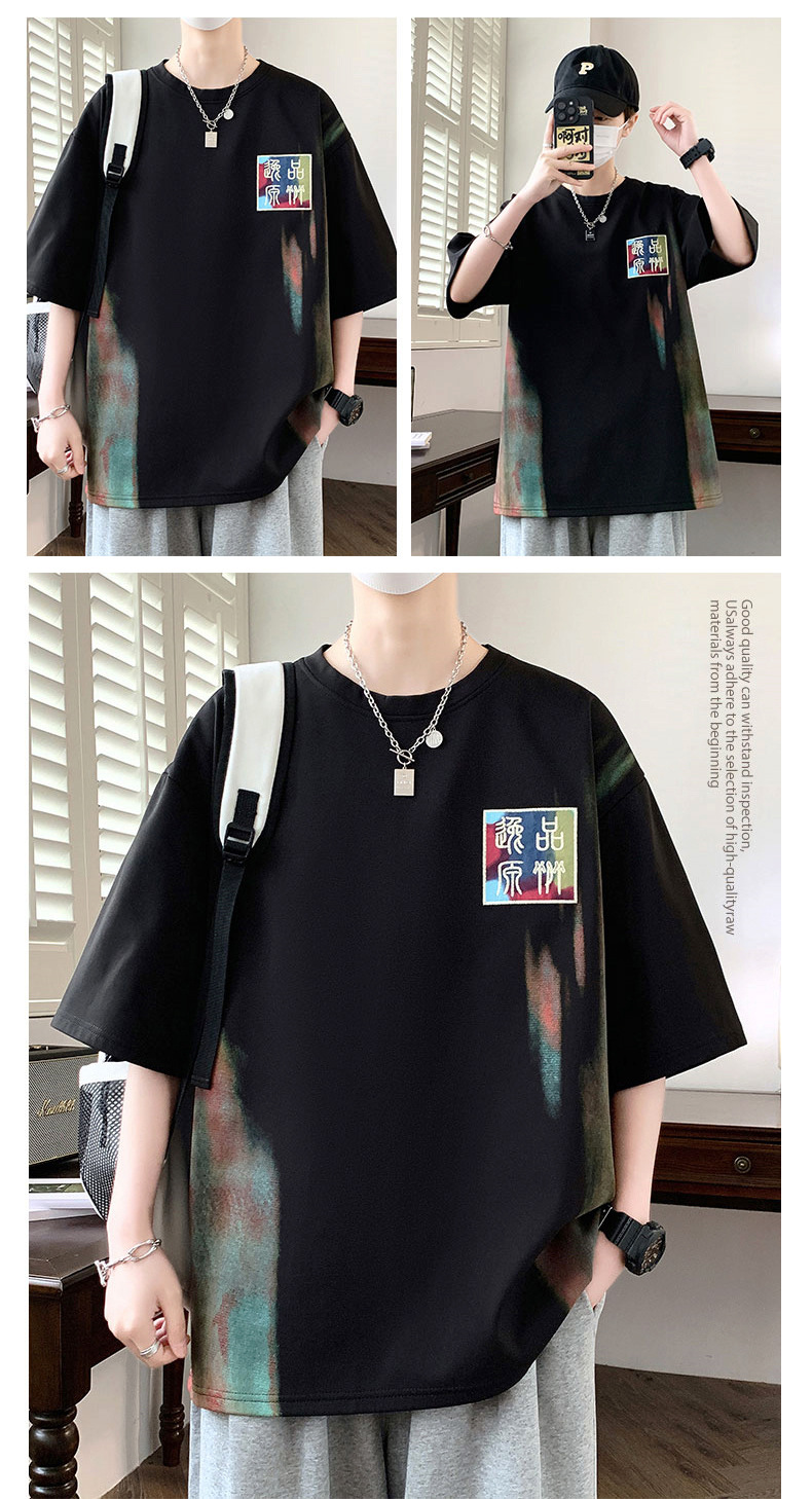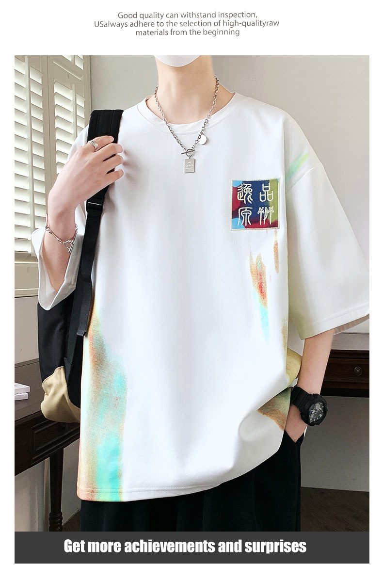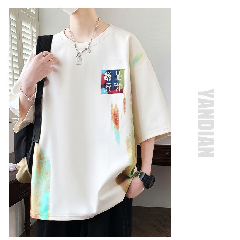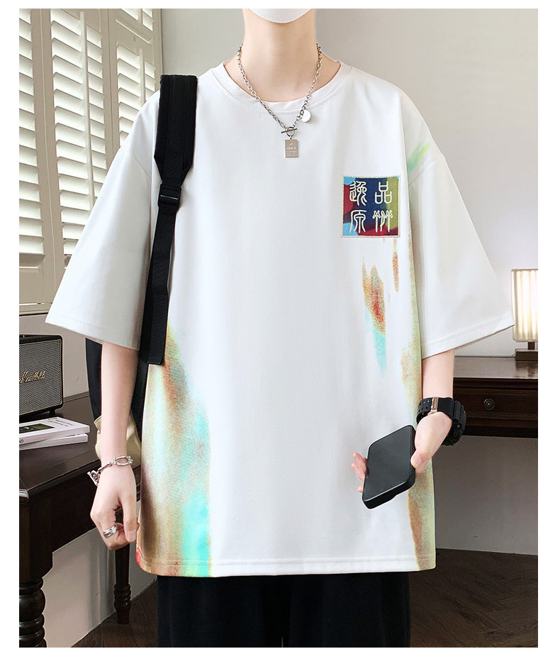 여름 유행 홍콩 스타일 남성 인쇄 라운드 넥 반팔 티셔츠 지방 남성 플러스 사이즈 플러스 사이즈 느슨한 캐주얼 티셔츠스토어 가기