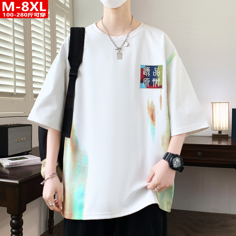여름 유행 홍콩 스타일 남성 인쇄 라운드 넥 반팔 티셔츠 지방 남성 플러스 사이즈 플러스 사이즈 느슨한 캐주얼 티셔츠
