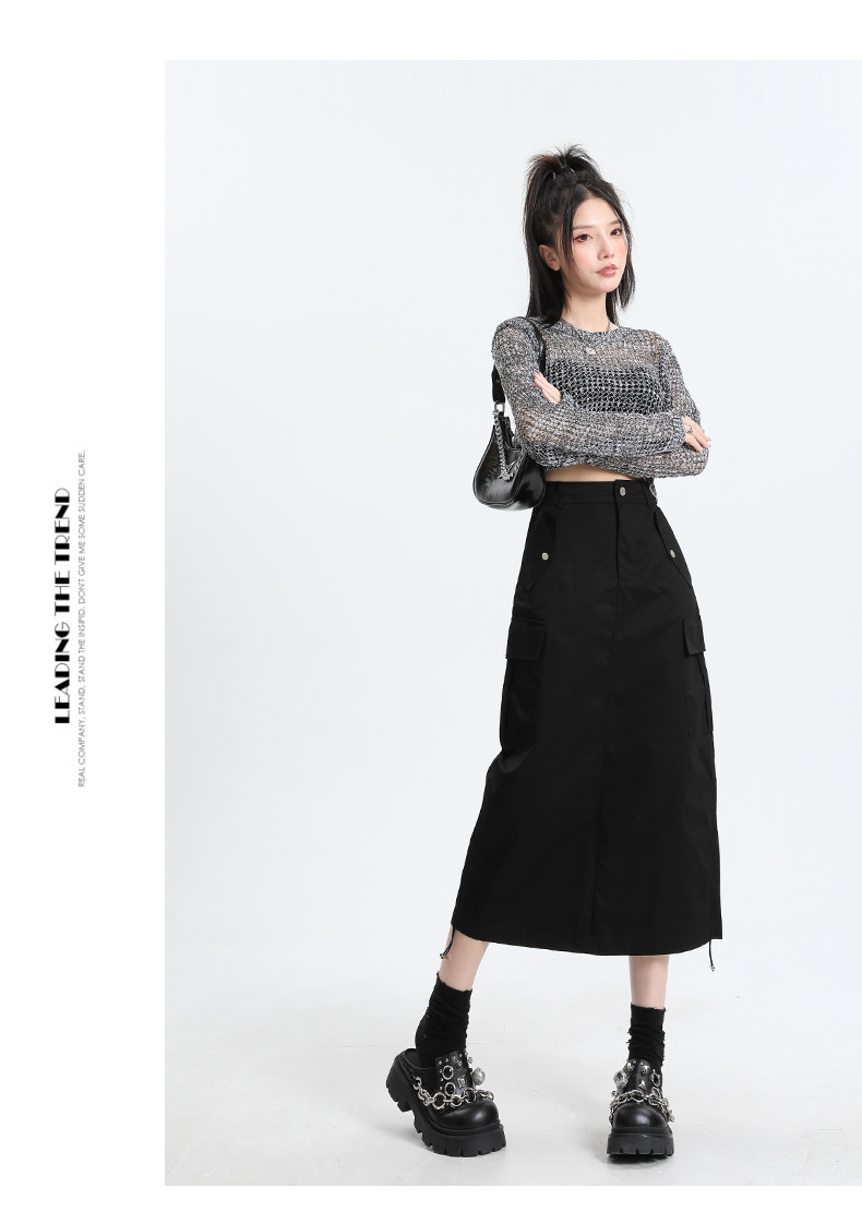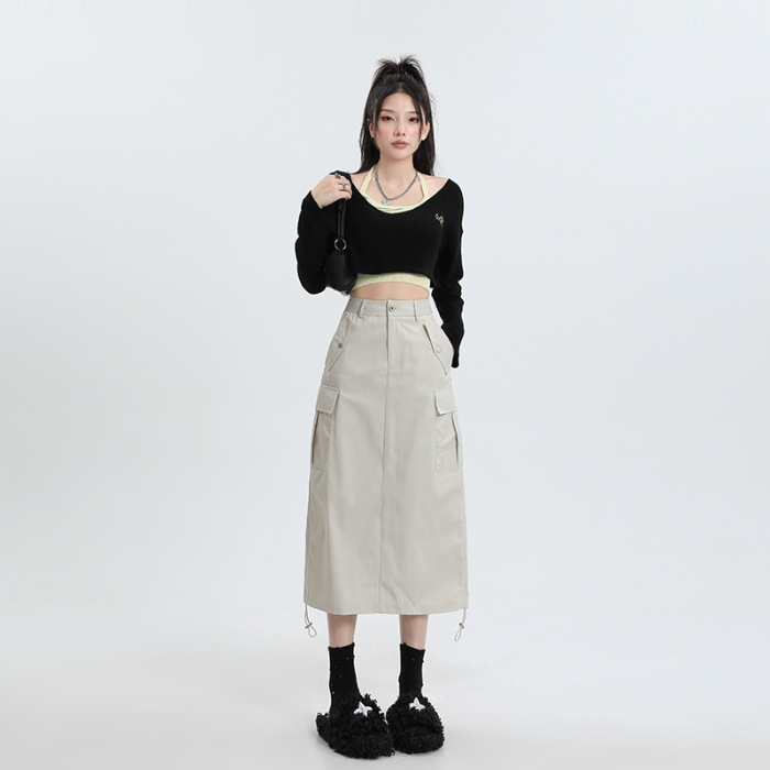 미국 스타일 드로우 스트링 작업복 스커트 여성 및 높은 허리 슬리밍 캐주얼 올 매치 중간 길이 스커트 블랙 살구색 화이트 체닐