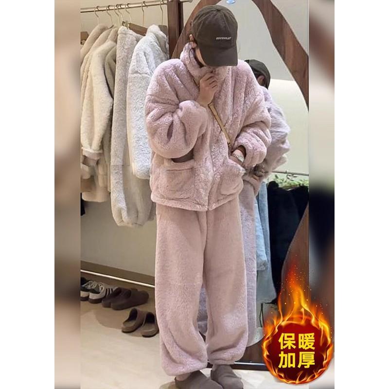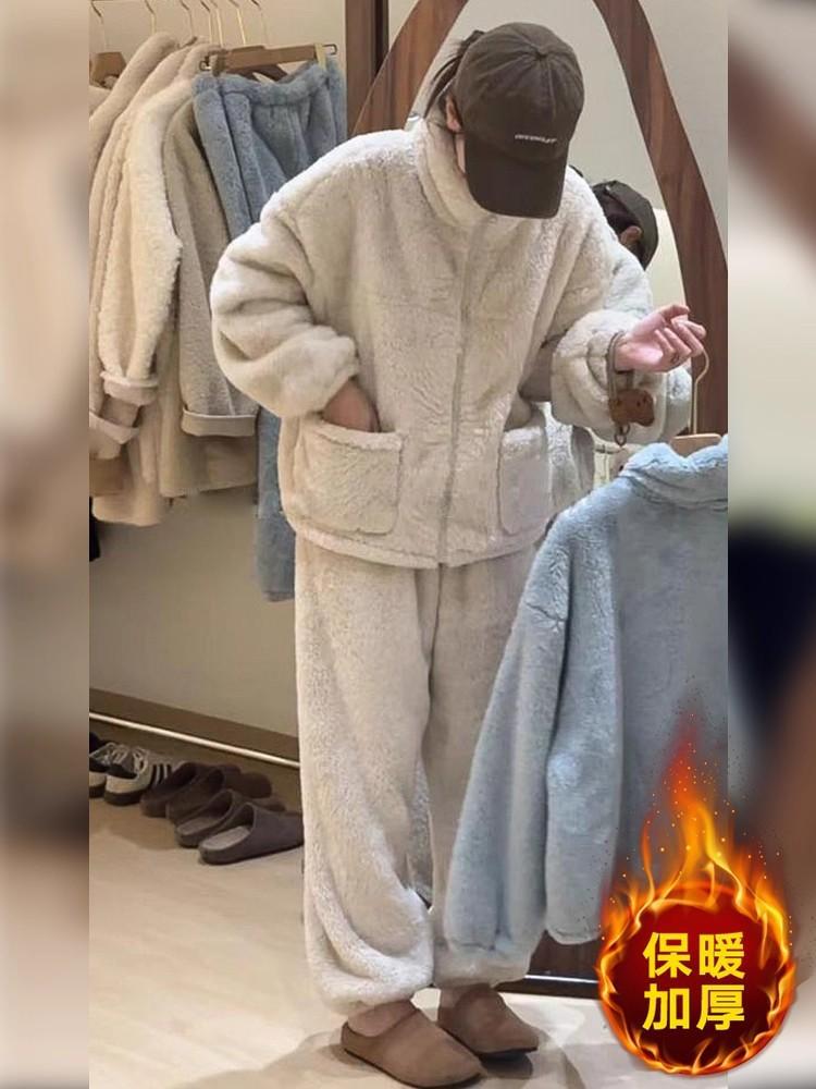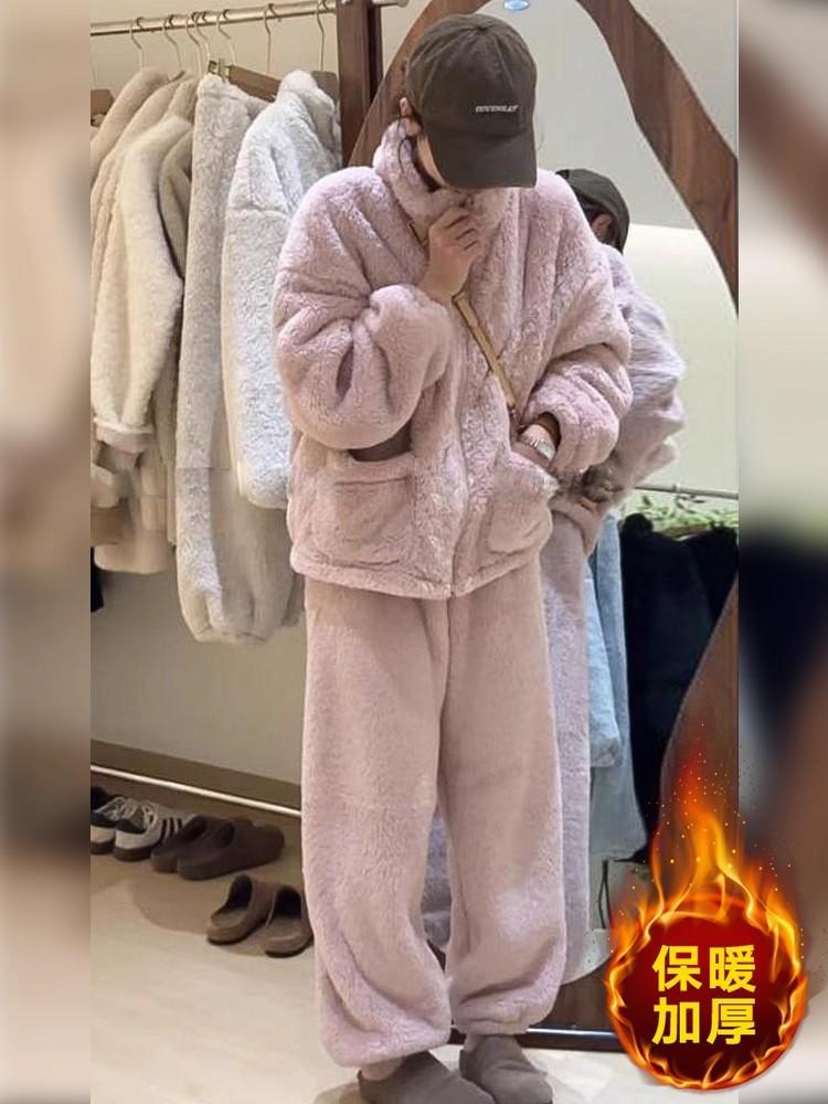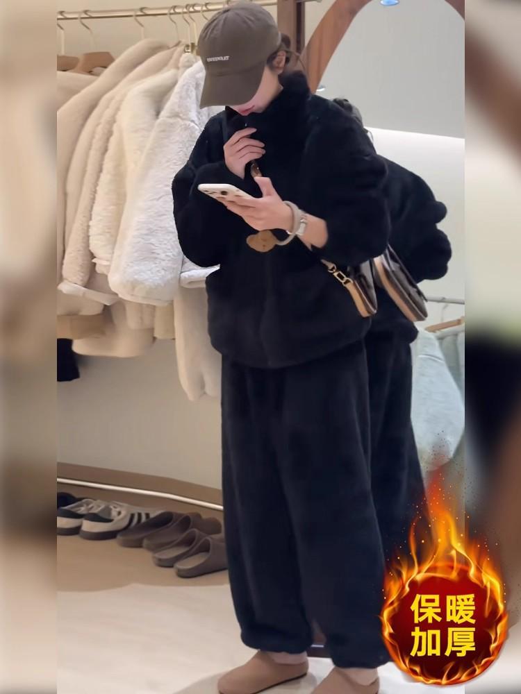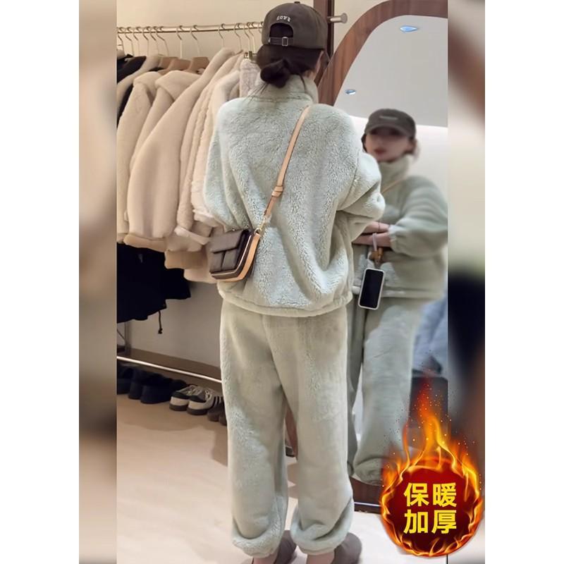 여성용 가을 겨울 코랄 플리스 안감 보온 중간 두께 세트 지퍼 캐주얼 홈웨어 외출 가능 커플용 하이넥스토어 가기