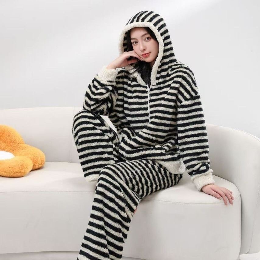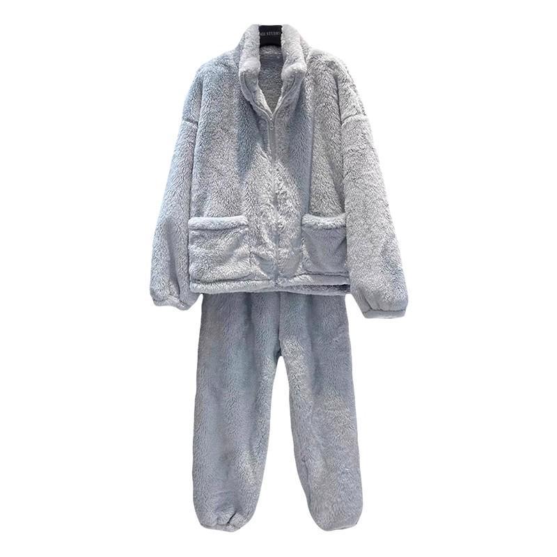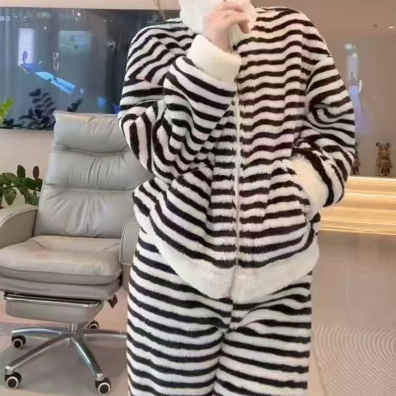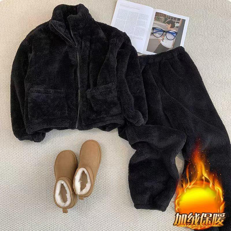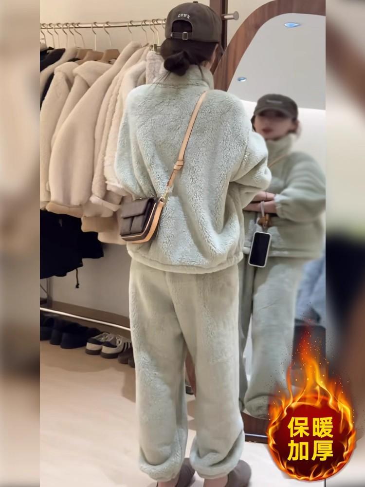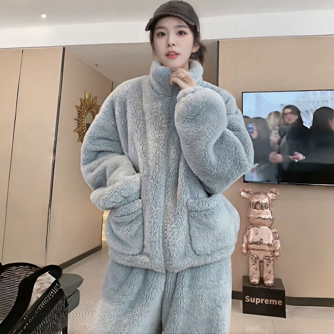 여성용 가을 겨울 코랄 플리스 안감 보온 중간 두께 세트 지퍼 캐주얼 홈웨어 외출 가능 커플용 하이넥스토어 가기