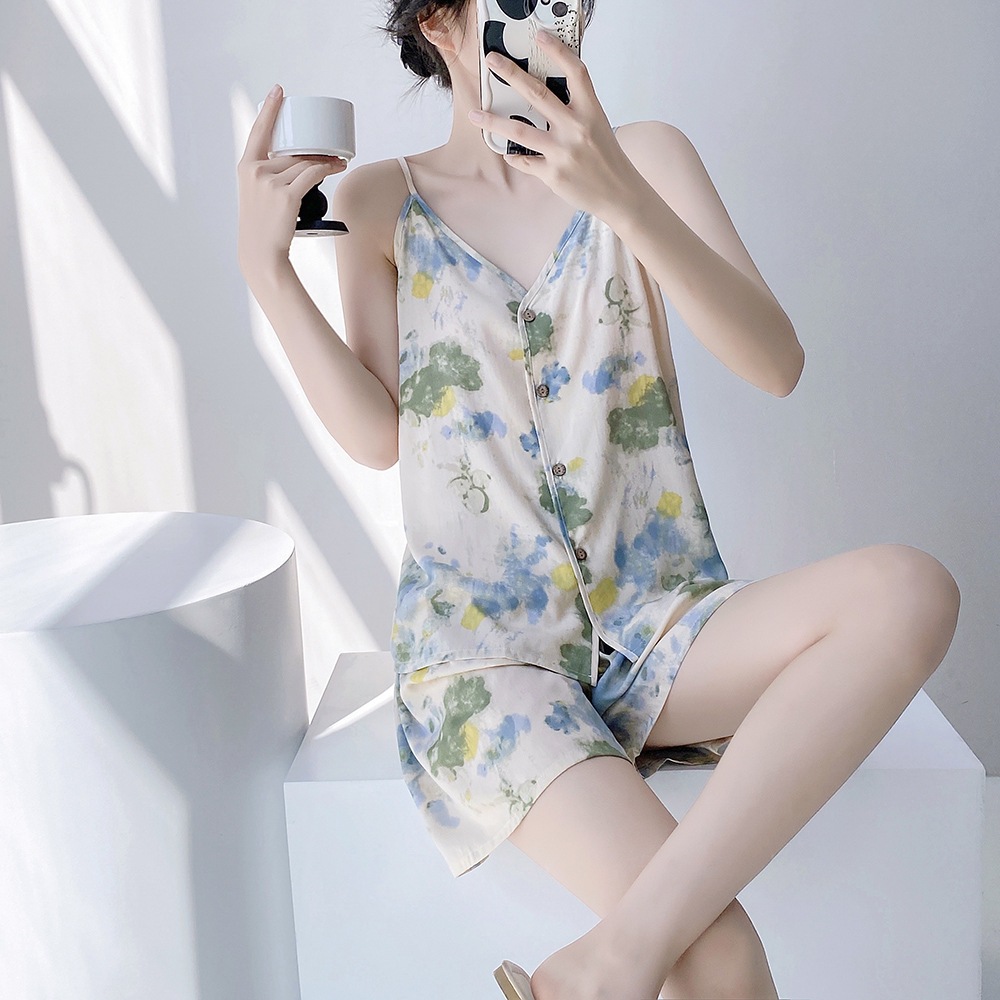 잉크 싱크 슬링 코튼 실크 파자마 여성 해변 휴가 2024 여름 새로운 중국 스타일 국가 스타일 면 실크 세트