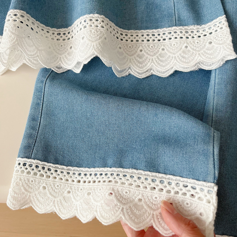 한국 스타일 걸스 데님 세트 여름 새 2024 어린이 레이스 민소매 조끼 바지 투피스 트렌디 세트스토어 가기